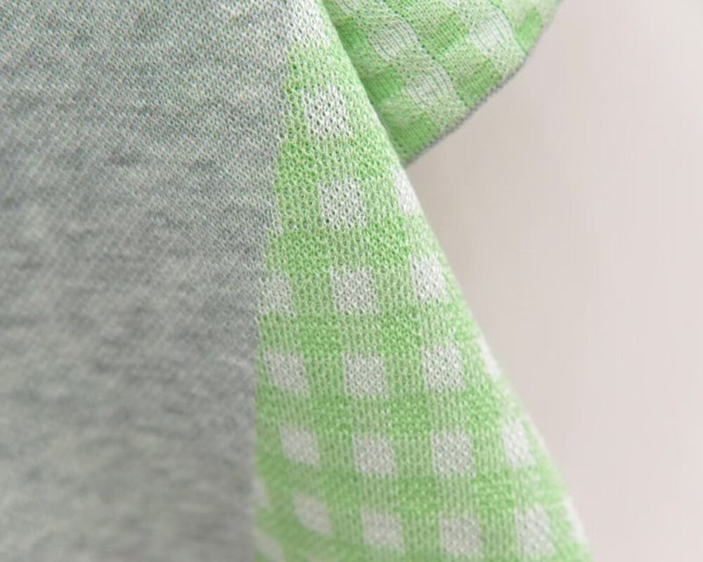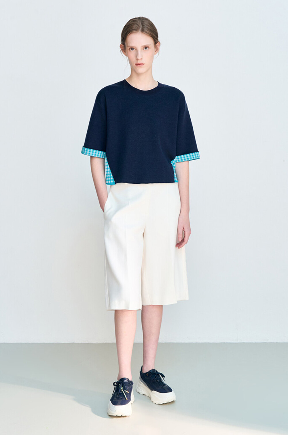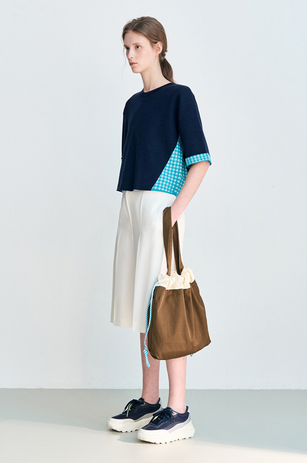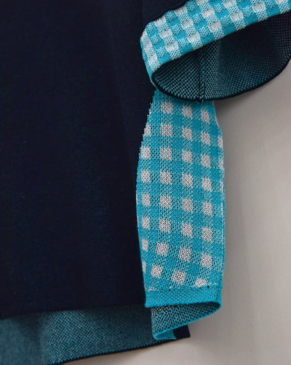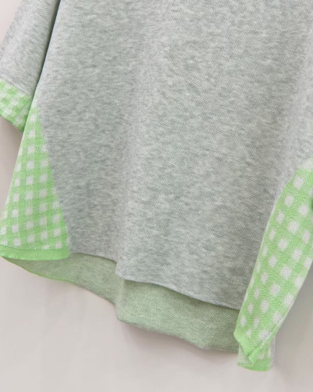 - 허리 양옆과 소맷단 내부에 깅엄 체크 니트 패턴