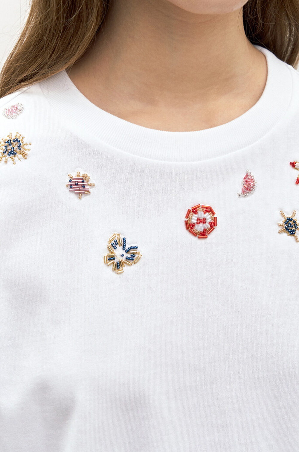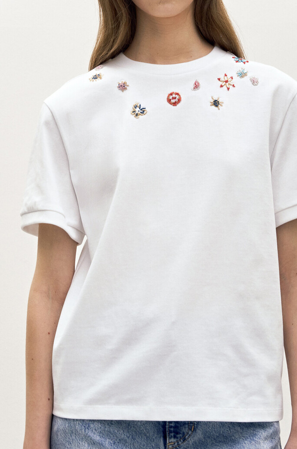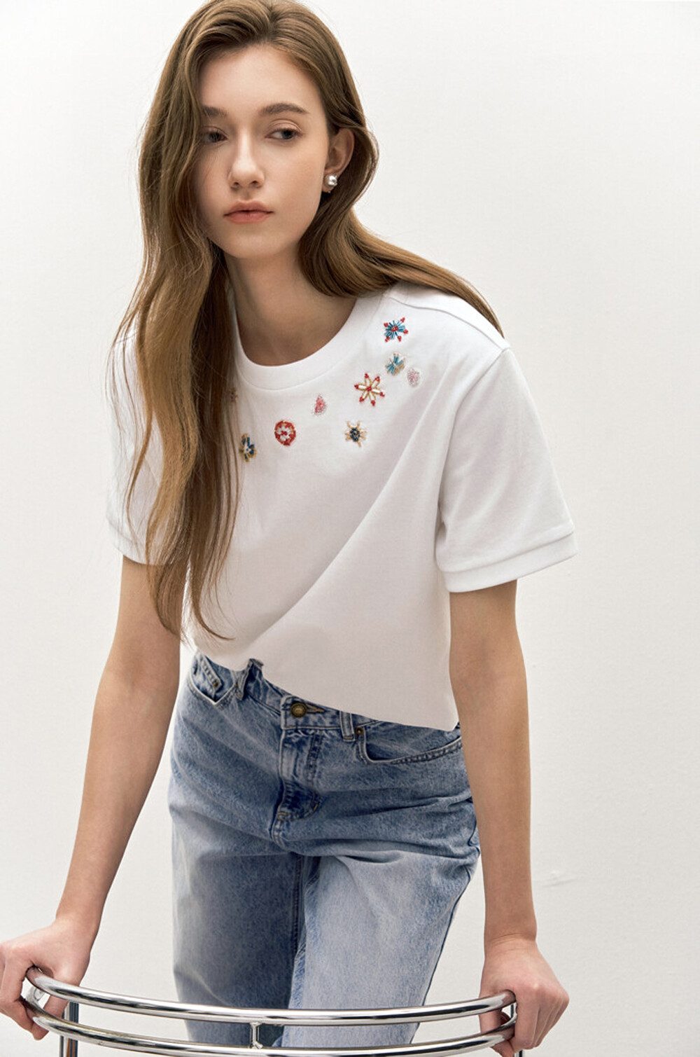- 넥라인 앞면에 꽃 모티브의 비즈 디테일