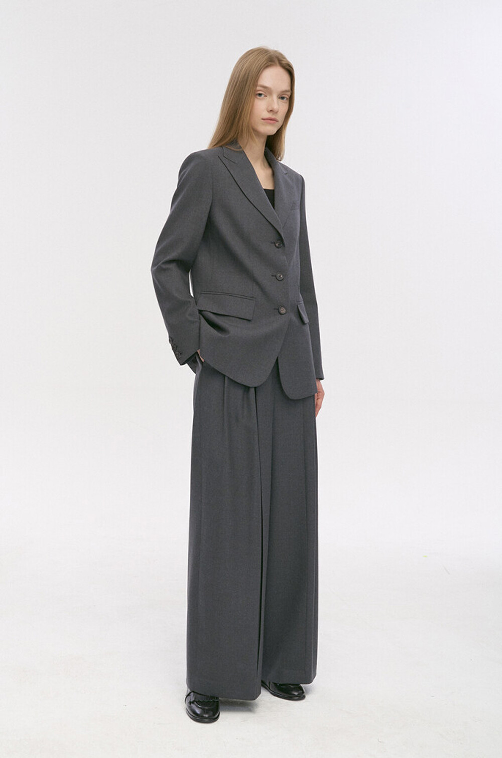 같은 소재의 자켓과 함께 셋업하여