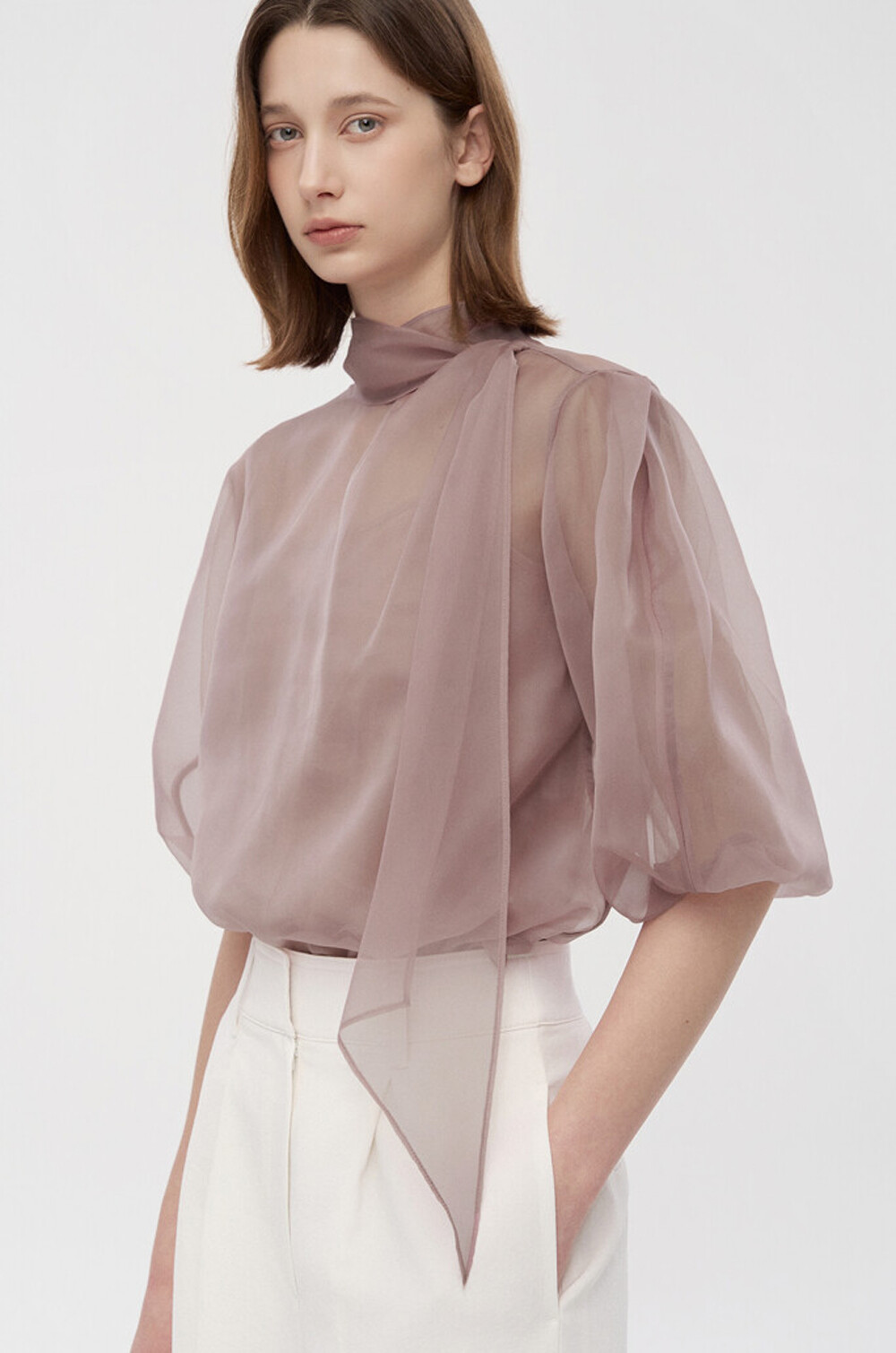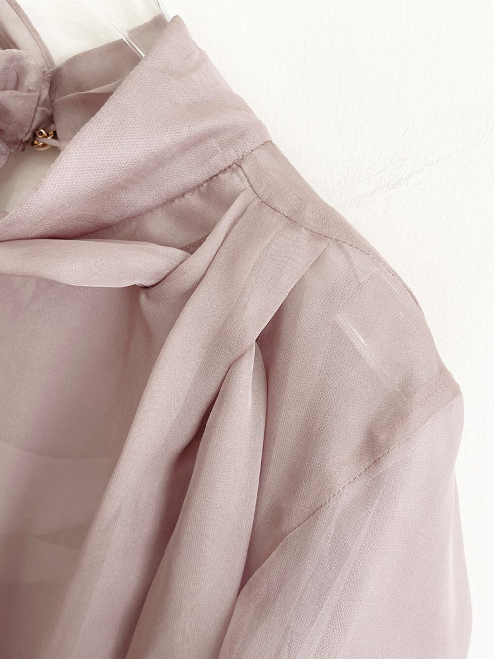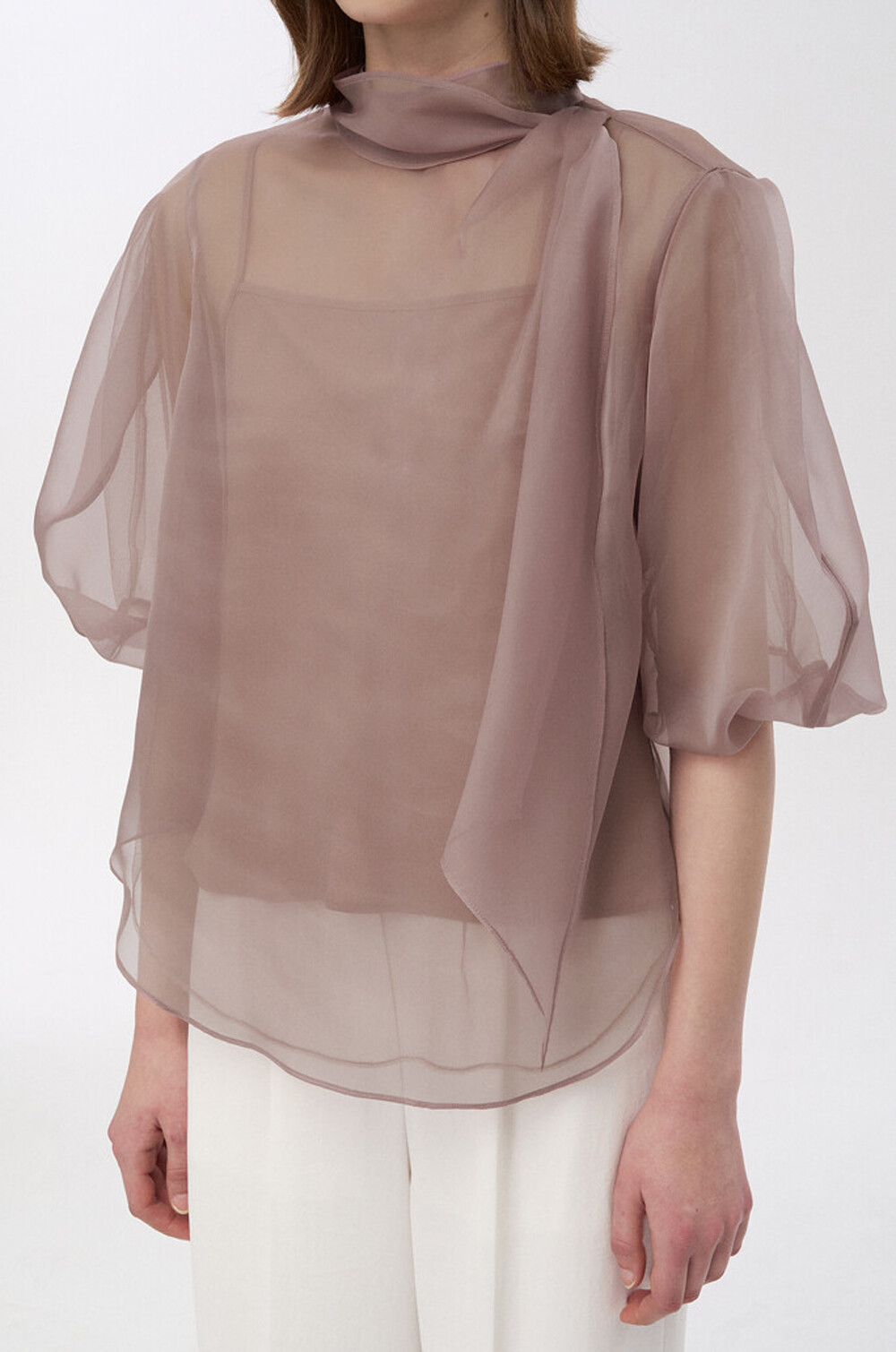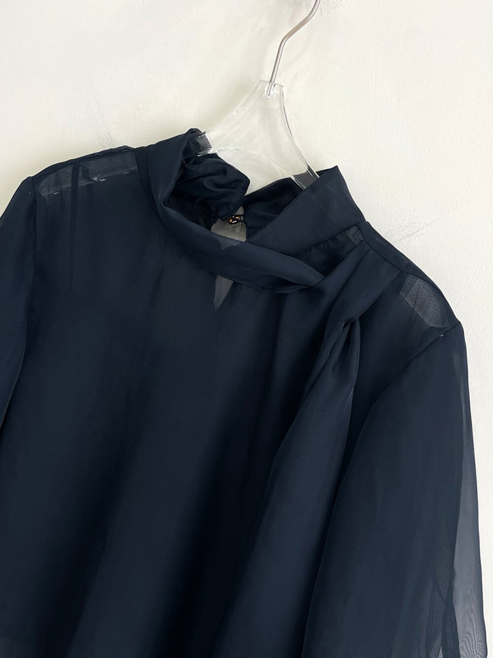 타임 오간자 튤 드레이프 스카프 넥 블라우스