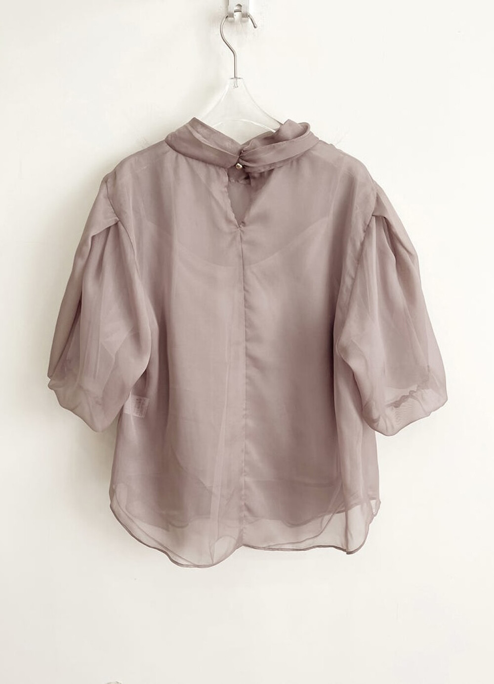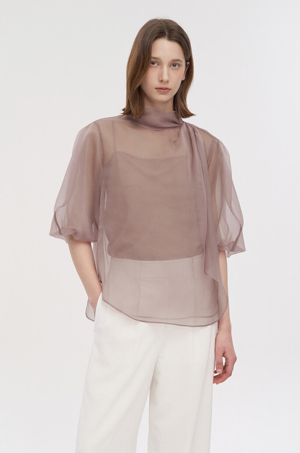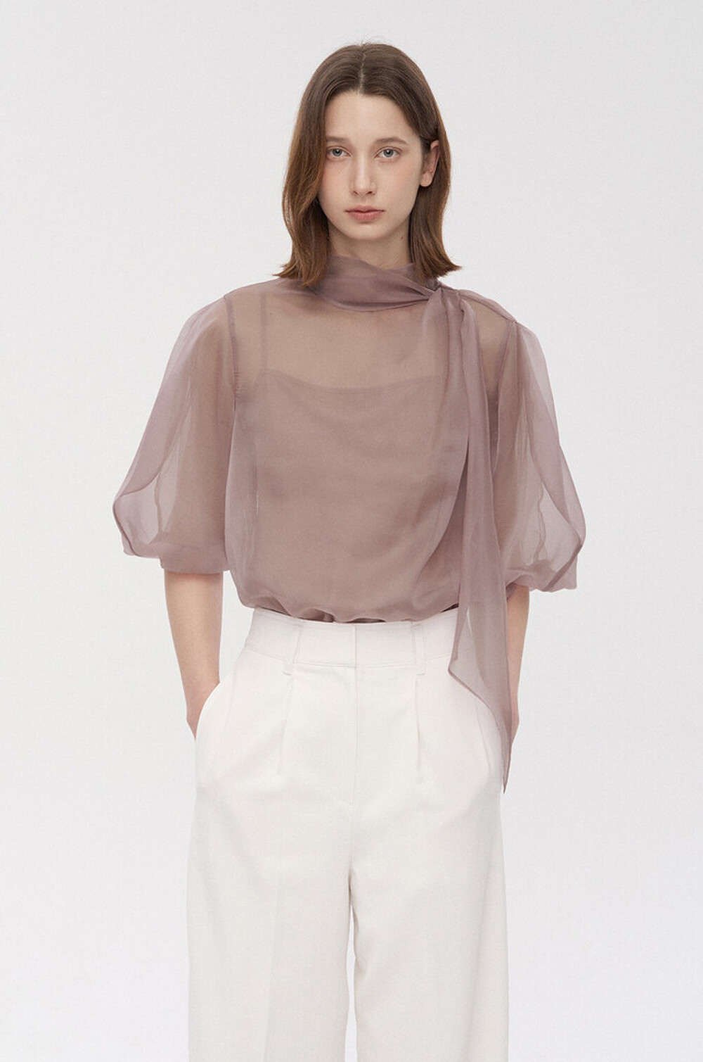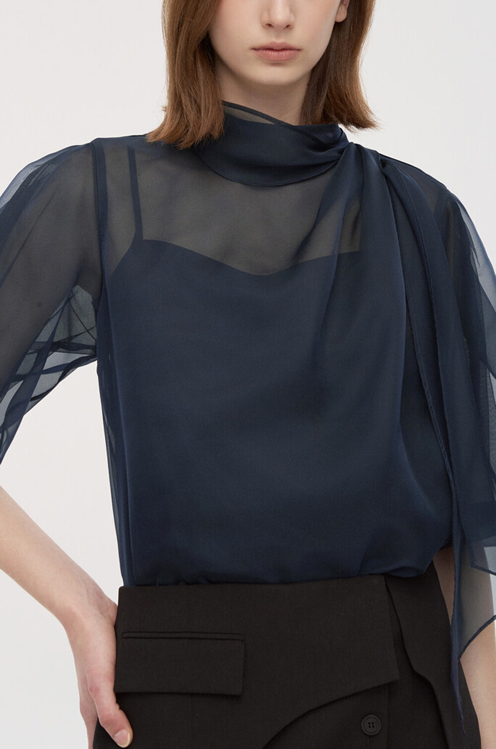 타임 오간자 튤 드레이프 스카프 넥 블라우스