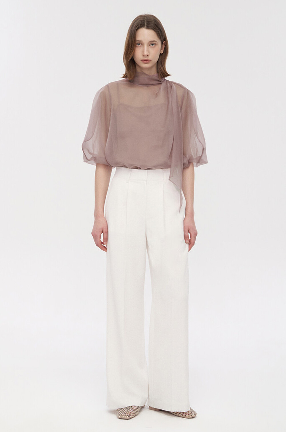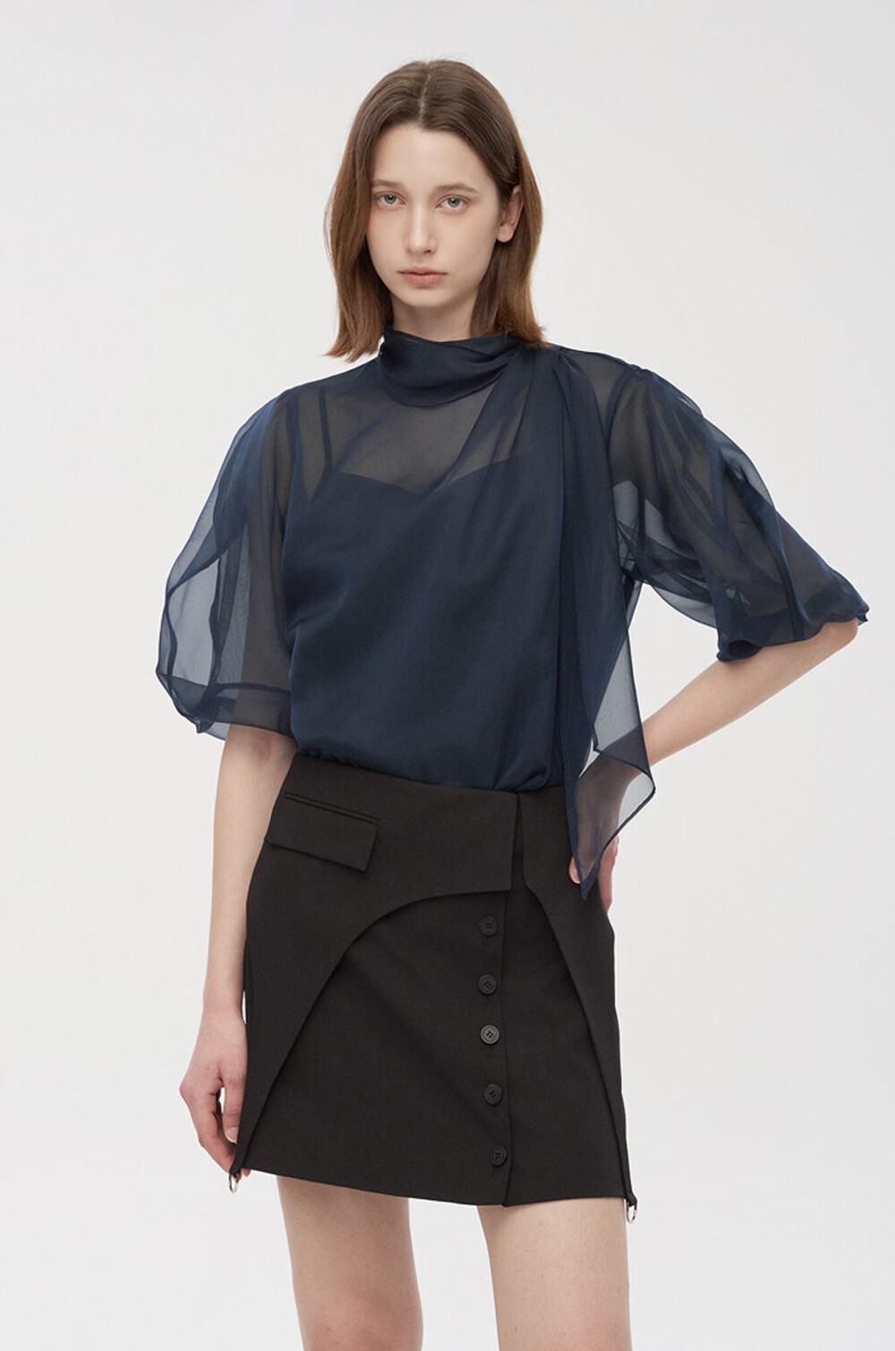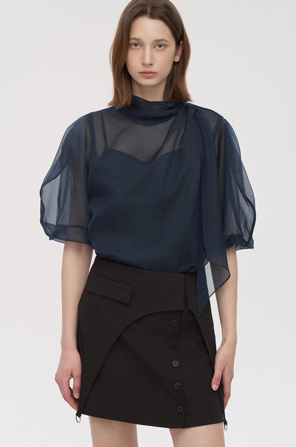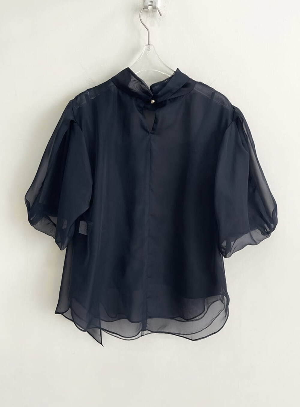 타임 오간자 튤 드레이프 스카프 넥 블라우스