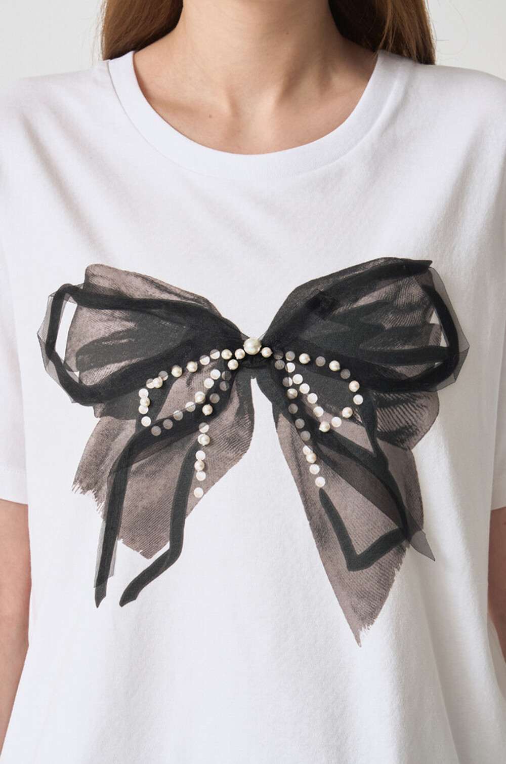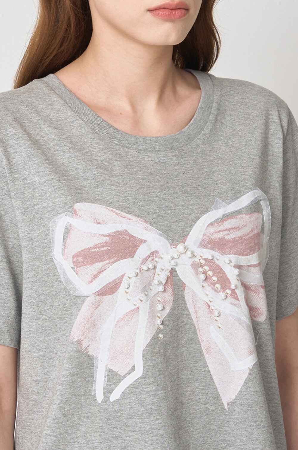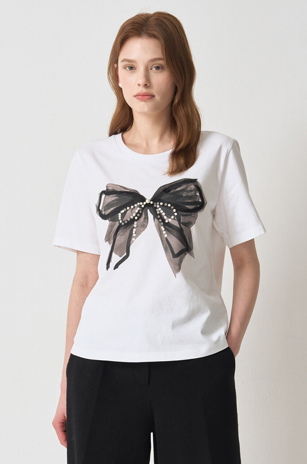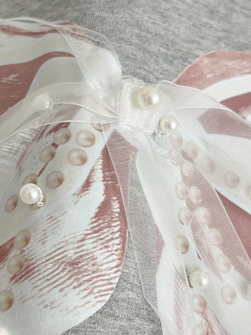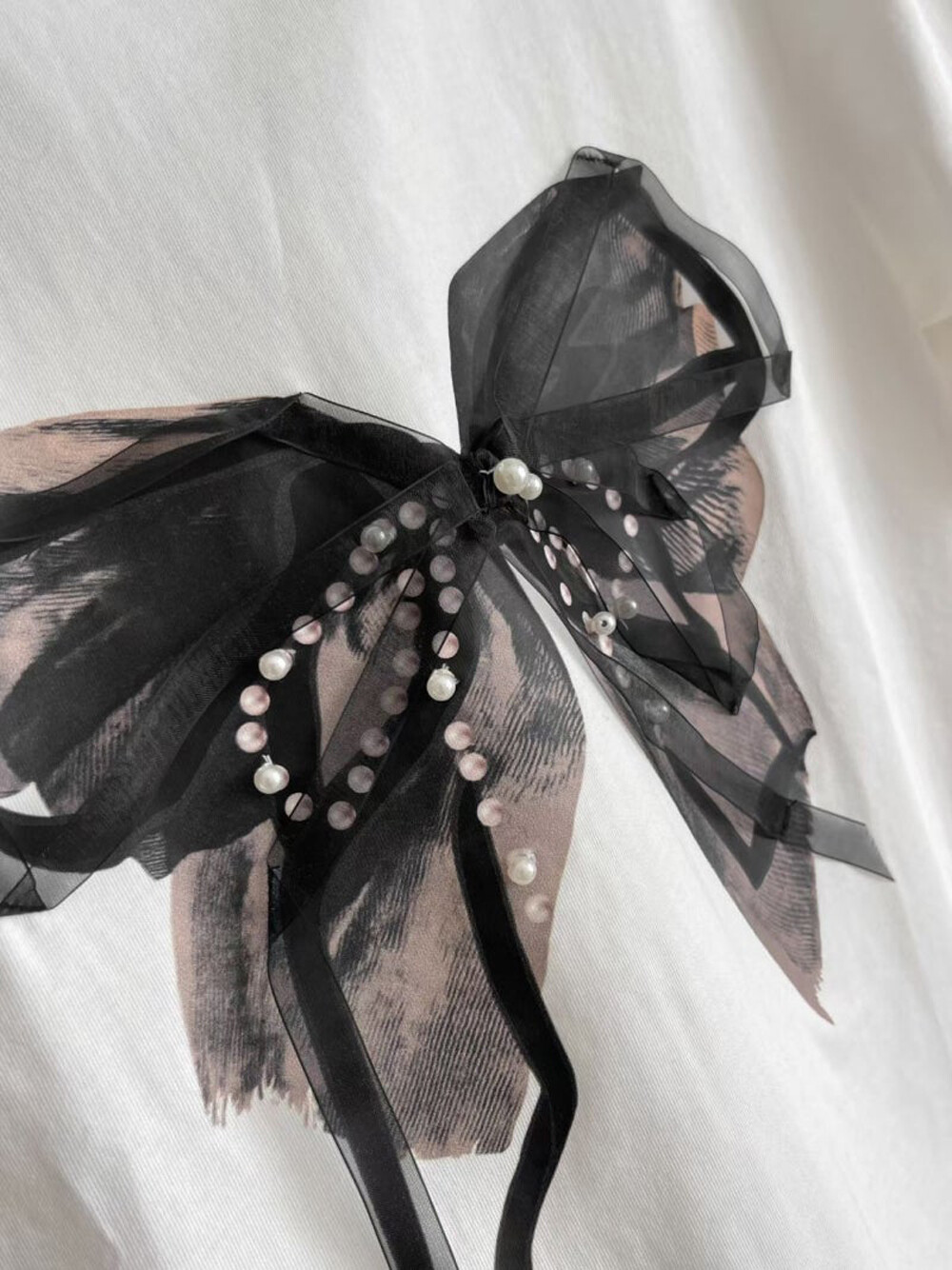 - 가슴 중앙에 프린트와 리본, 펄 장식