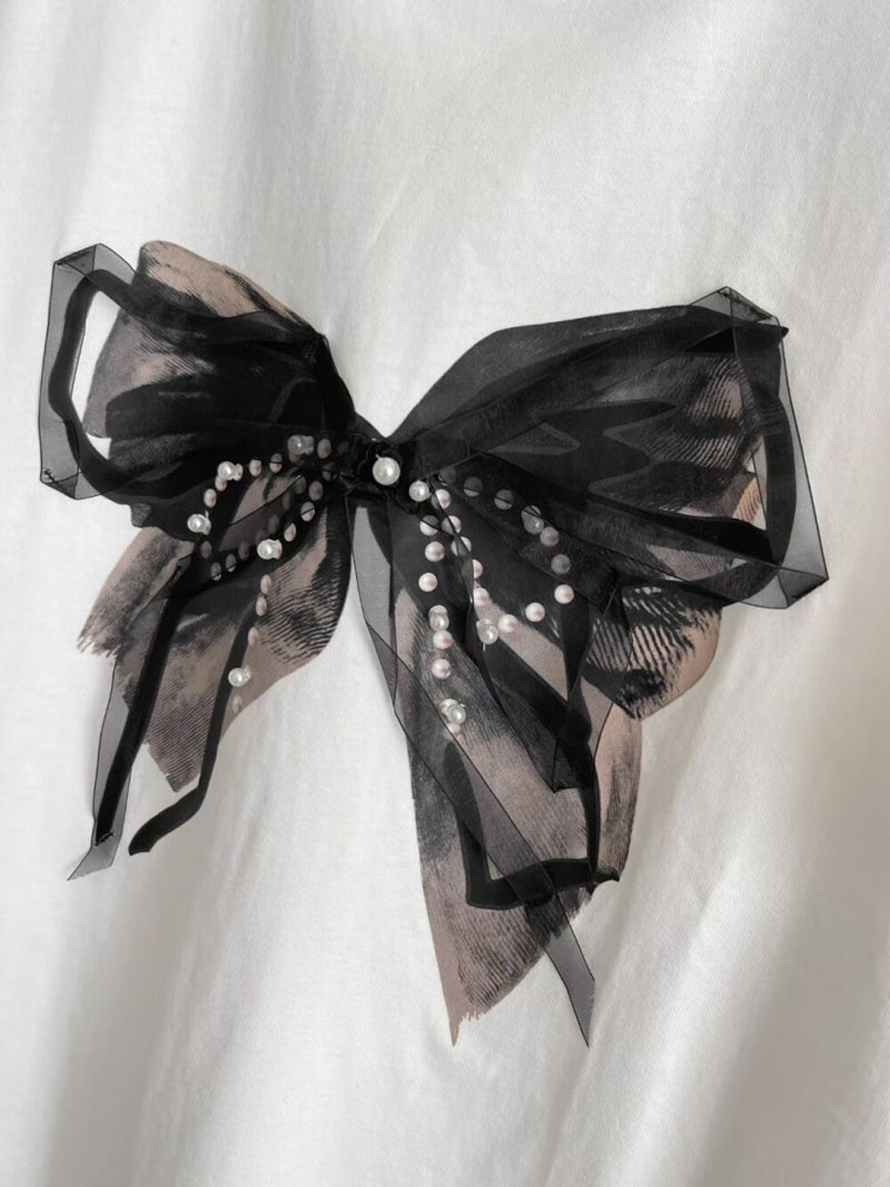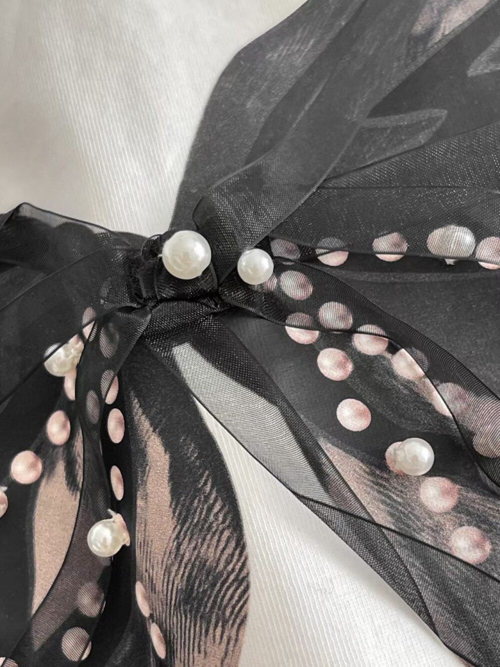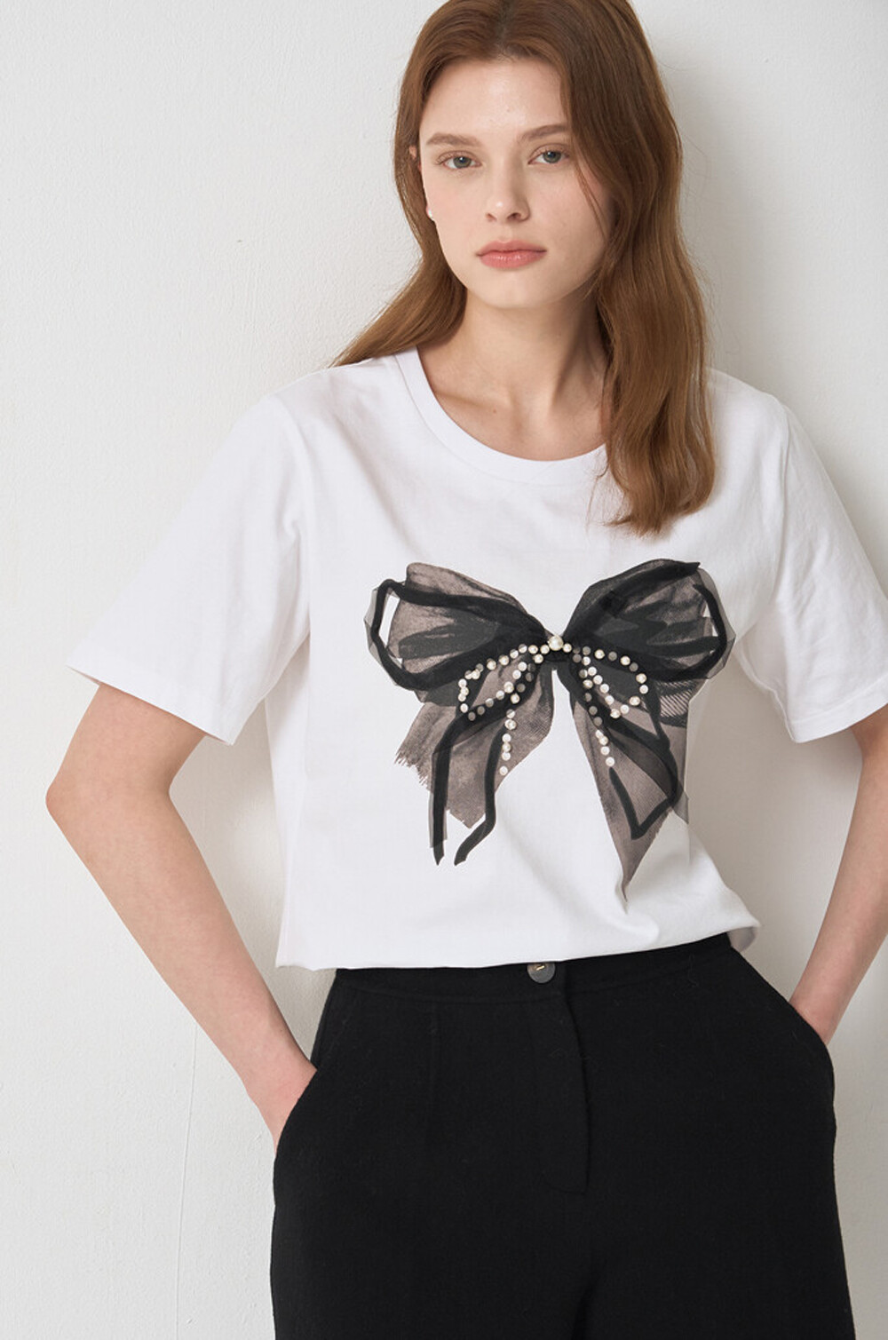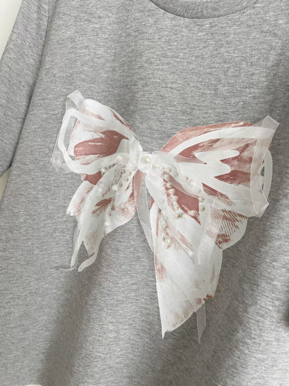 - 가슴 중앙에 프린트와 리본, 펄 장식