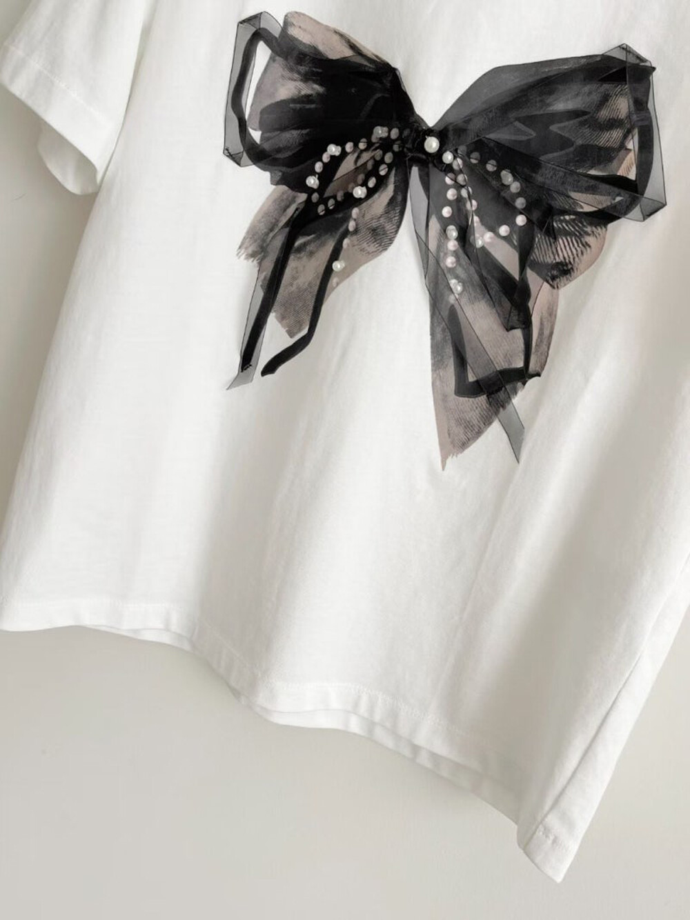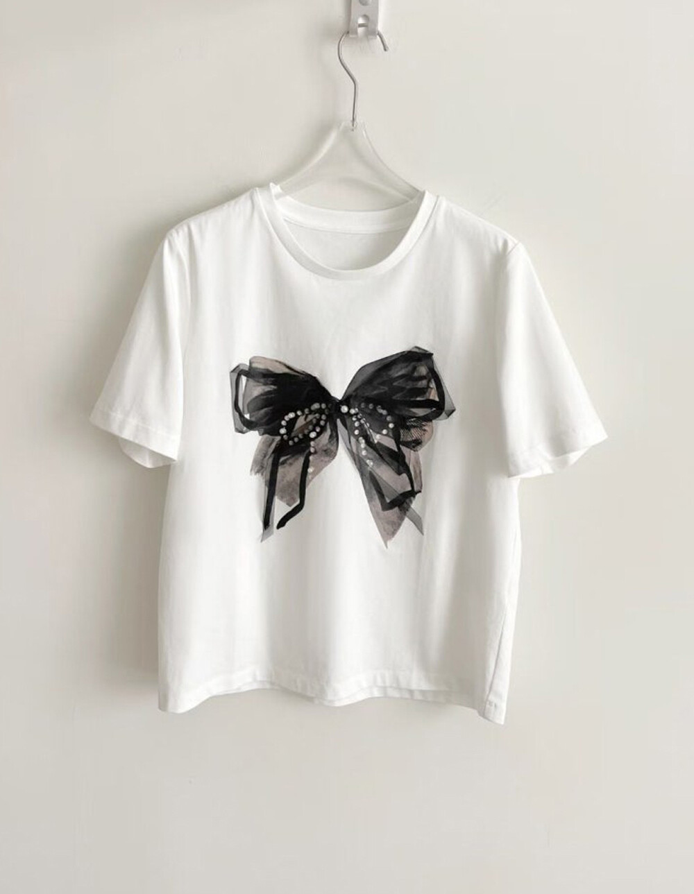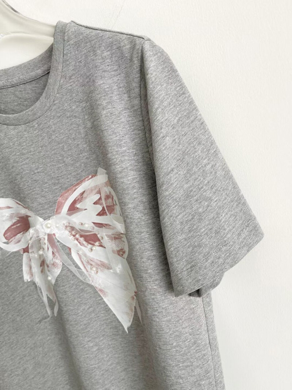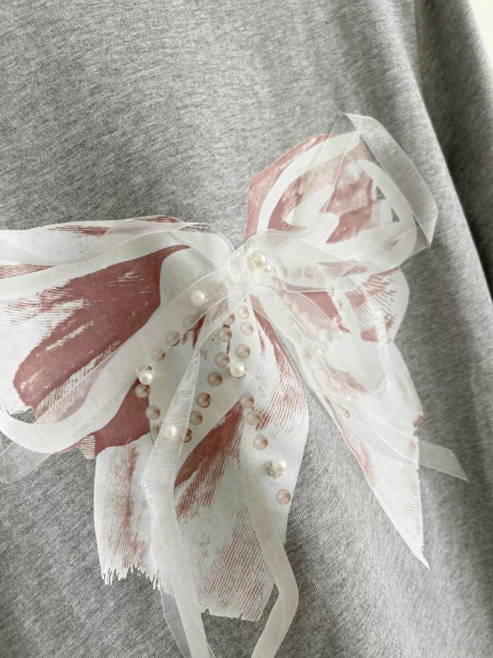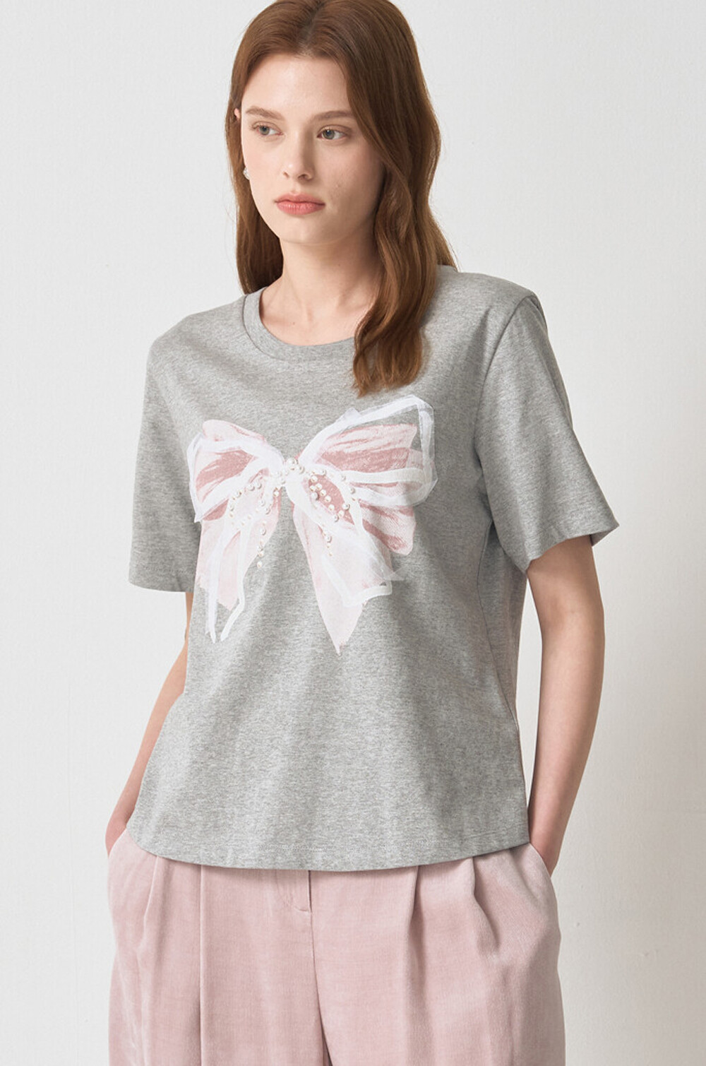 - 가슴 중앙에 프린트와 리본, 펄 장식
