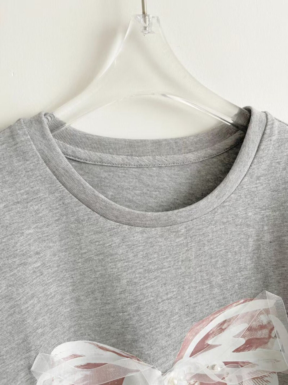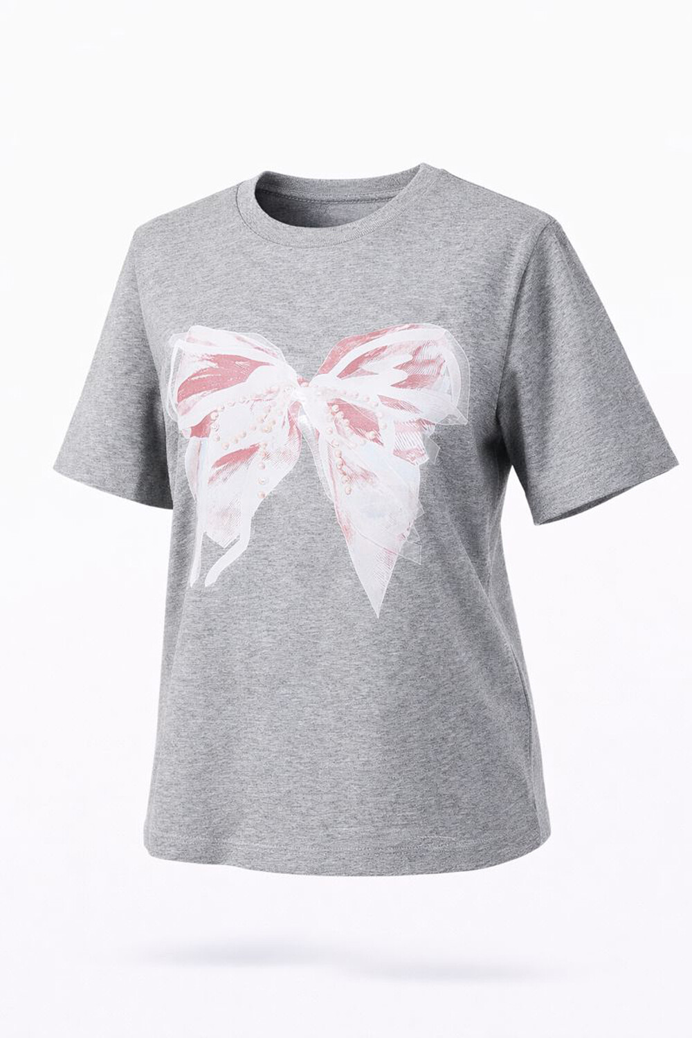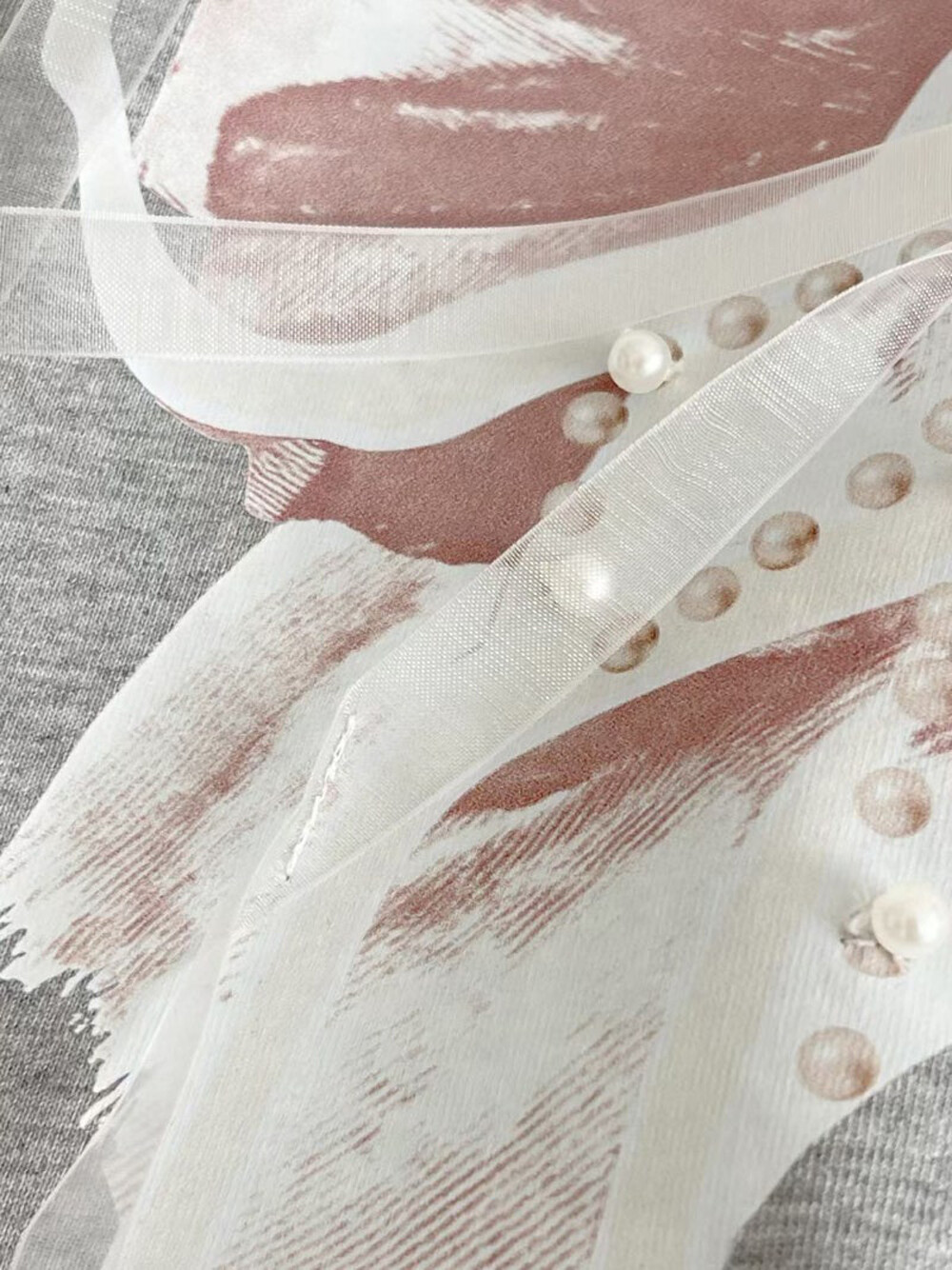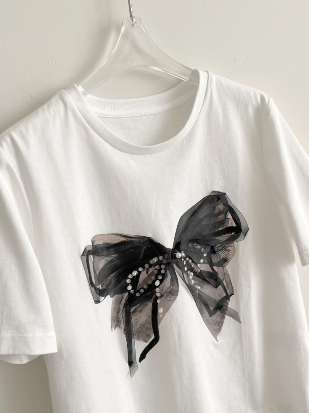 - 가슴 중앙에 프린트와 리본, 펄 장식
