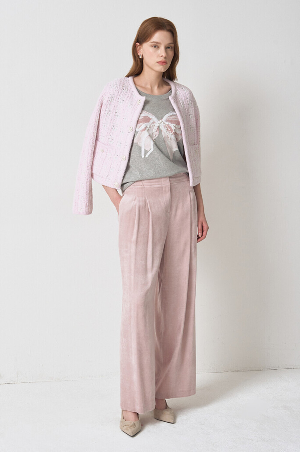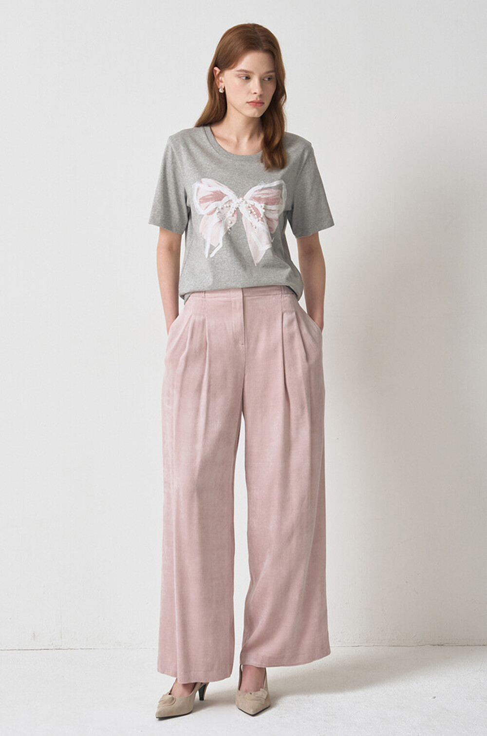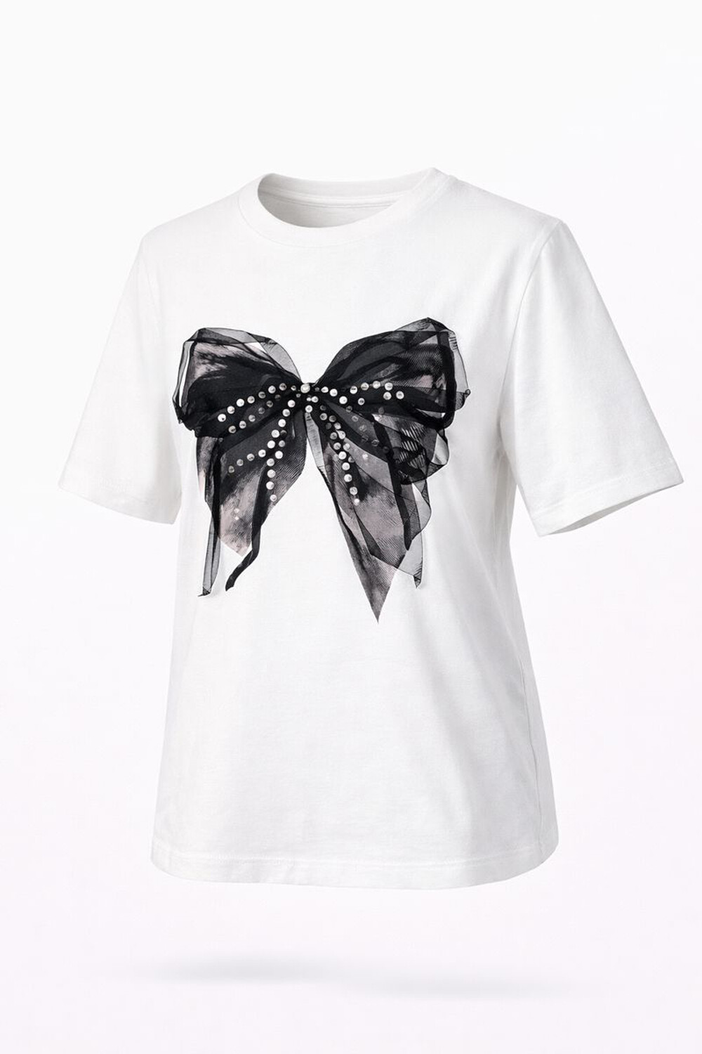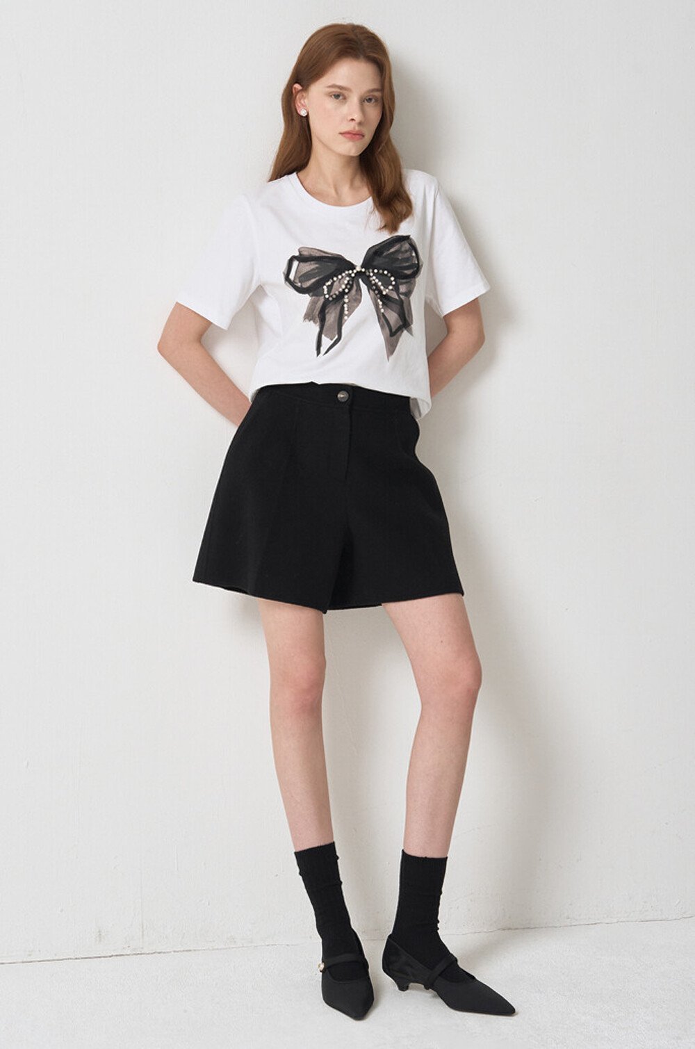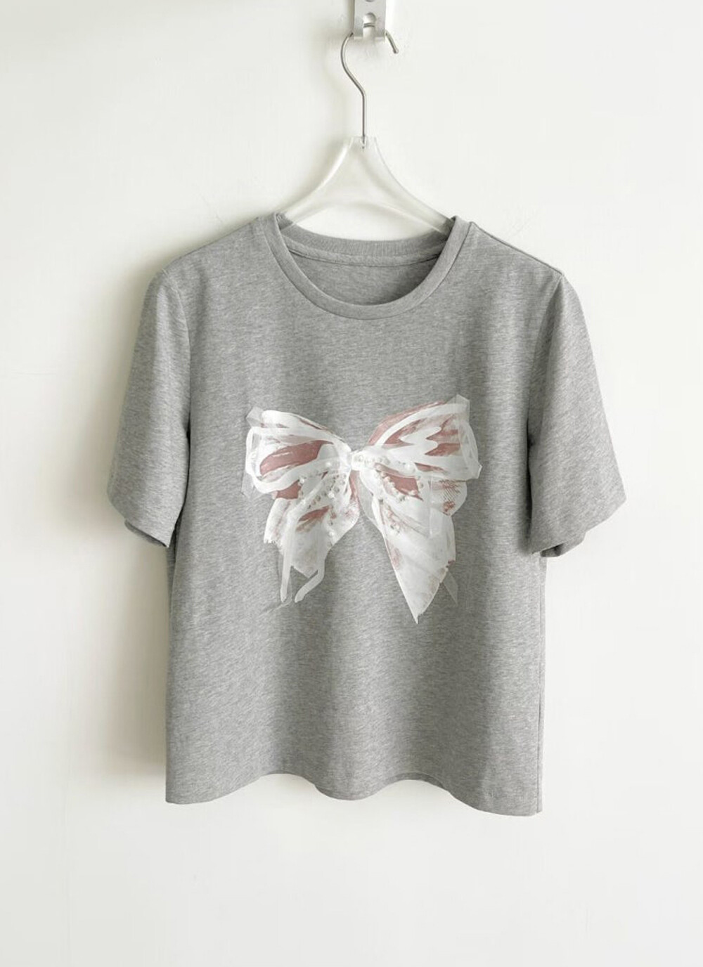 - 가슴 중앙에 프린트와 리본, 펄 장식