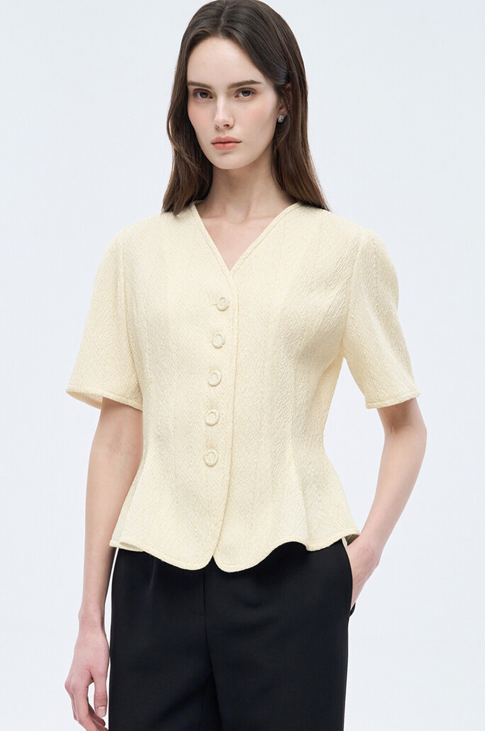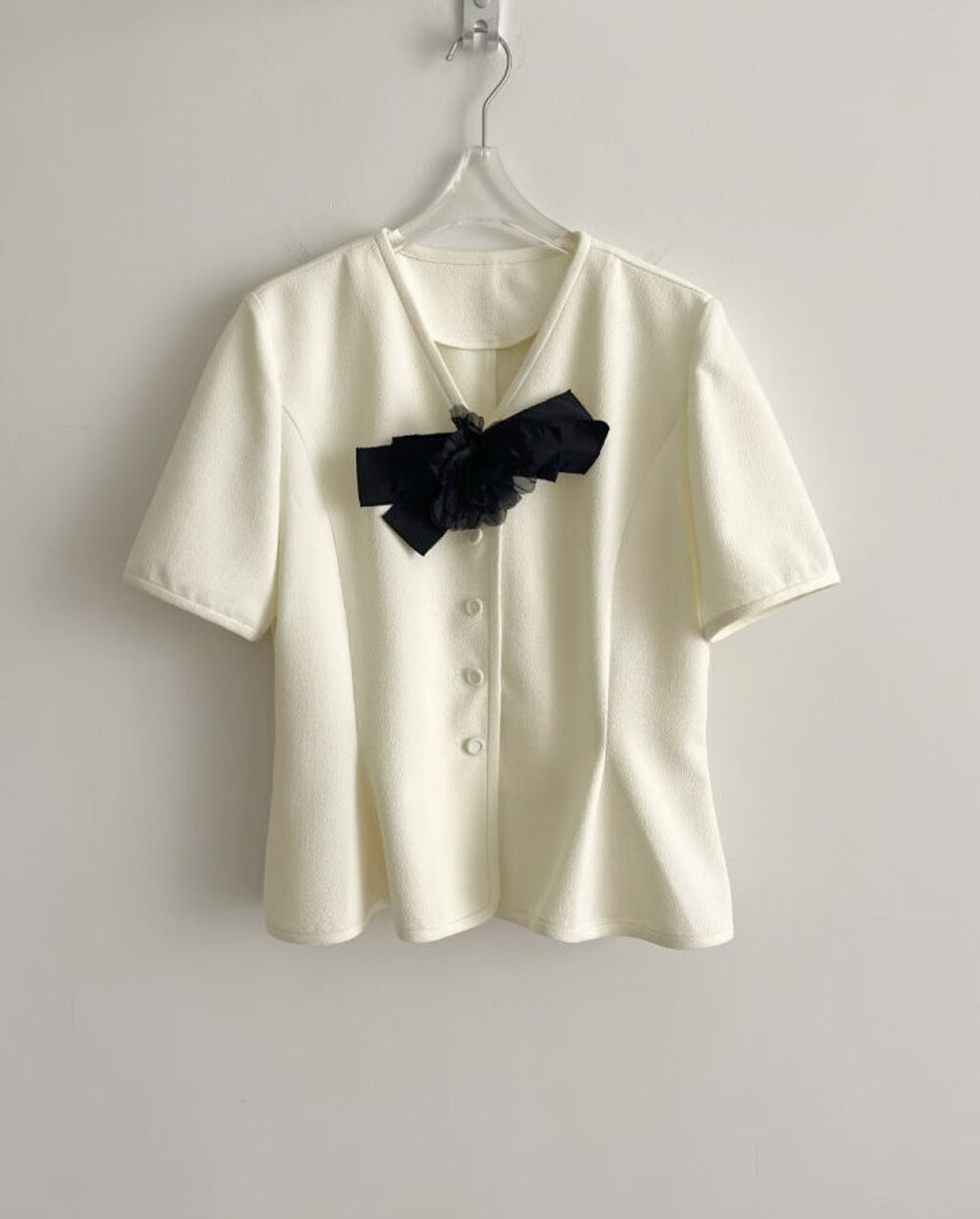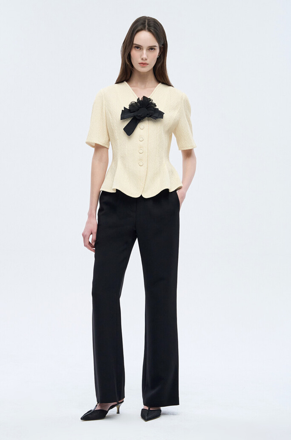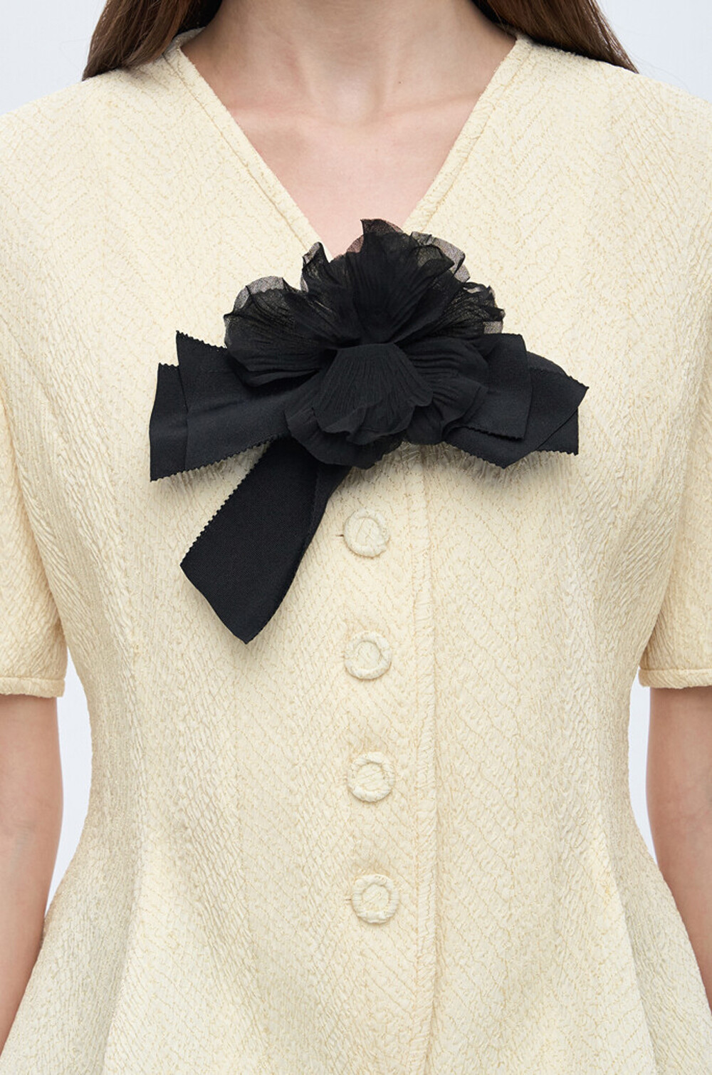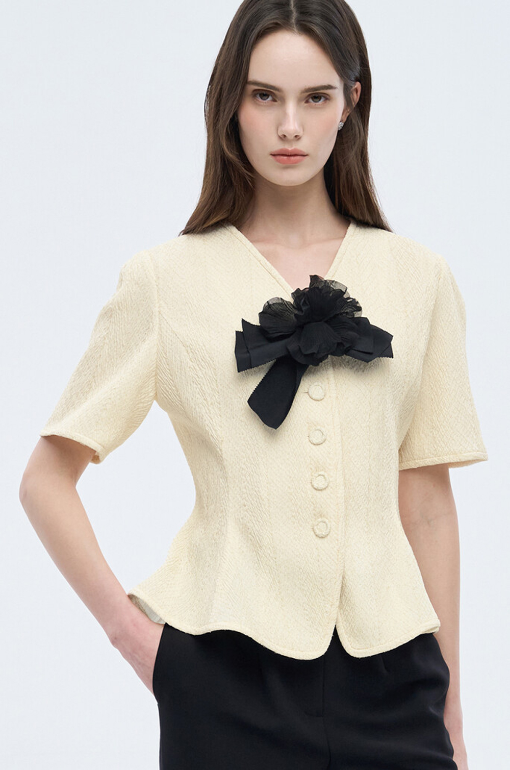 오브제 텍스처드 페플럼 헴 블라우스 & 플라워 브로치