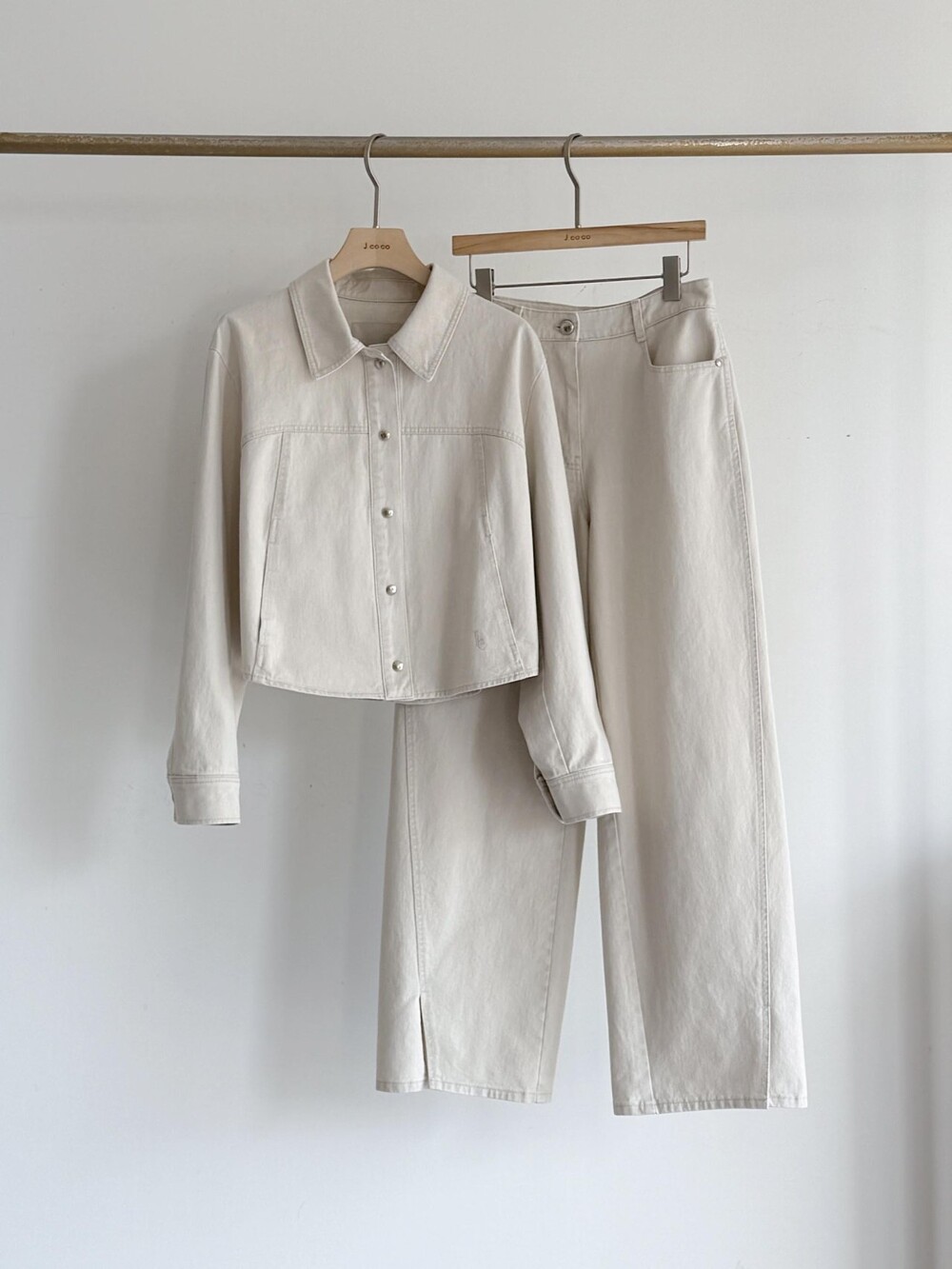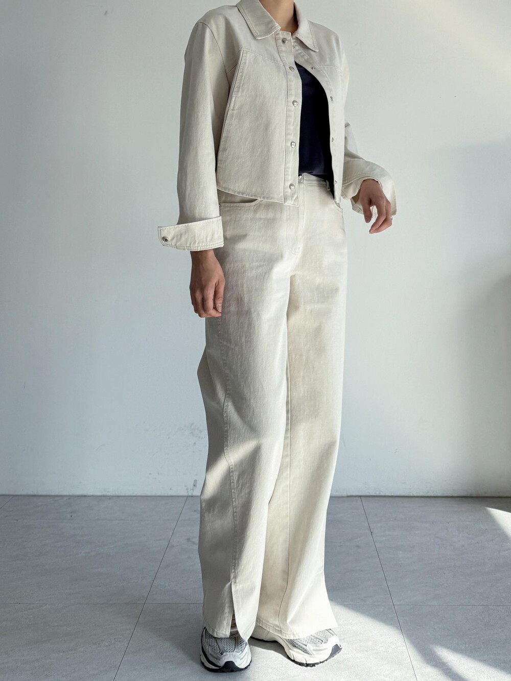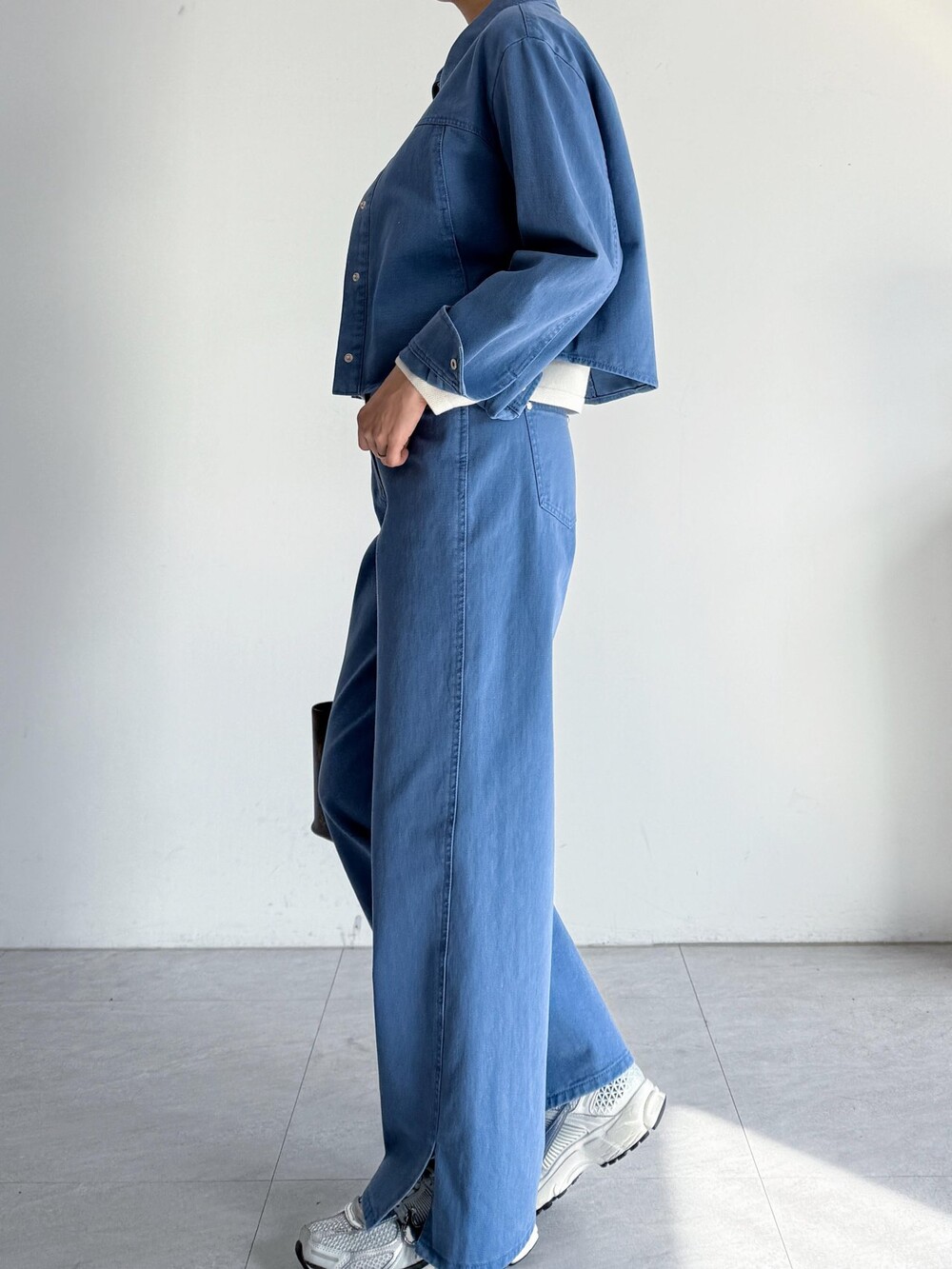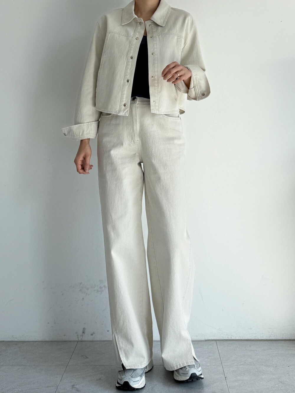 동일 소재 사이드 슬릿 헴 팬츠와