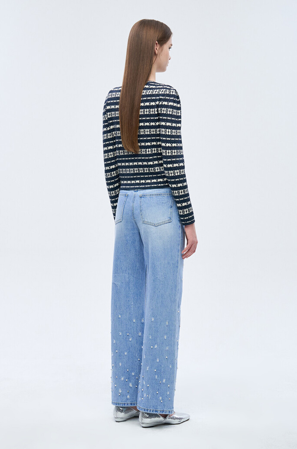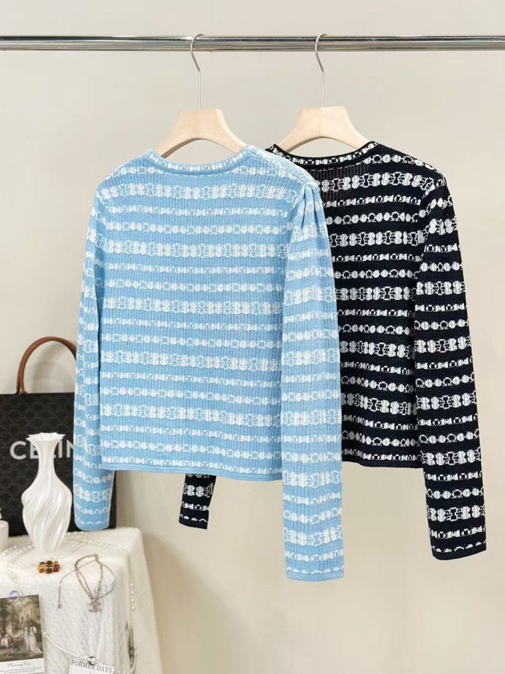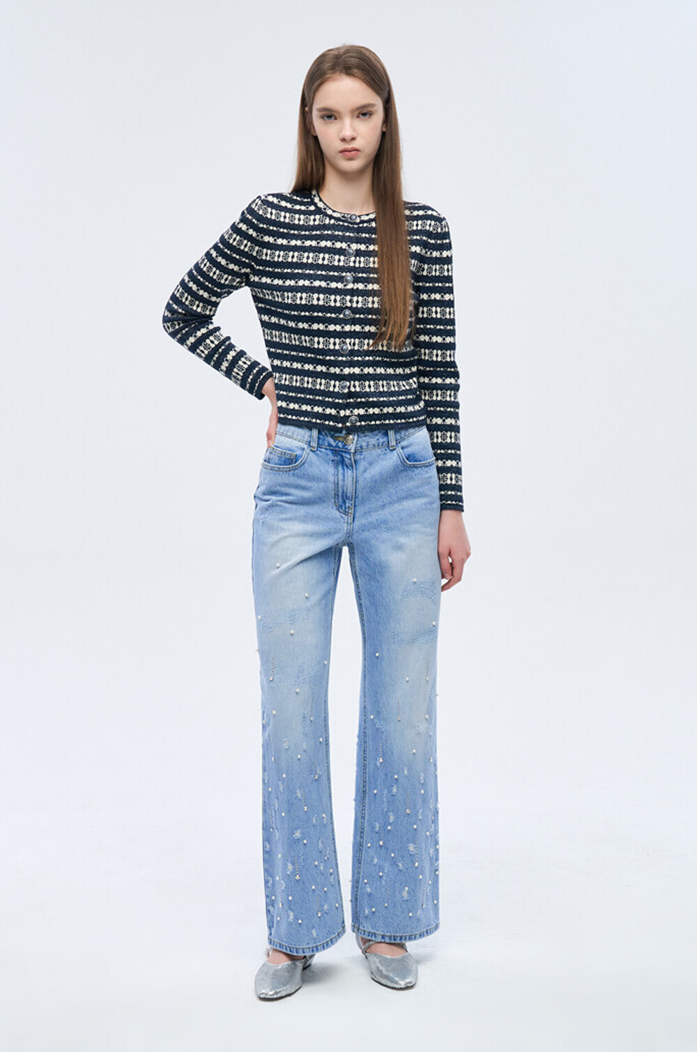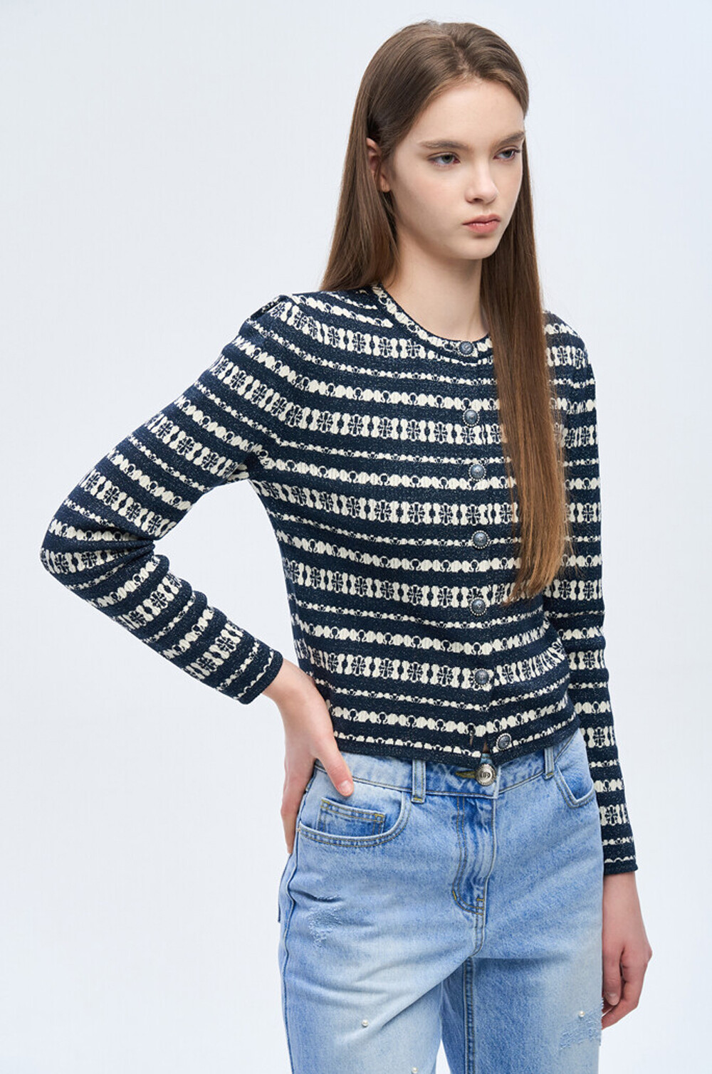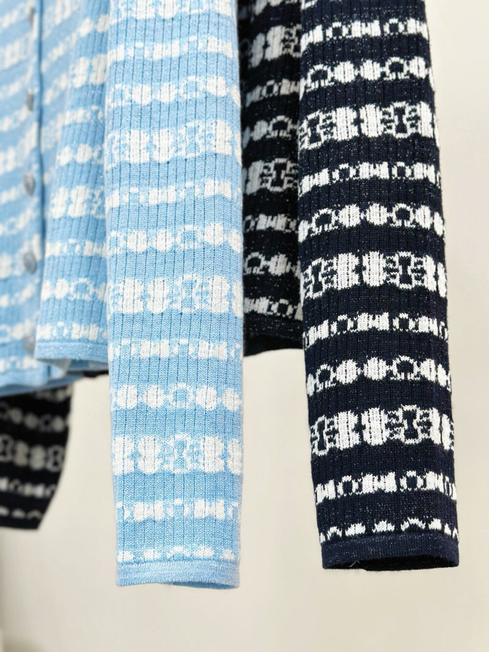 오브제 리브드 글리터 스트라이프 니트 가디건