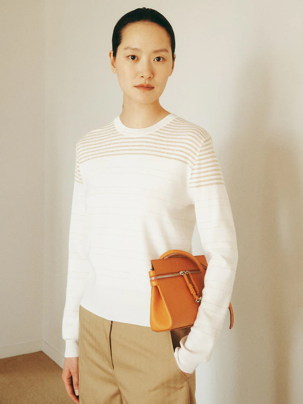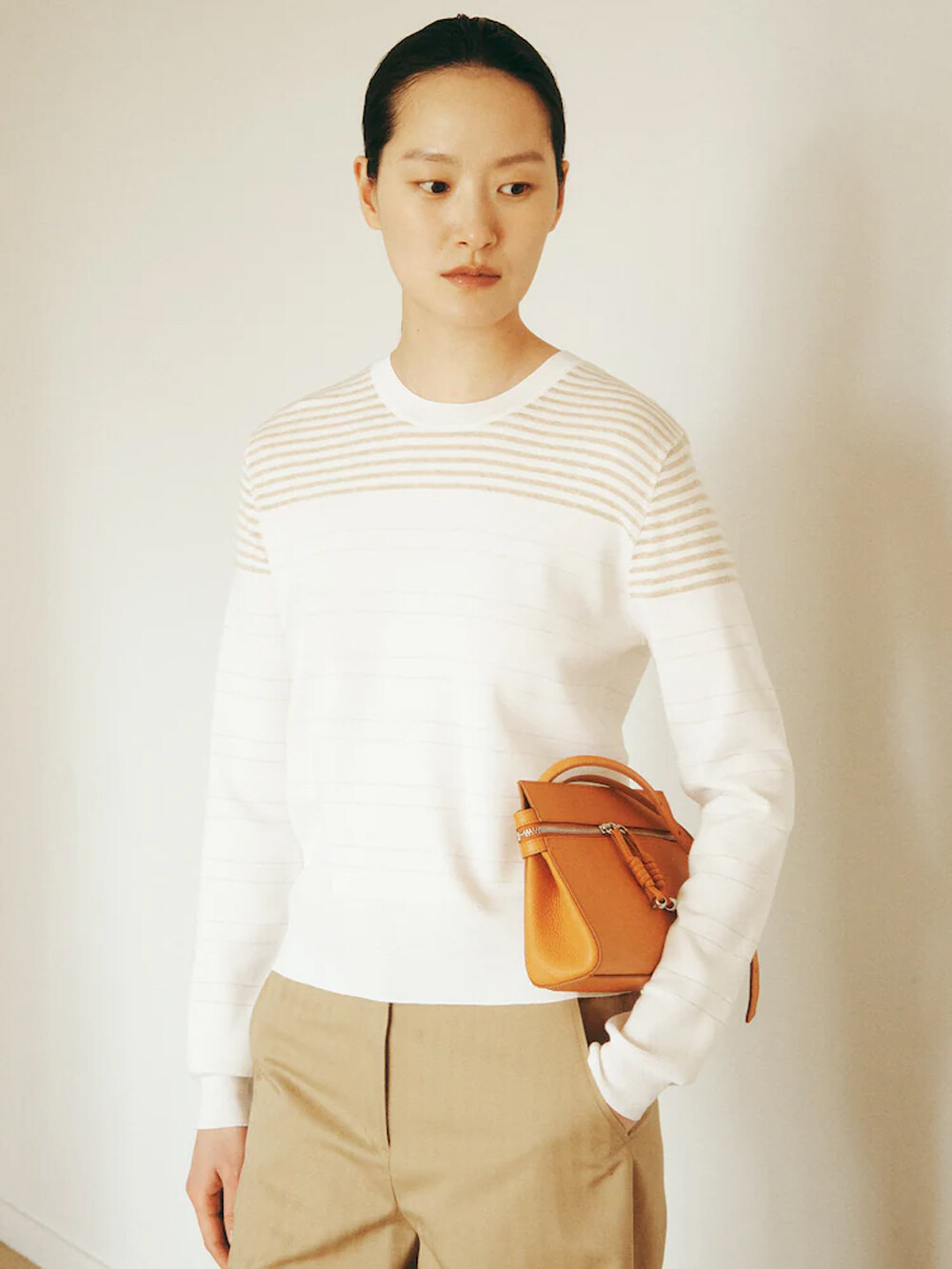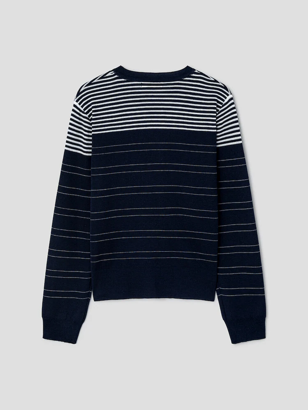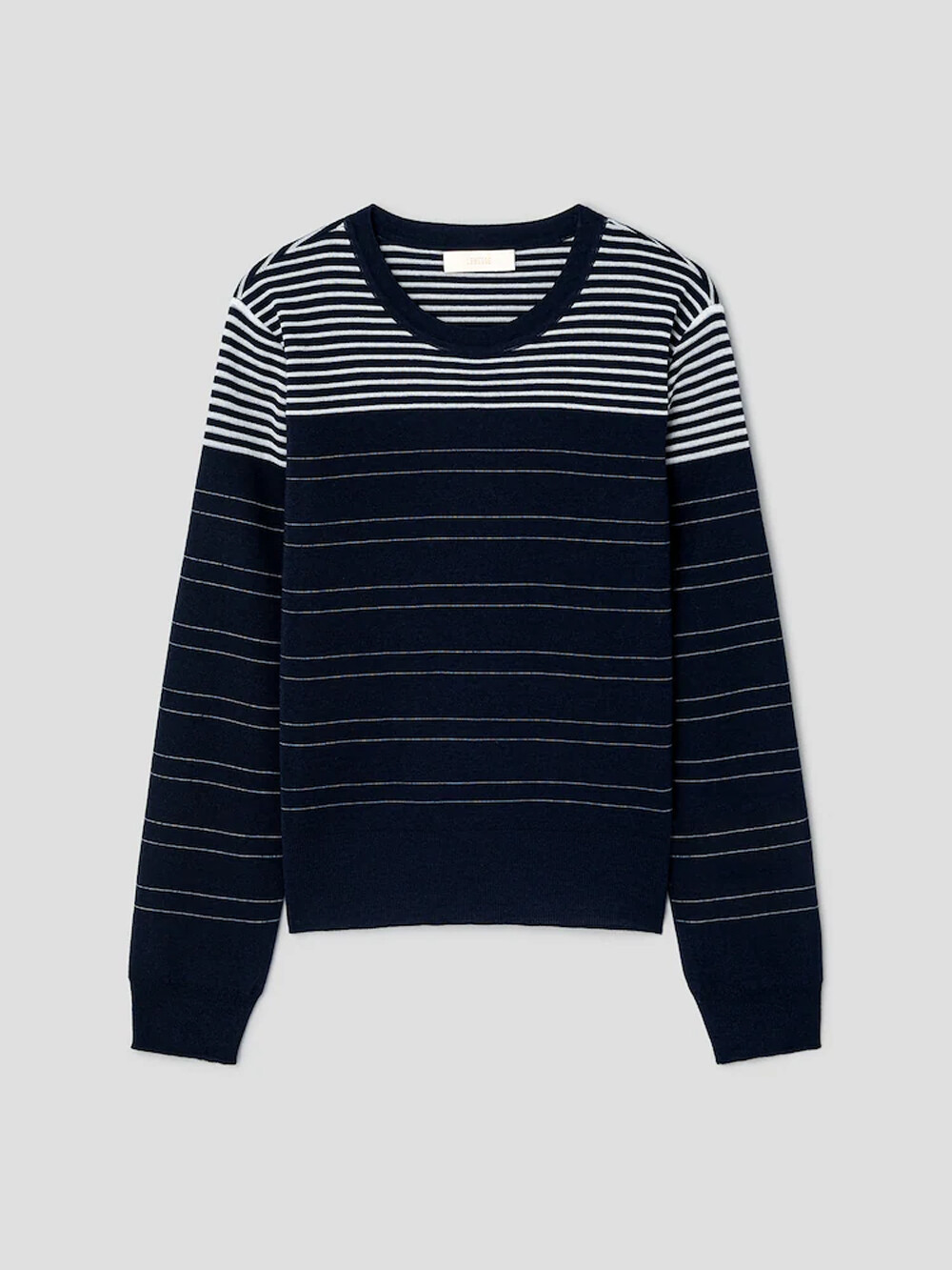 르베이지 울 실크 스트라이프 크루넥 스웨터