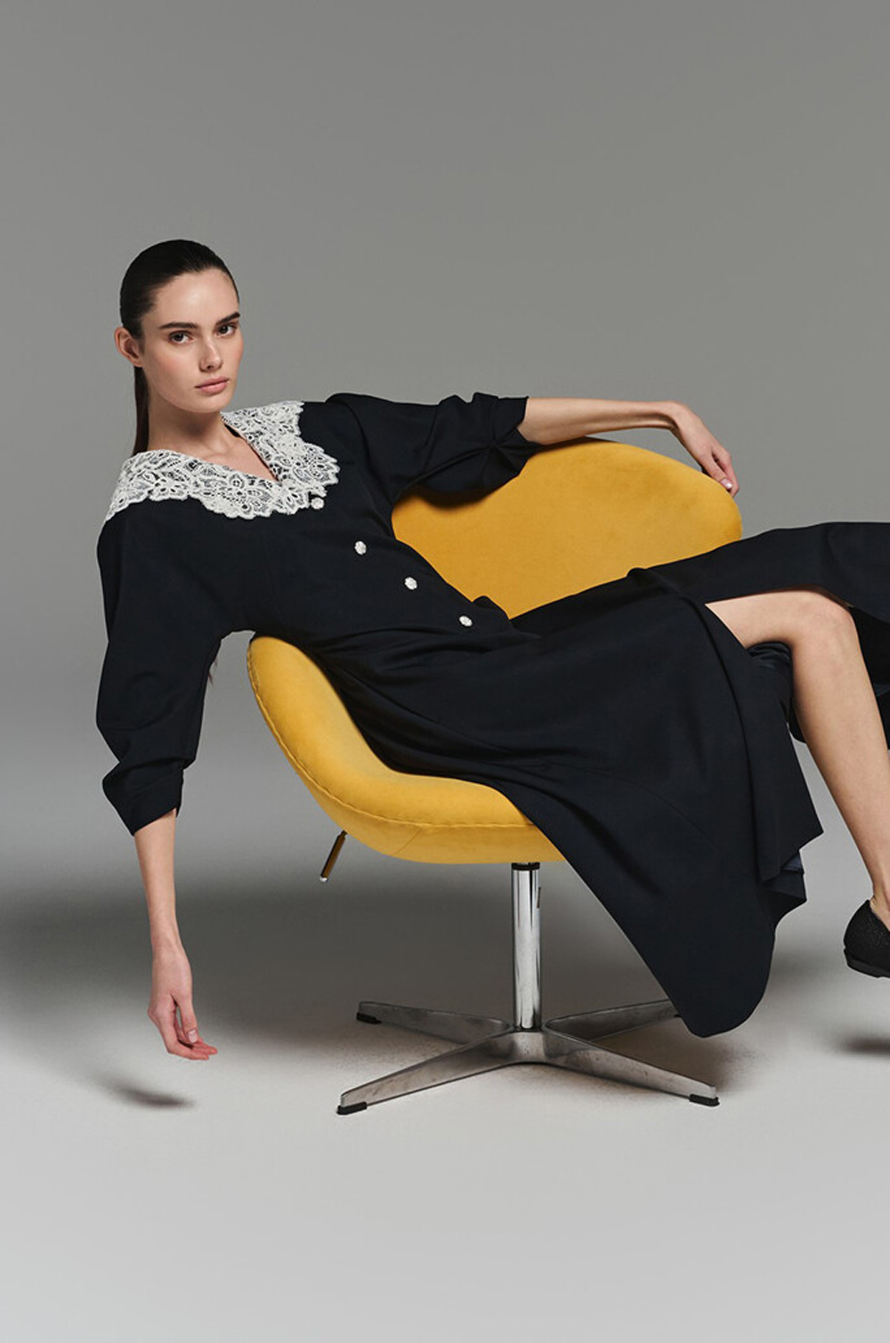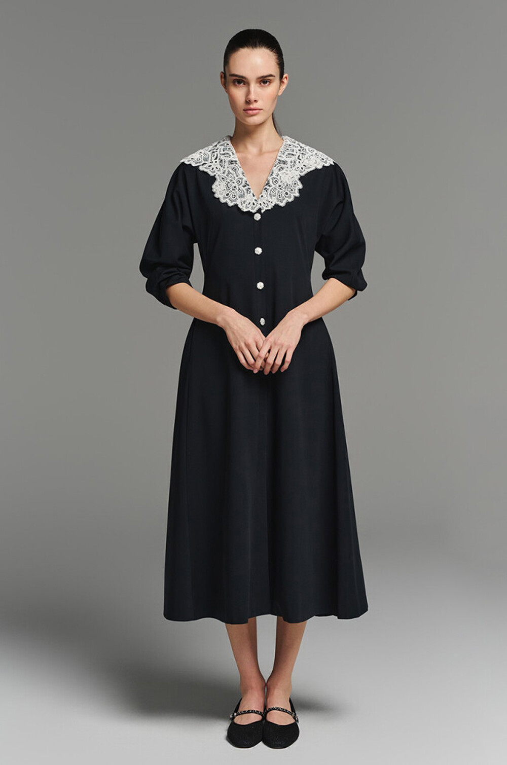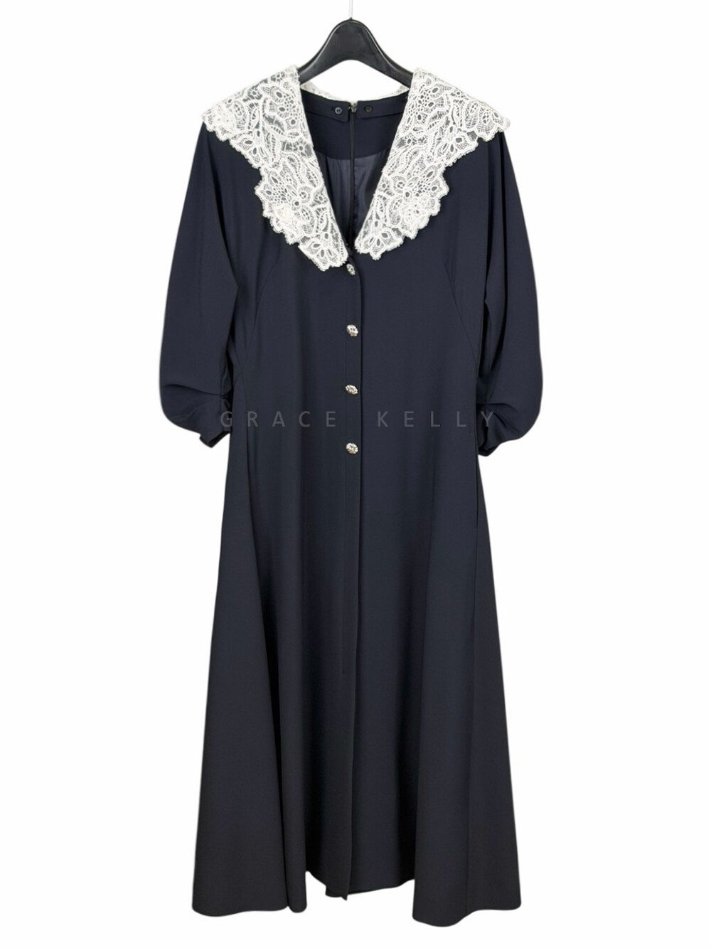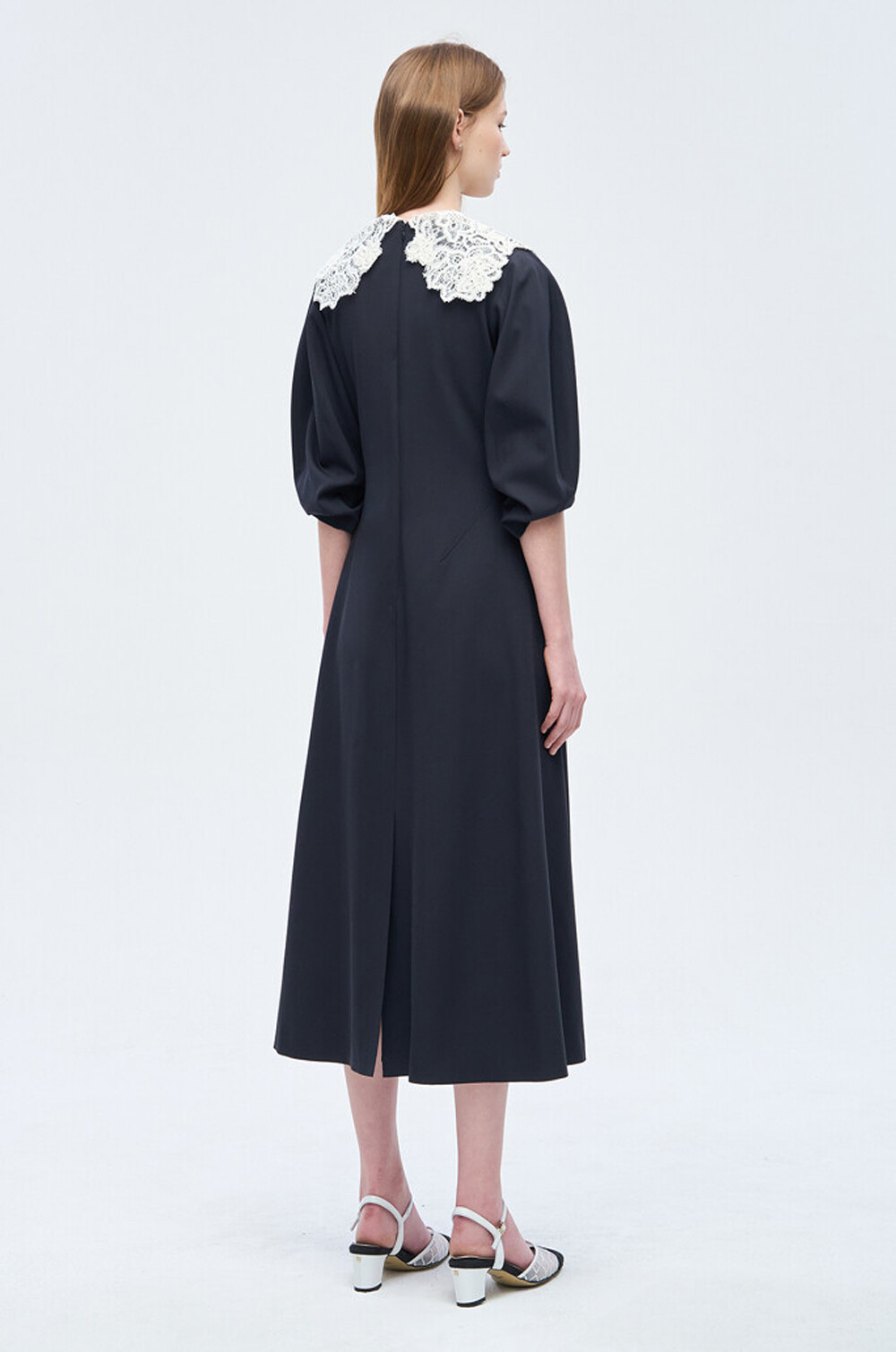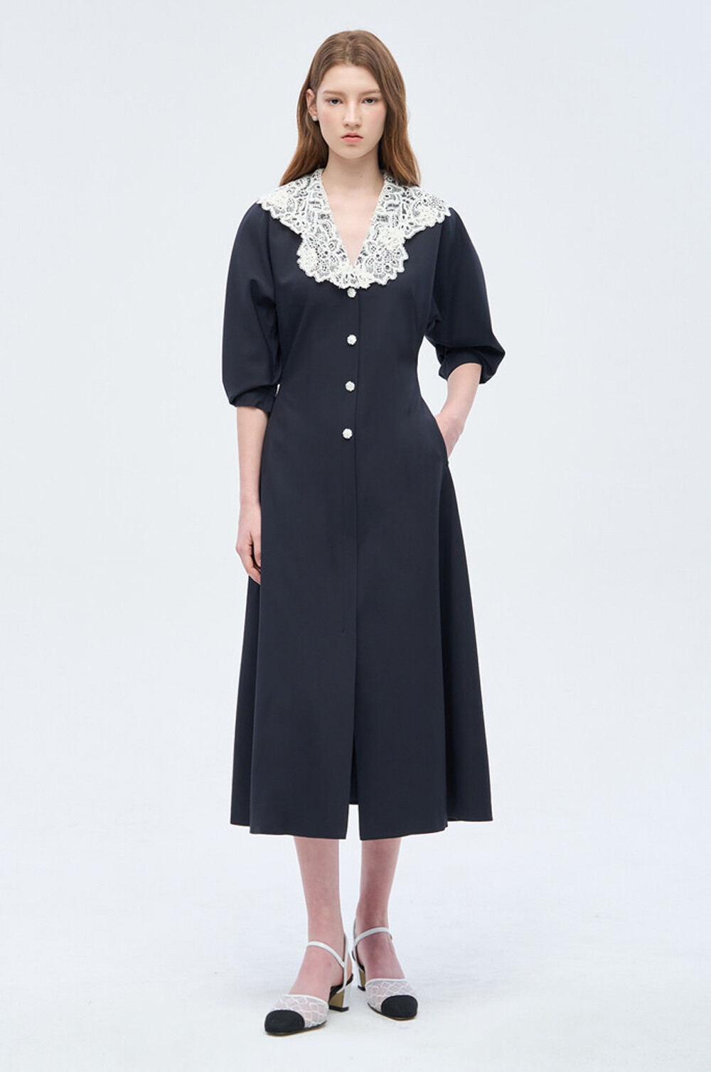- 넥라인에 버튼으로 탈부착 가능한 레이스 칼라를 함께 구성
