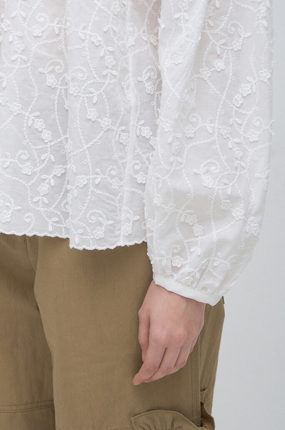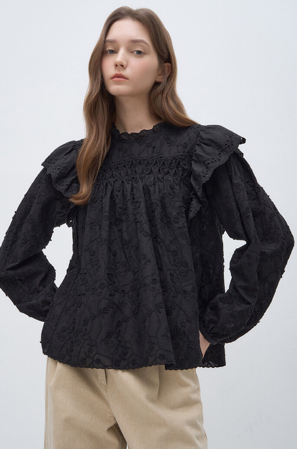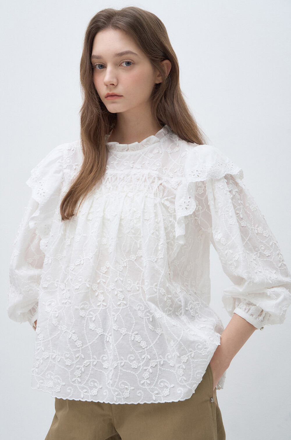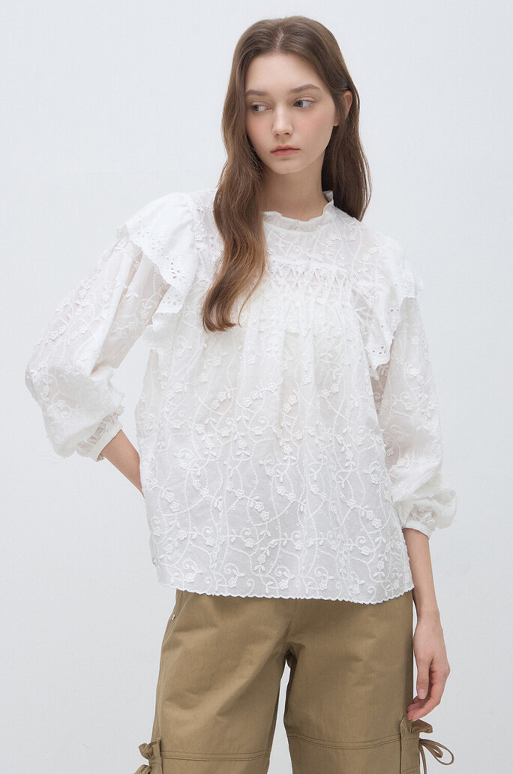오즈세컨 러플 패널 플로럴 자수 블라우스