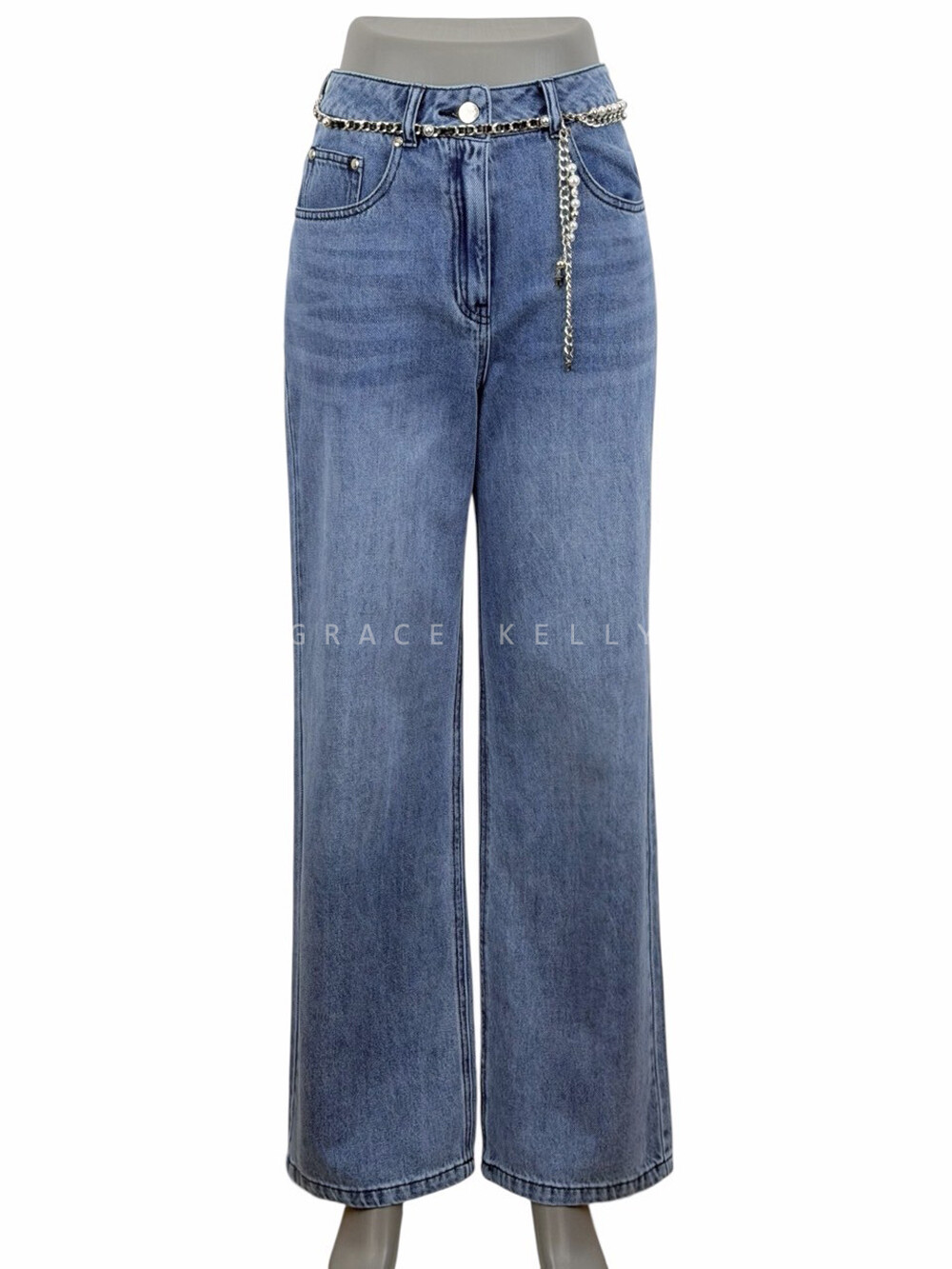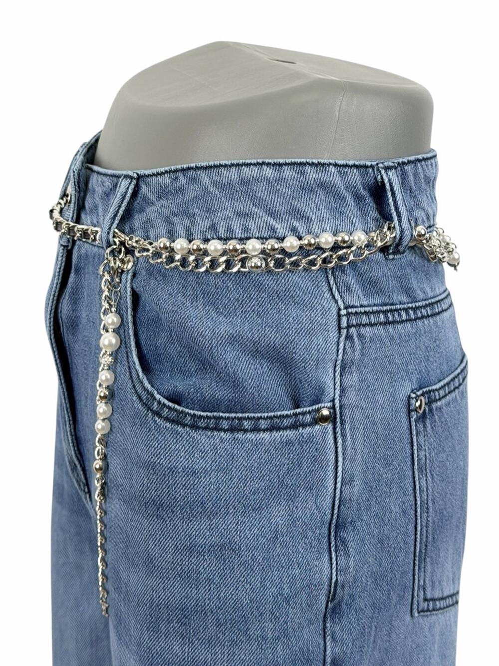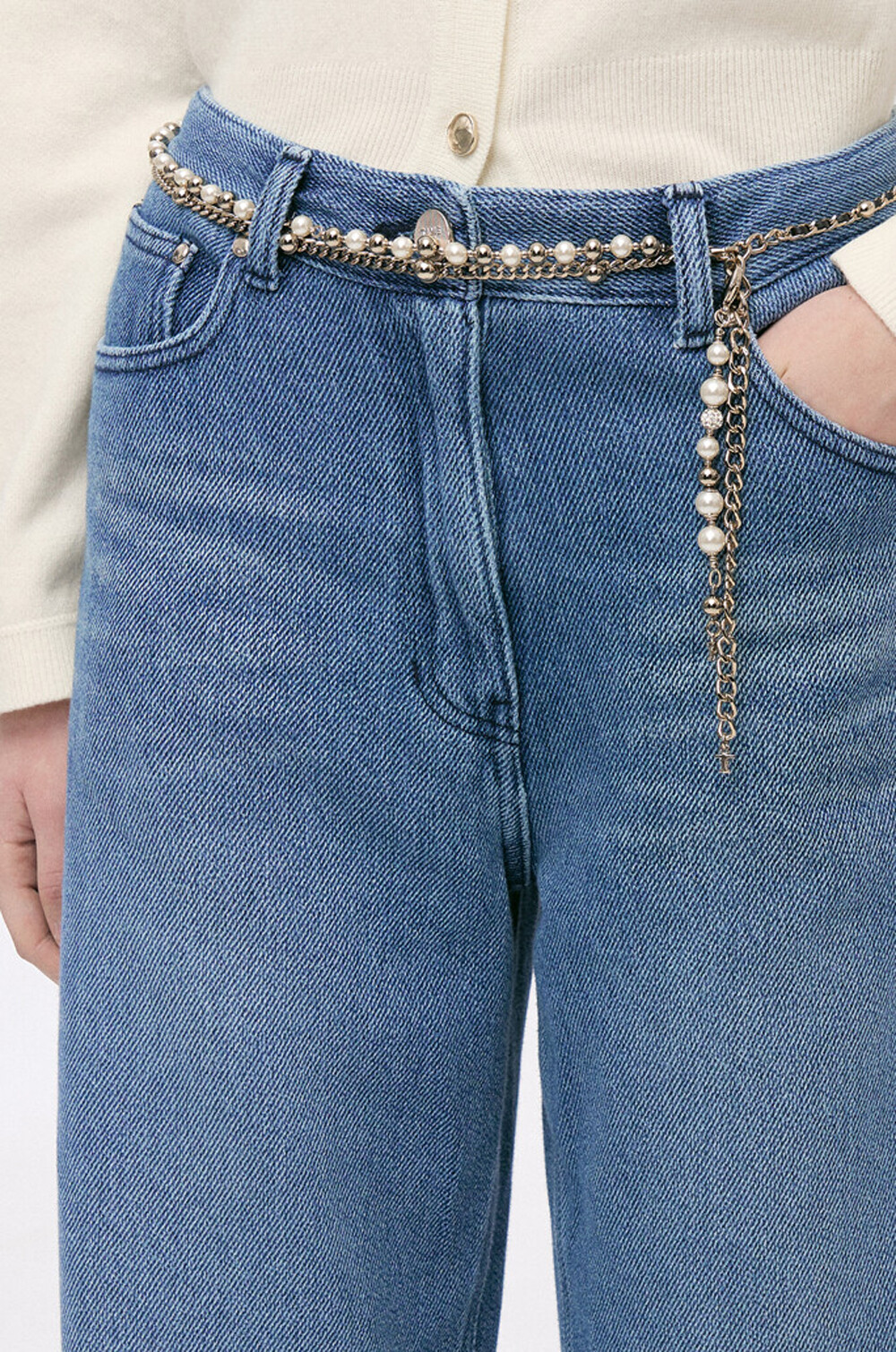 TIME. Wide Denim Pants & Pearl Chain Belt