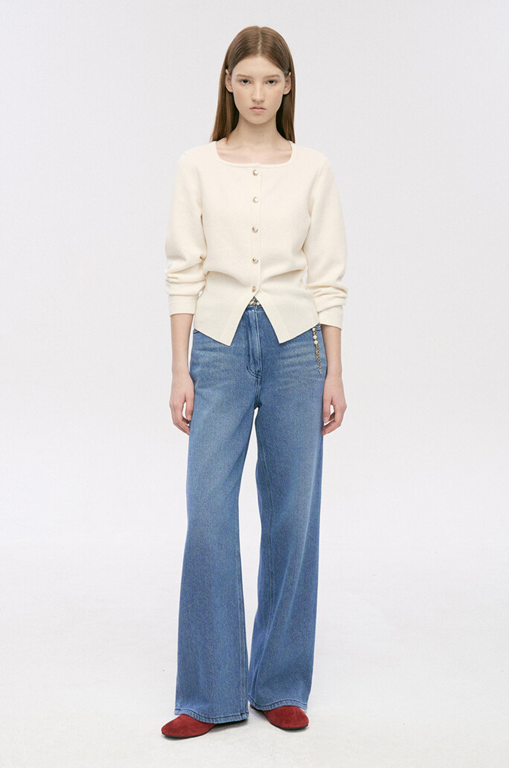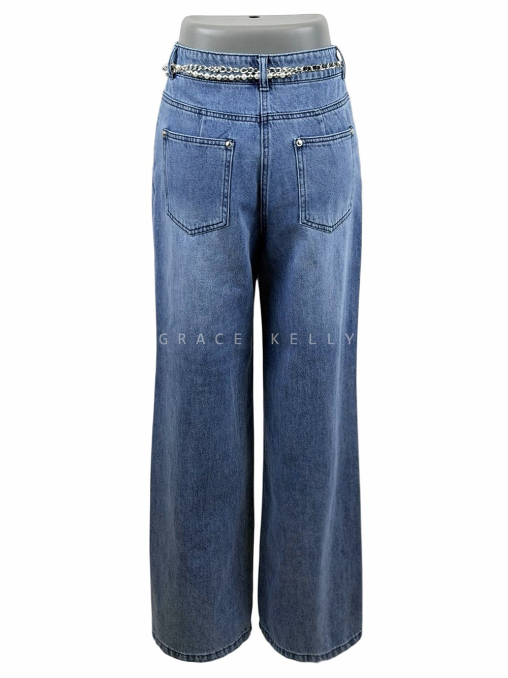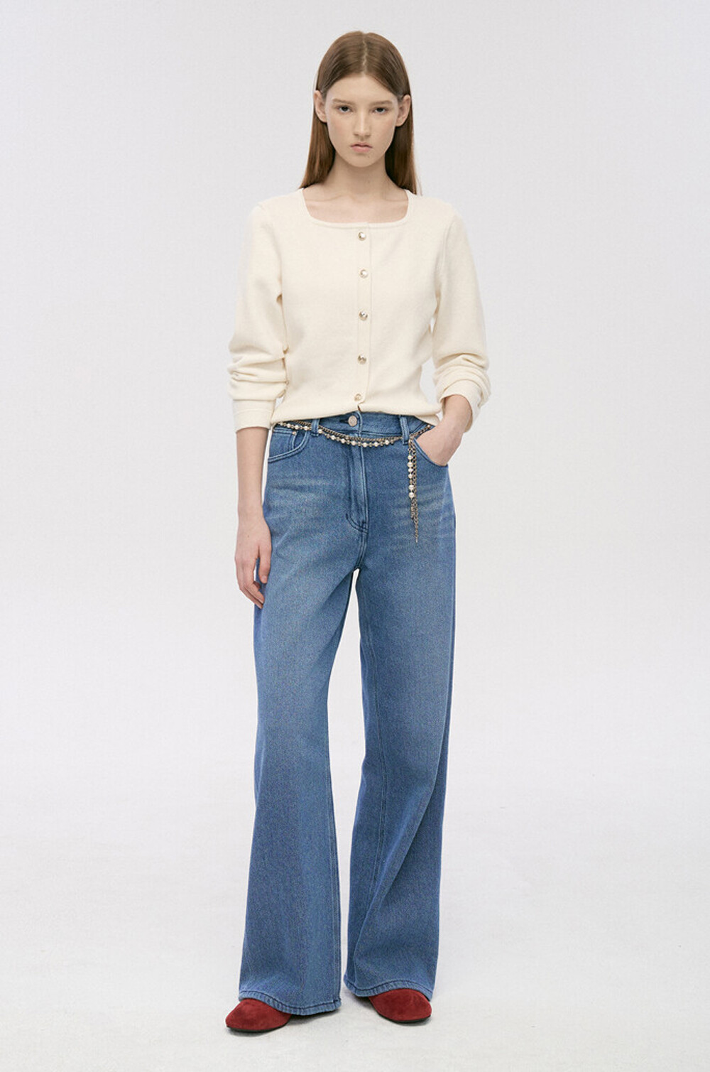 TIME. Wide Denim Pants & Pearl Chain Belt