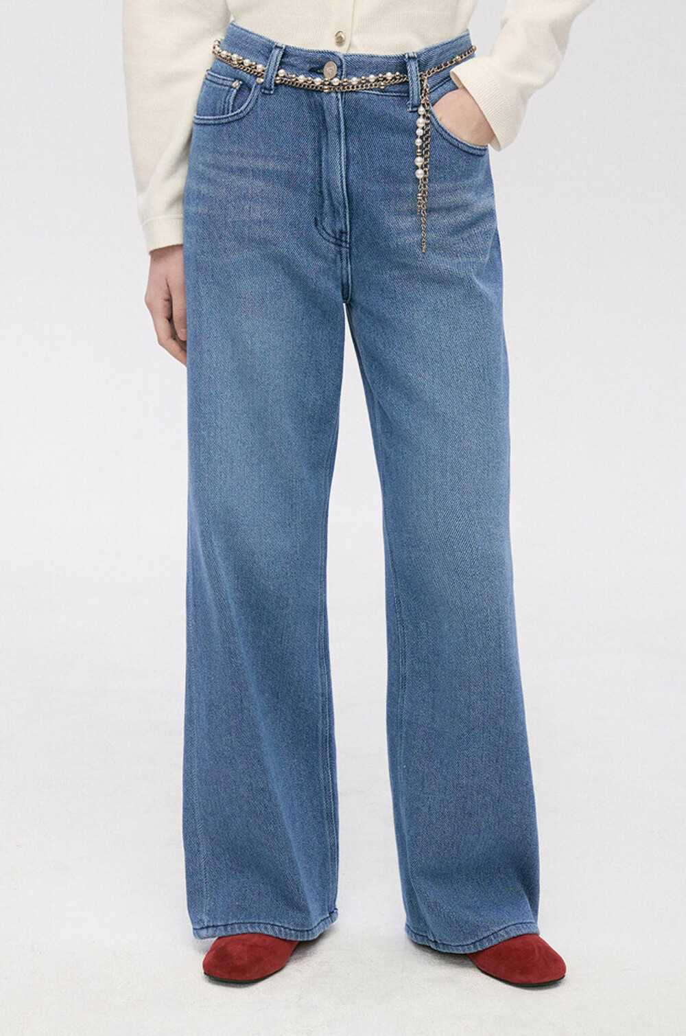타임 와이드 데님 팬츠 & 펄 체인 벨트