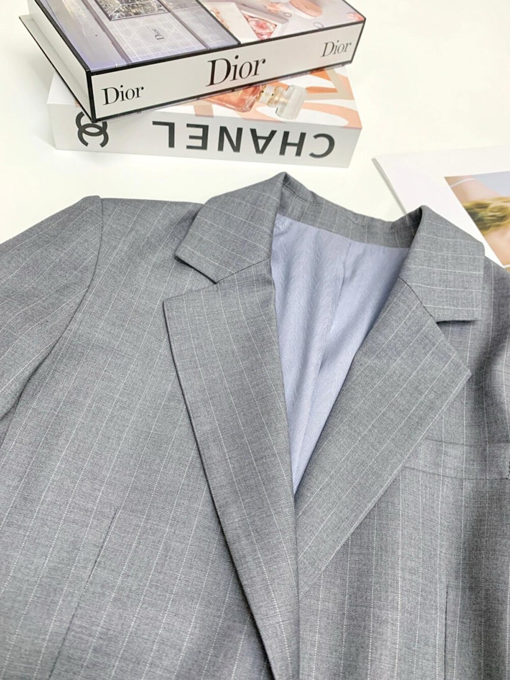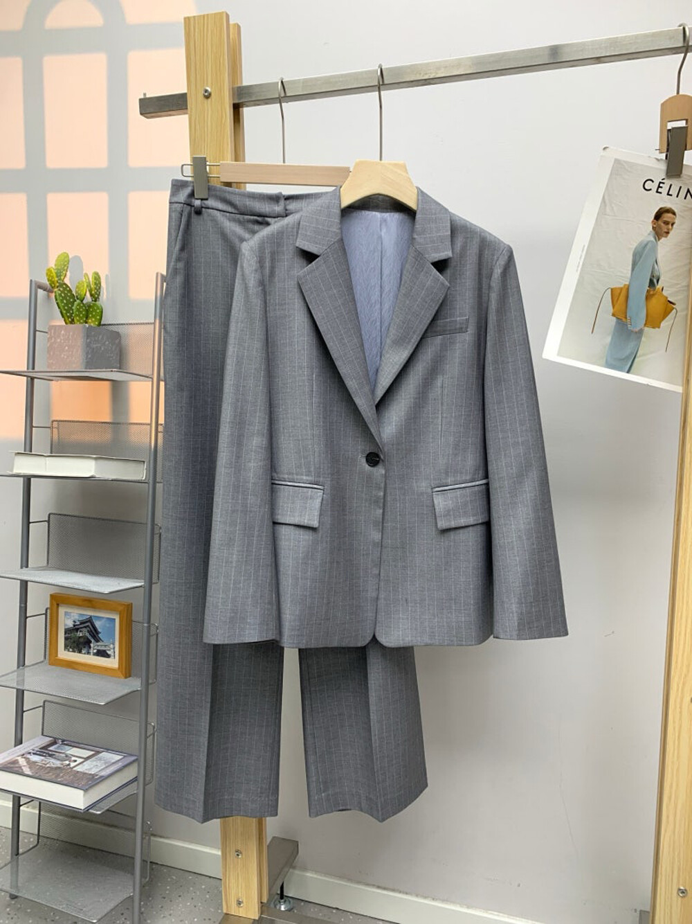 은은한 패턴이 돋보이는 셋업으로,