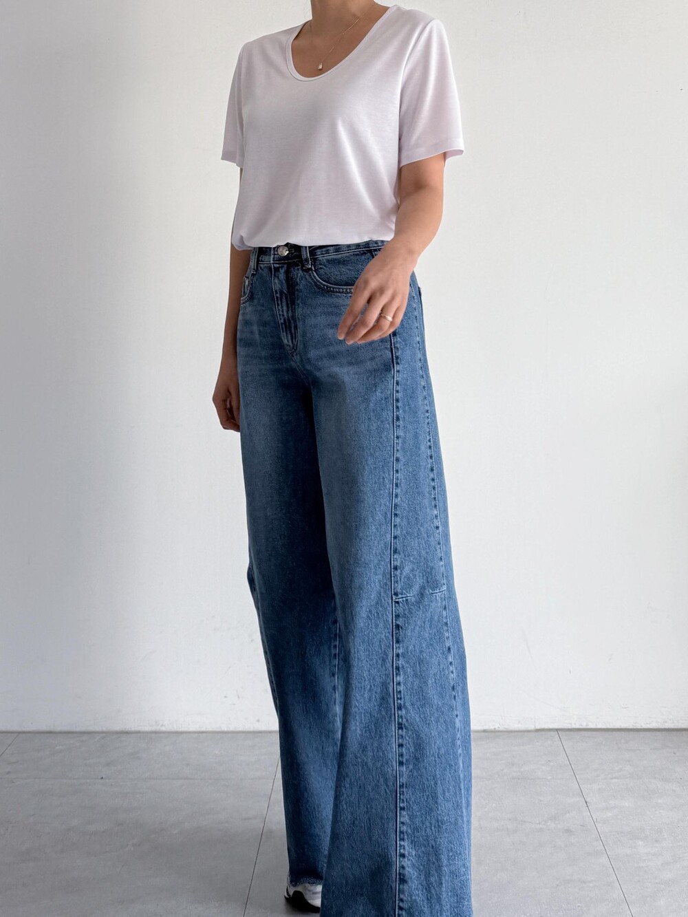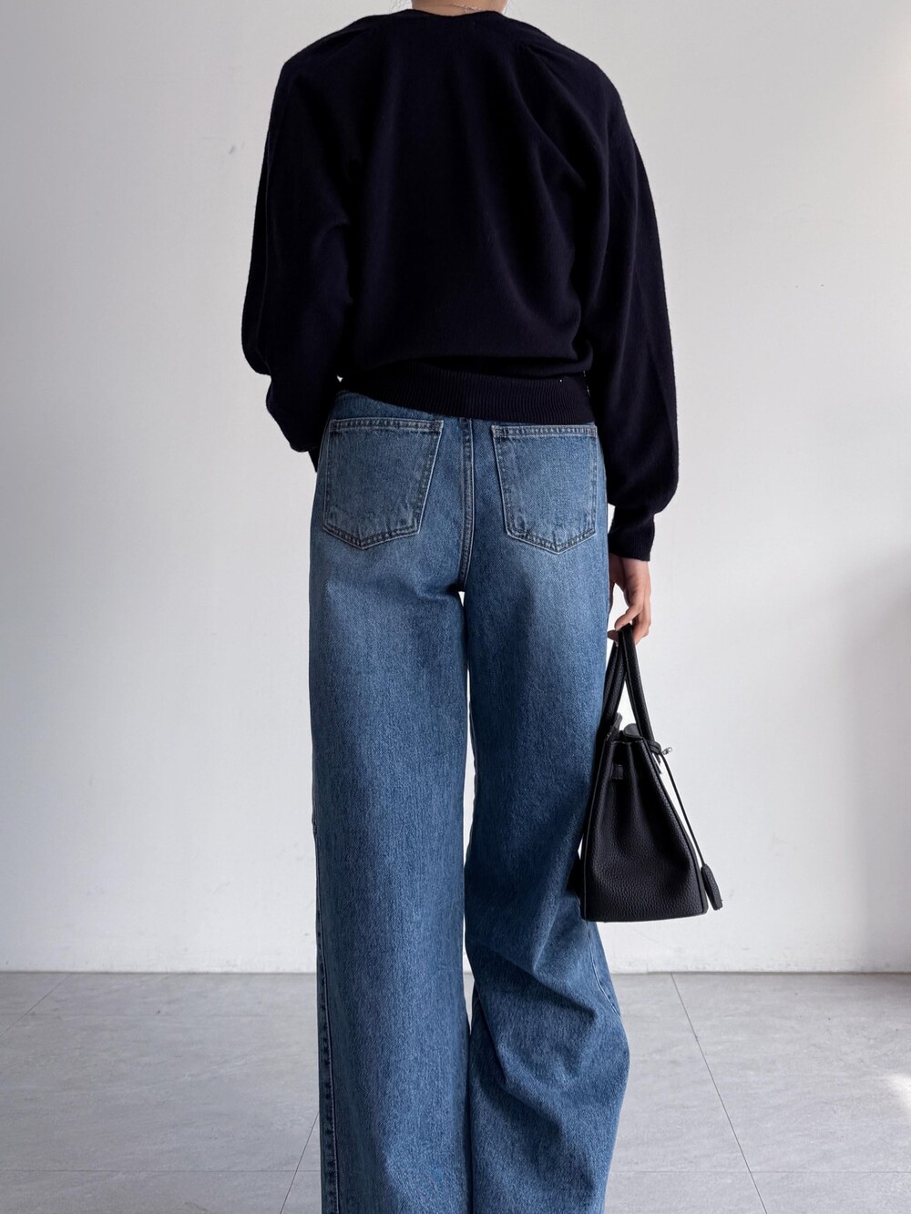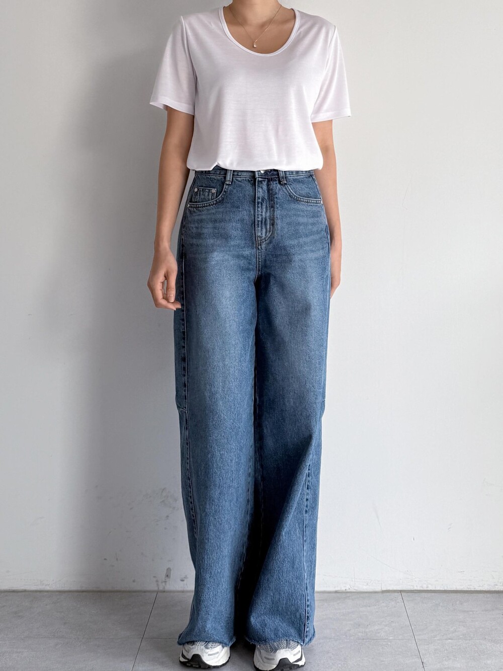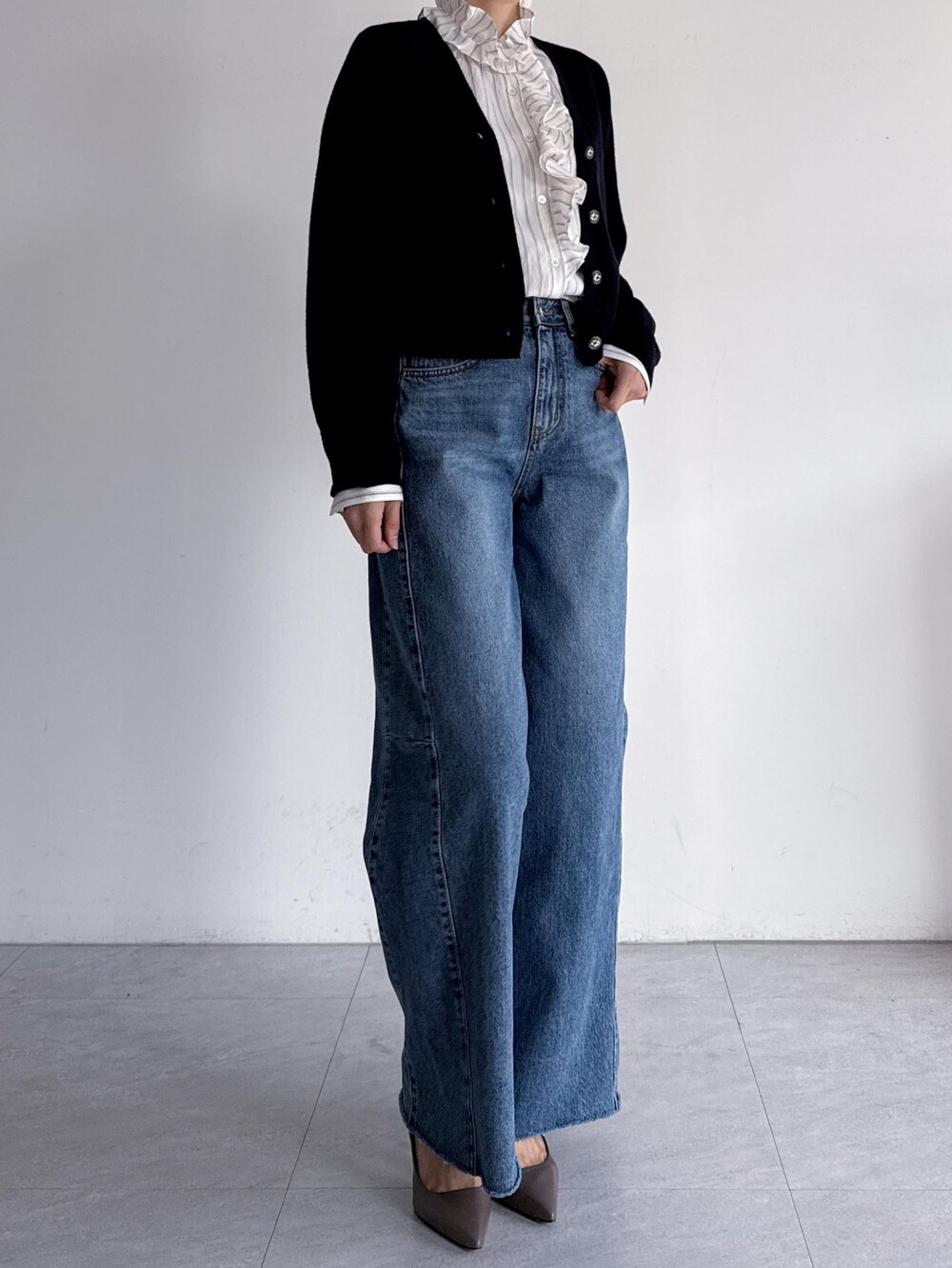 제이코코. 프레이드 헴 패널 와이드 데님 팬츠