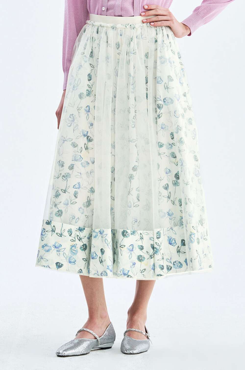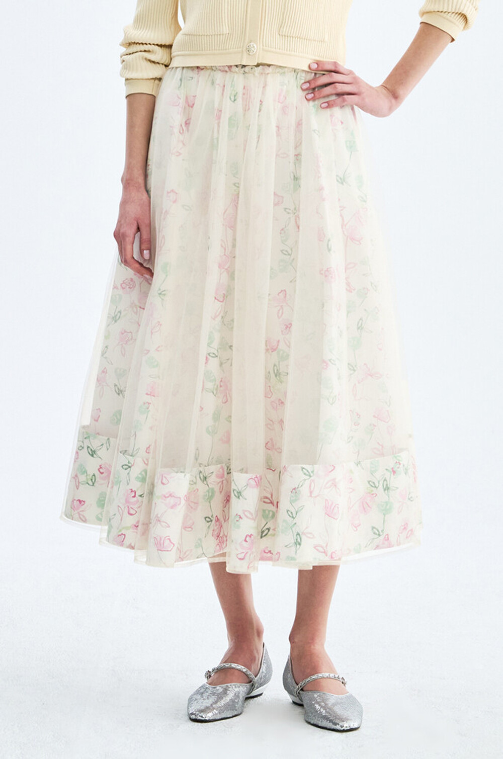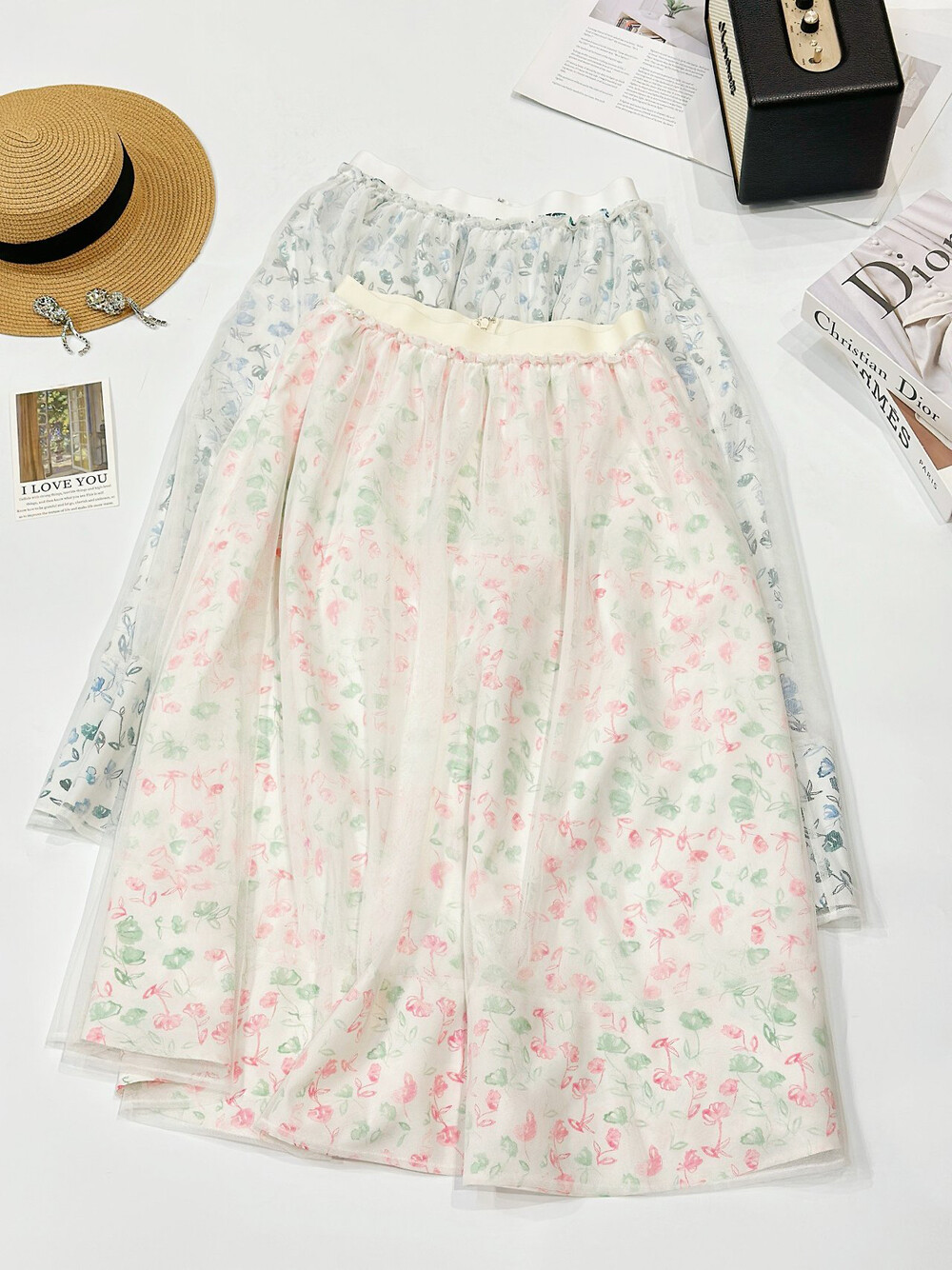 오브제 플로럴 플레어 튤 스커트
