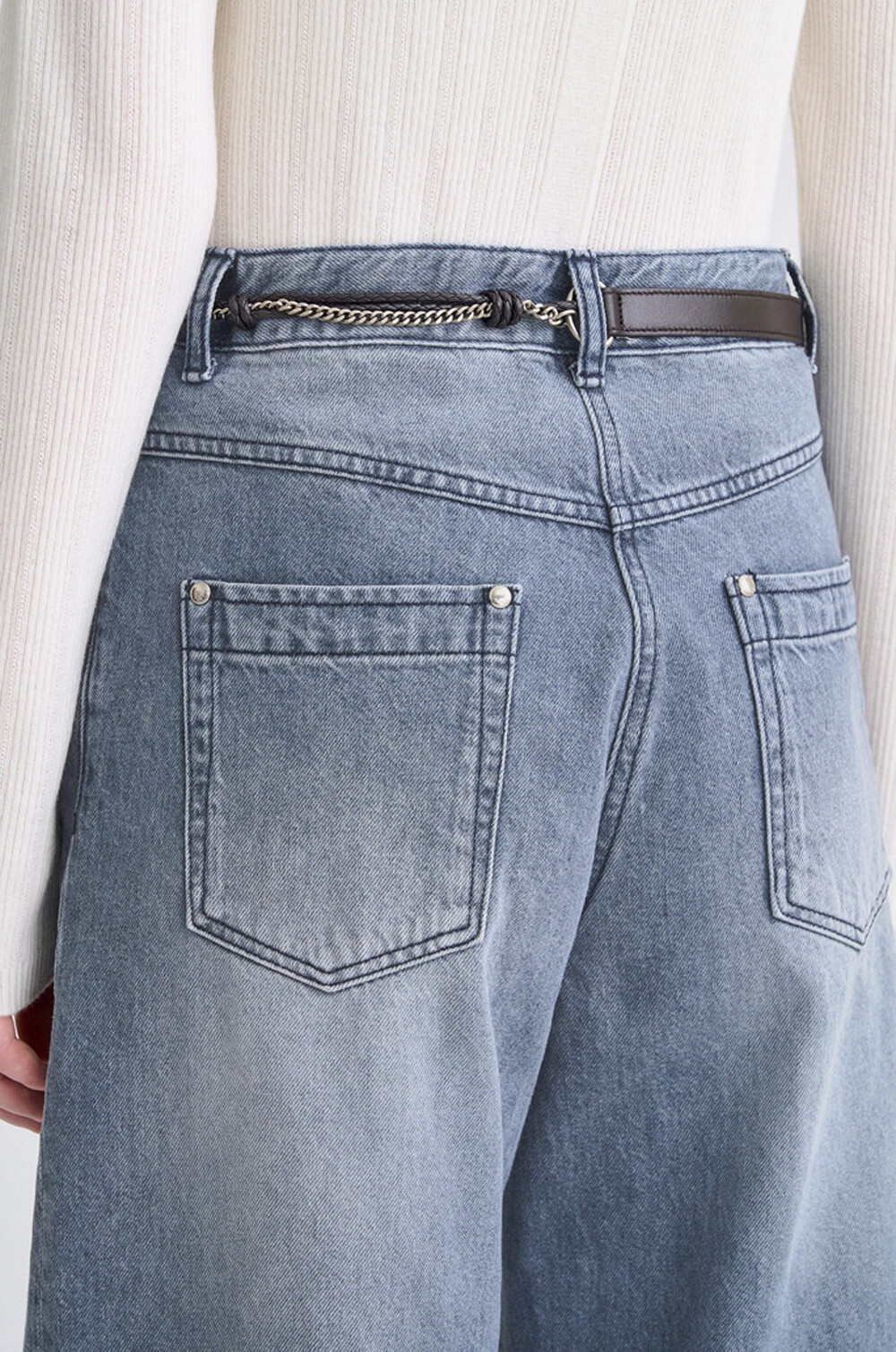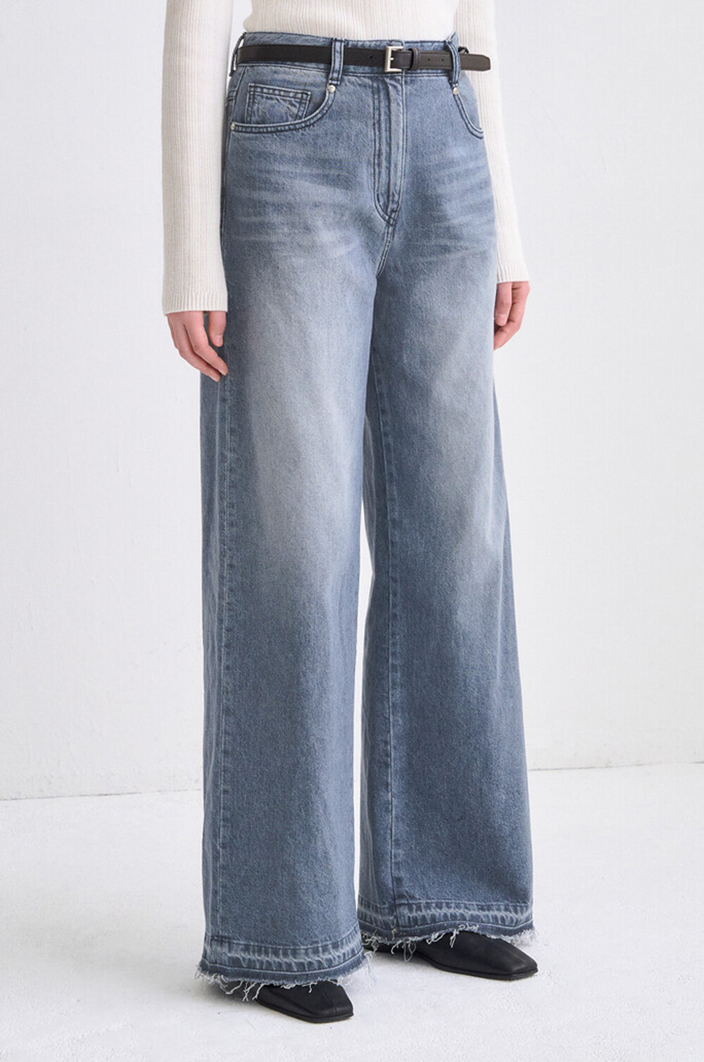 타임 벨티드 프레이드 헴 와이드 데님 팬츠