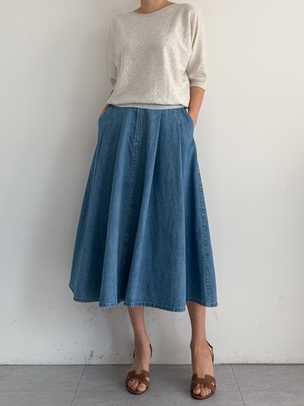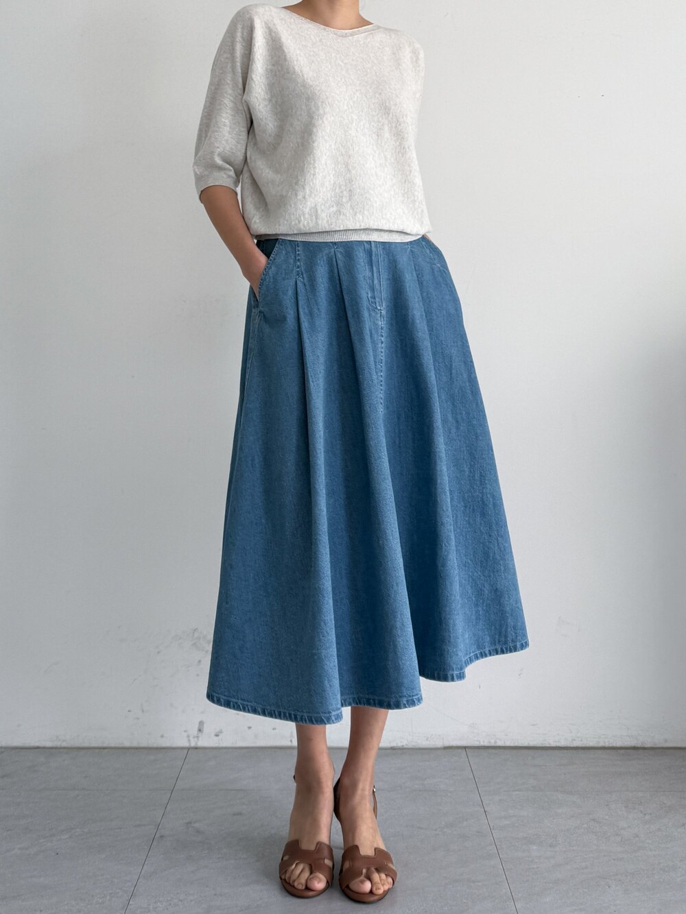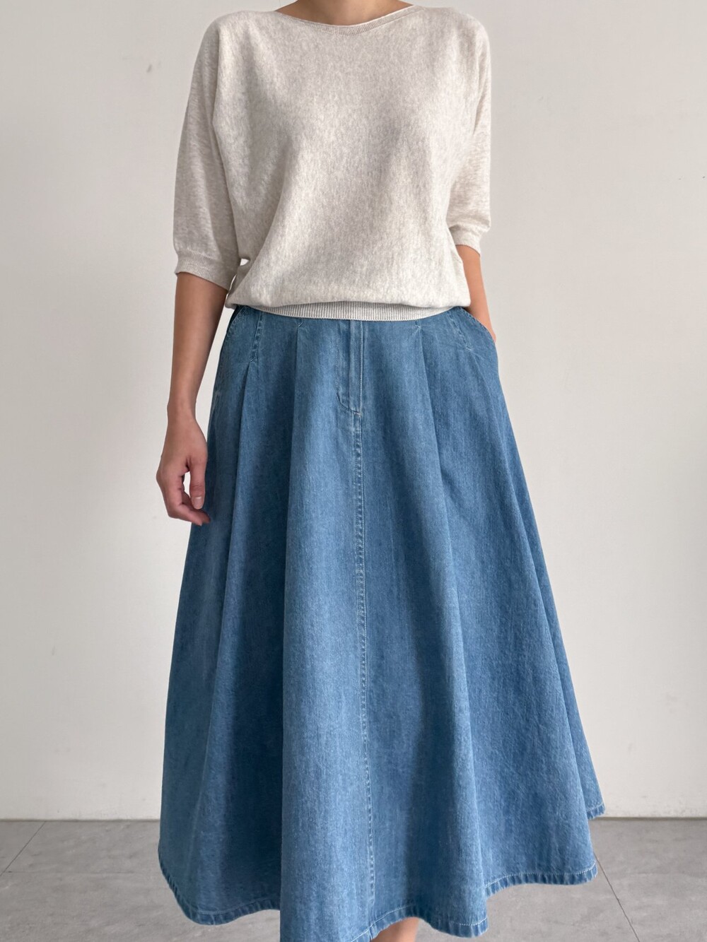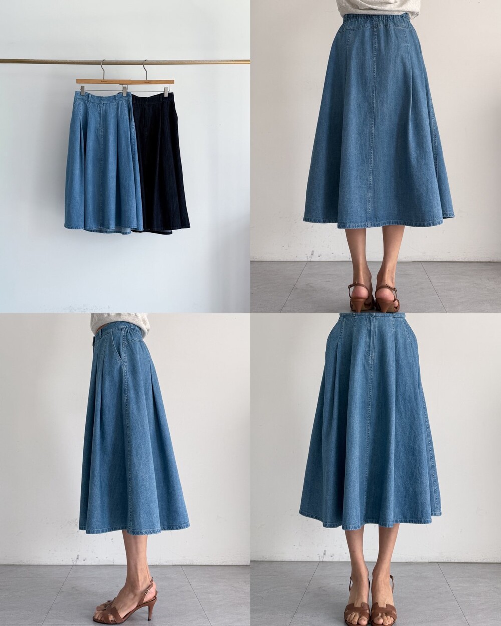 핀턱 데님 플레어 스커트