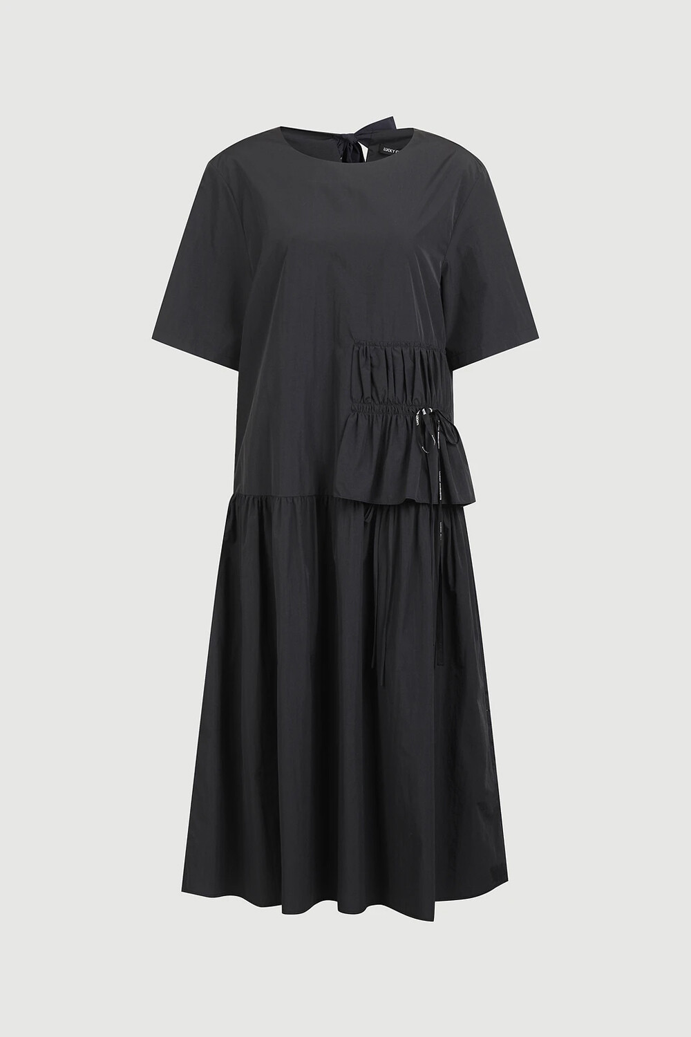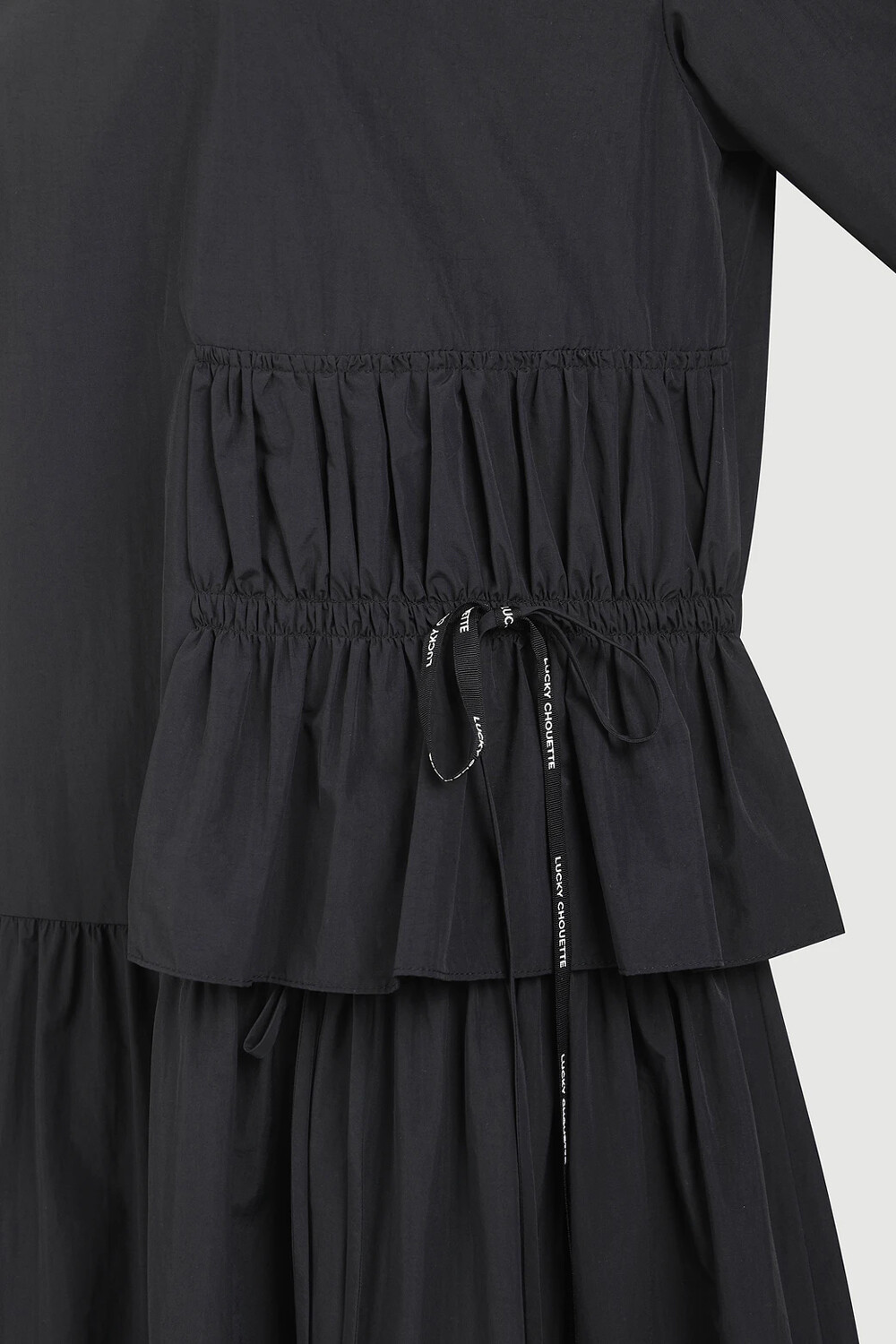 - 허리선 아래로 셔링을 넣어 볼륨감을 더한 디자인.