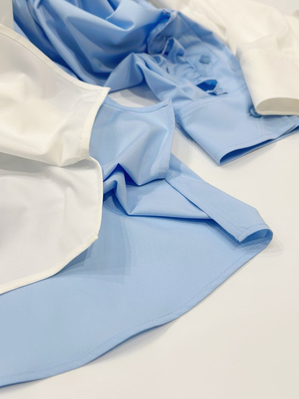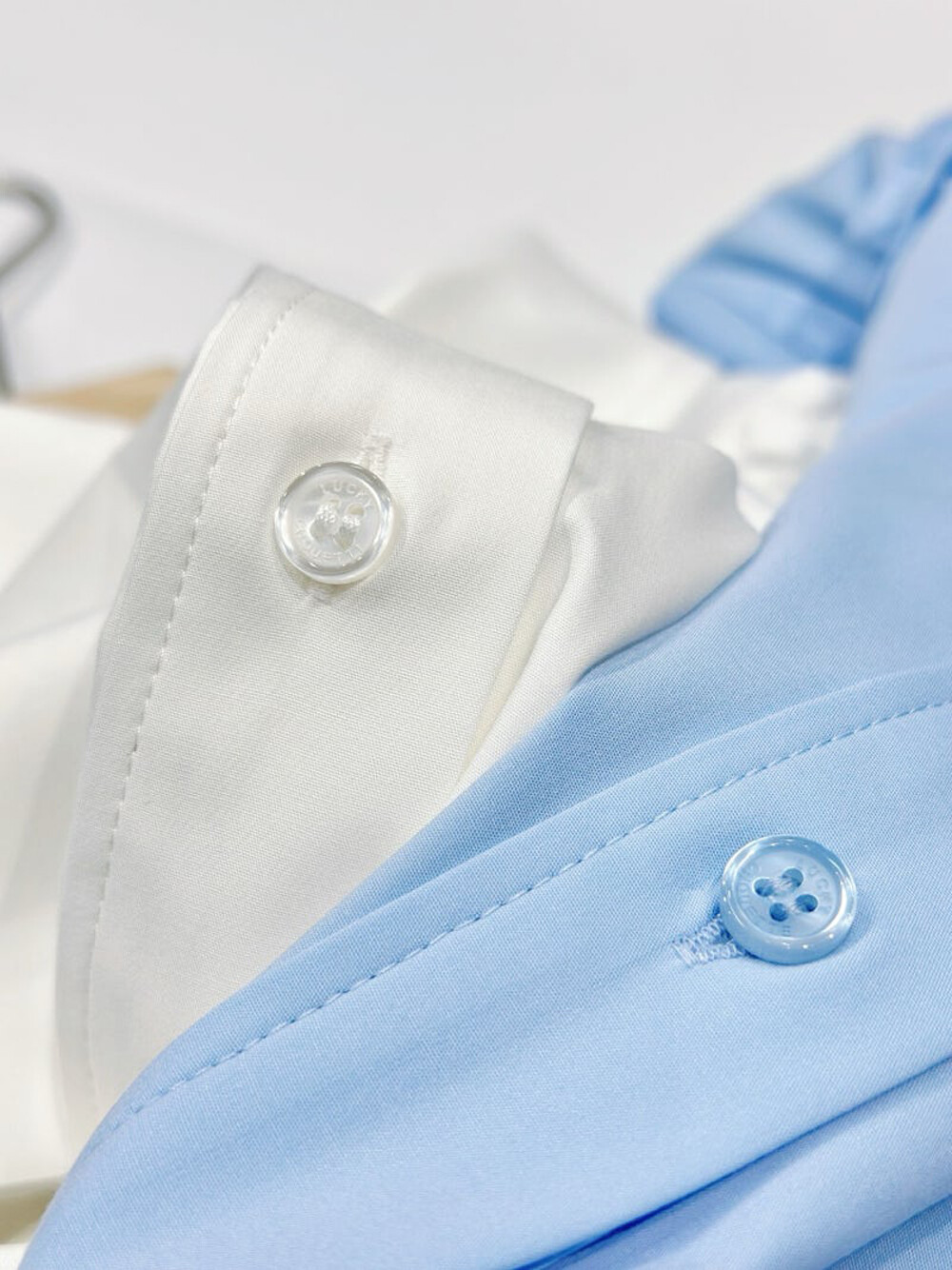 - 어깨와 소매에 셔링 디테일로 포인트를 줌.