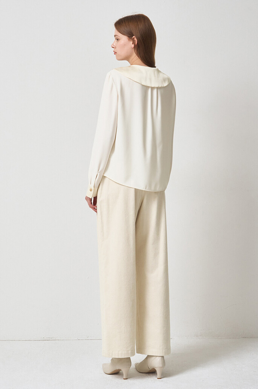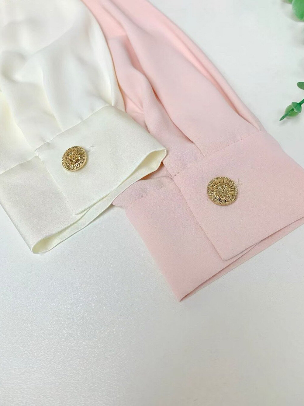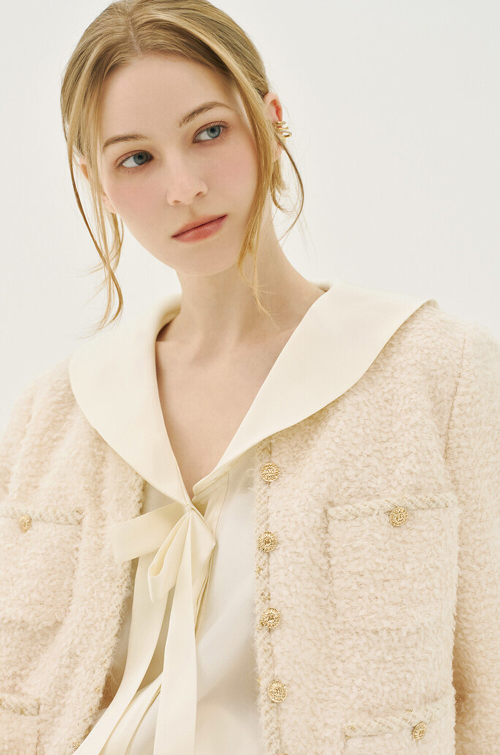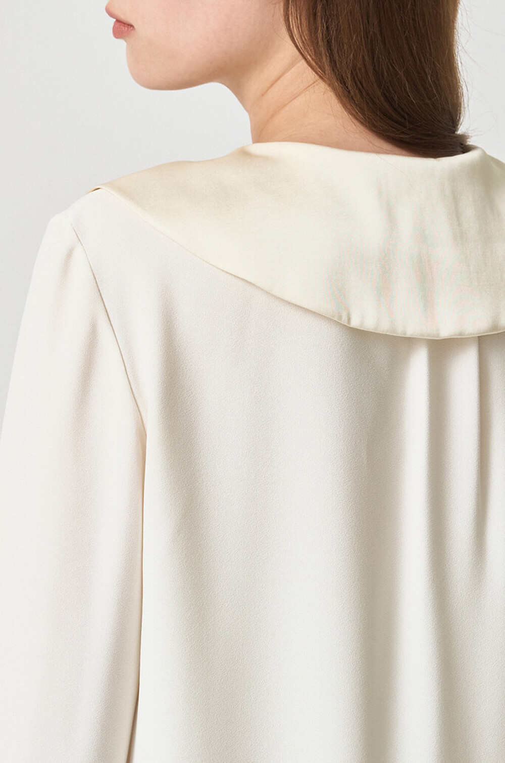 - 넥라인 상단에 메탈 버튼과 하단의 히든 버튼 클로징