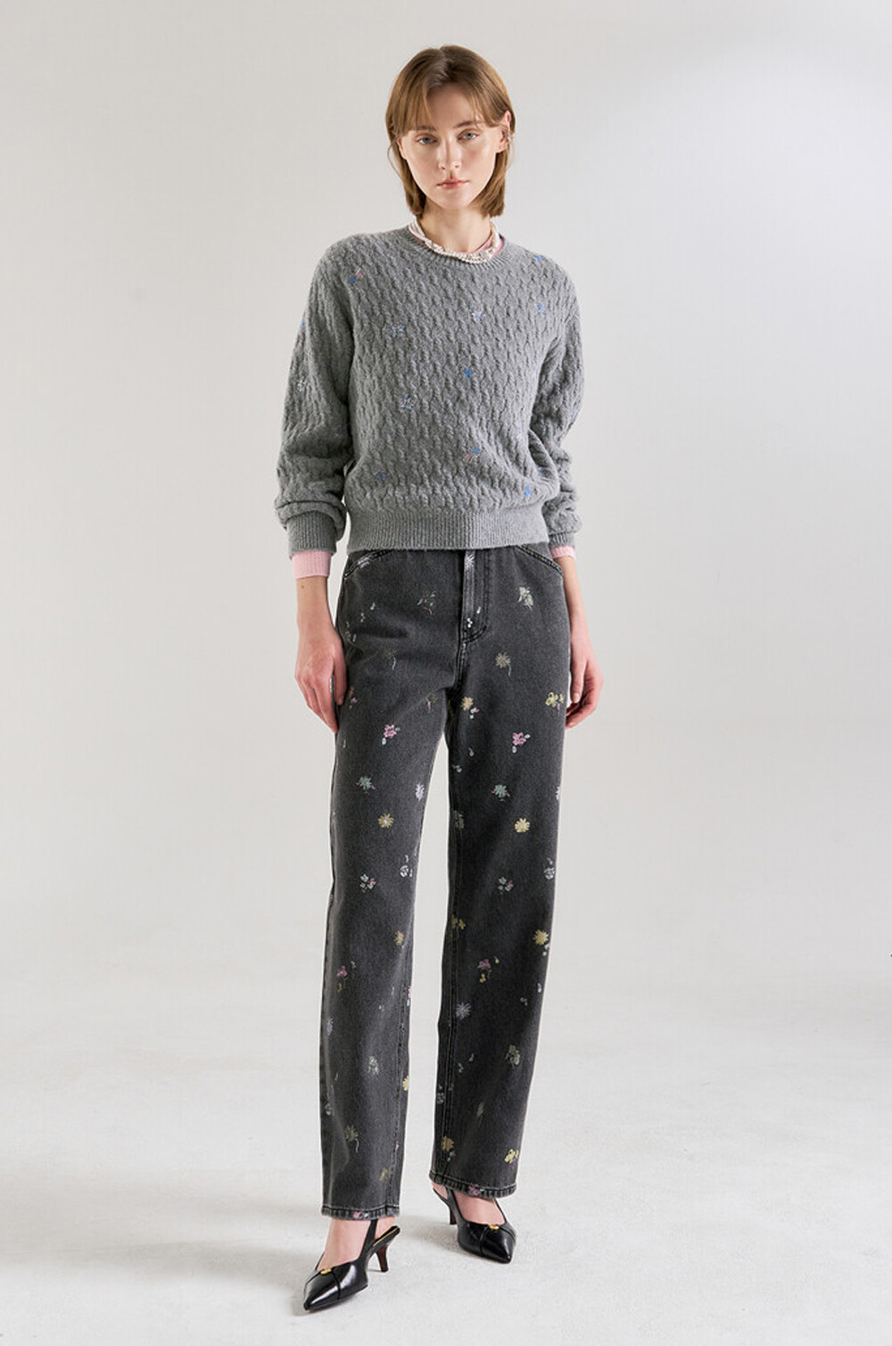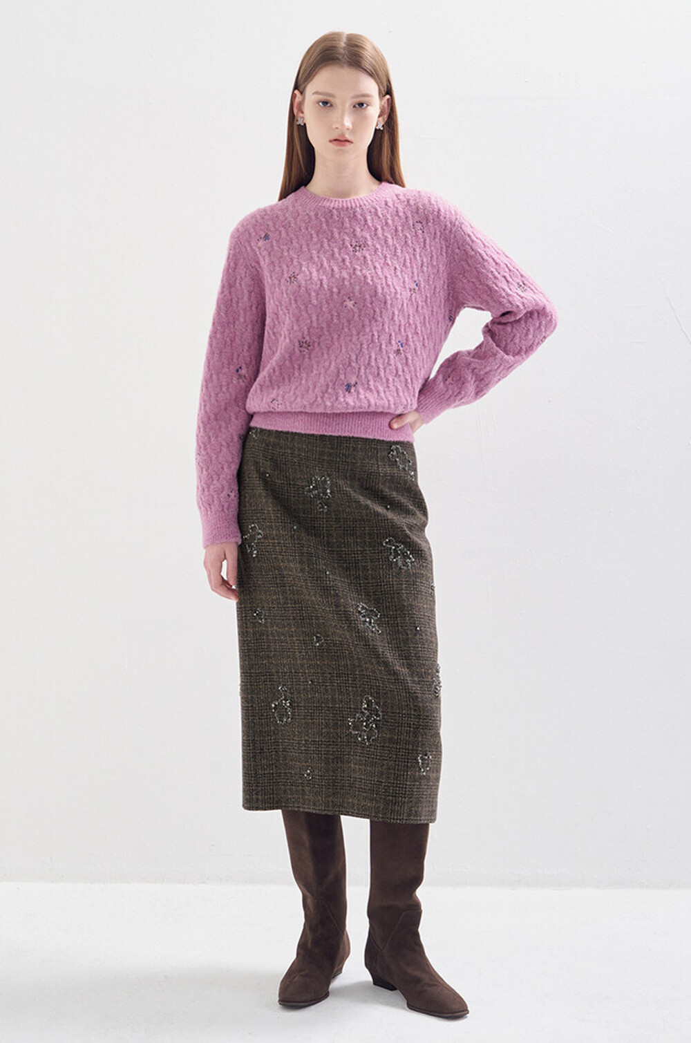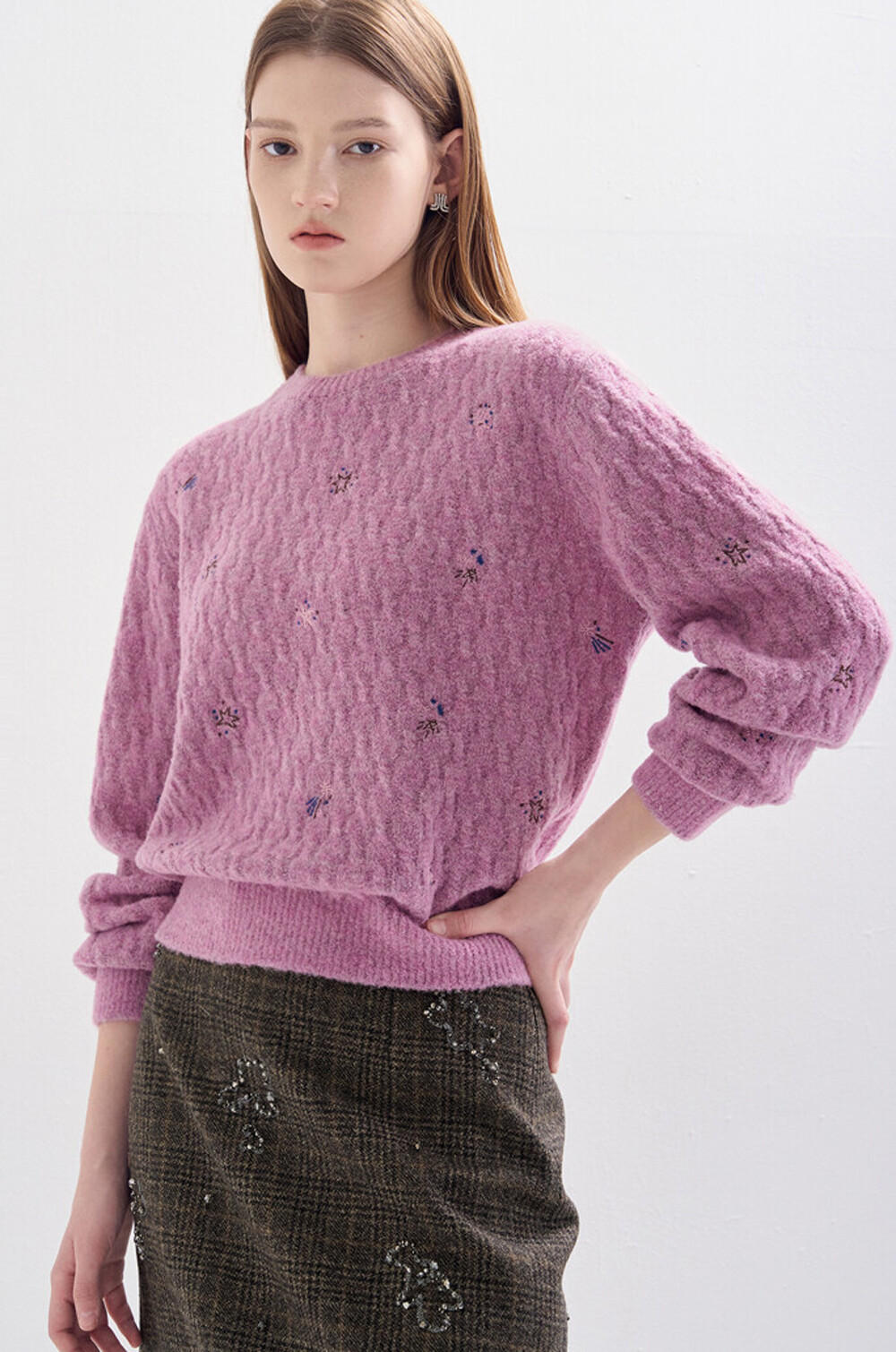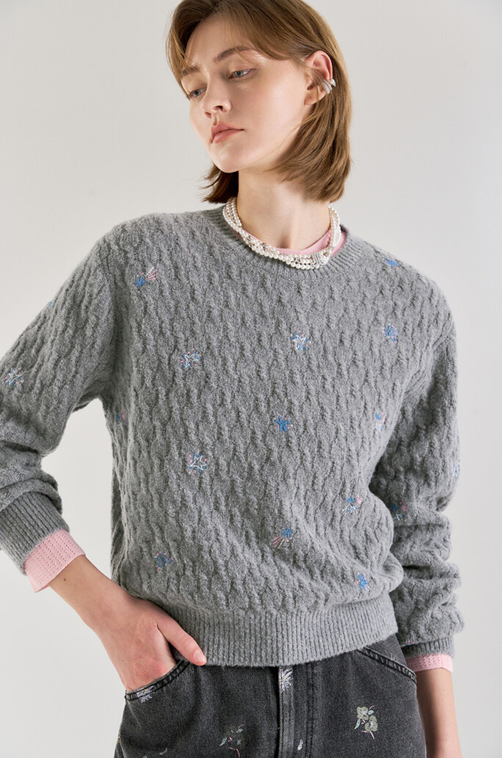 랑방컬렉션 울 블렌드 자수 디테일 케이블 니트 탑