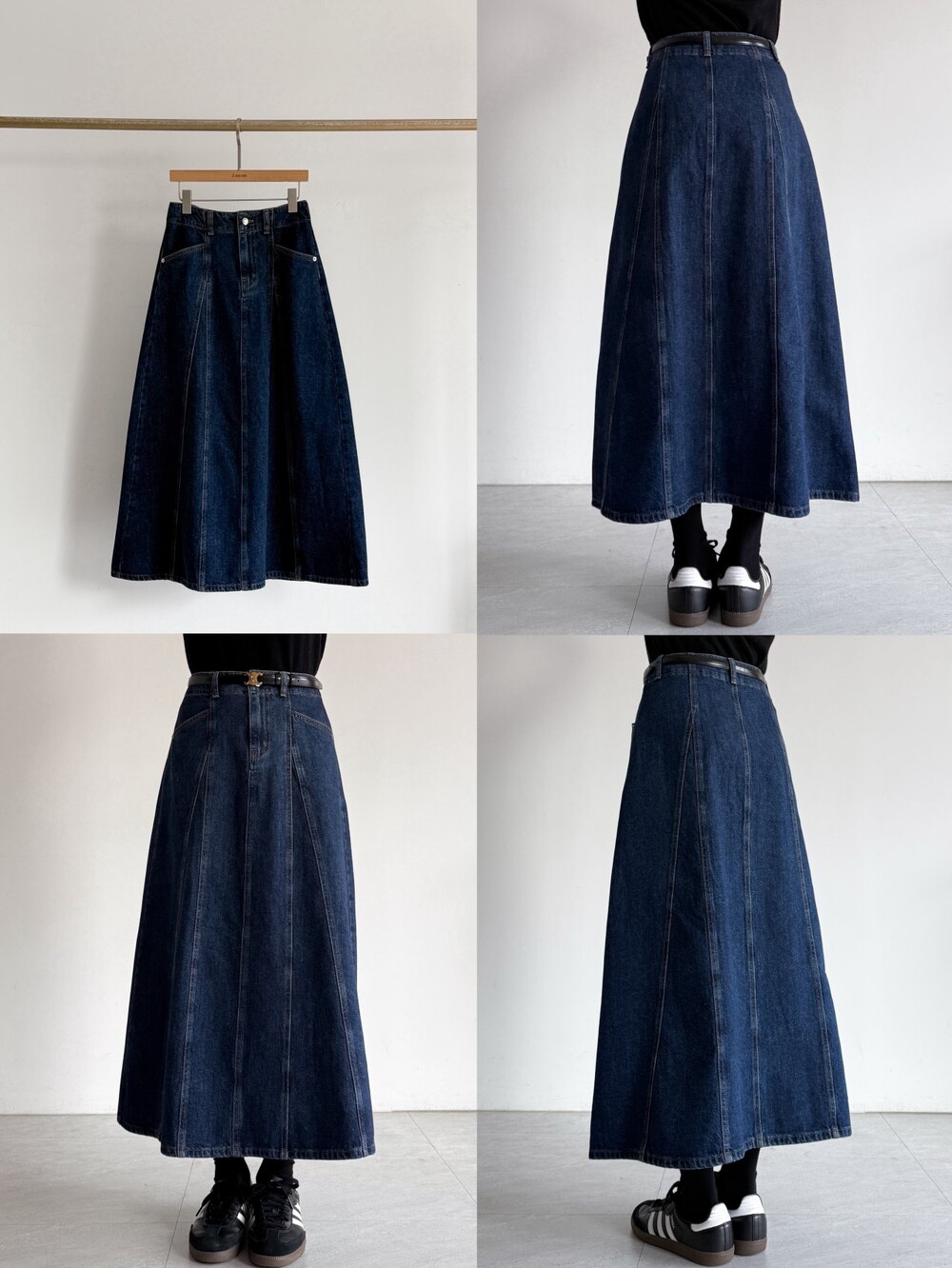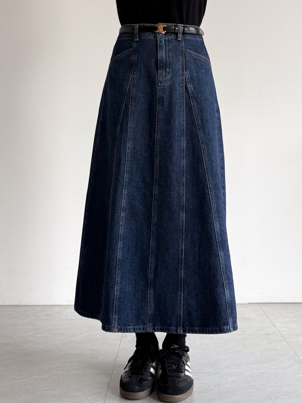 (세일) 패널 플레어 데님 롱 스커트