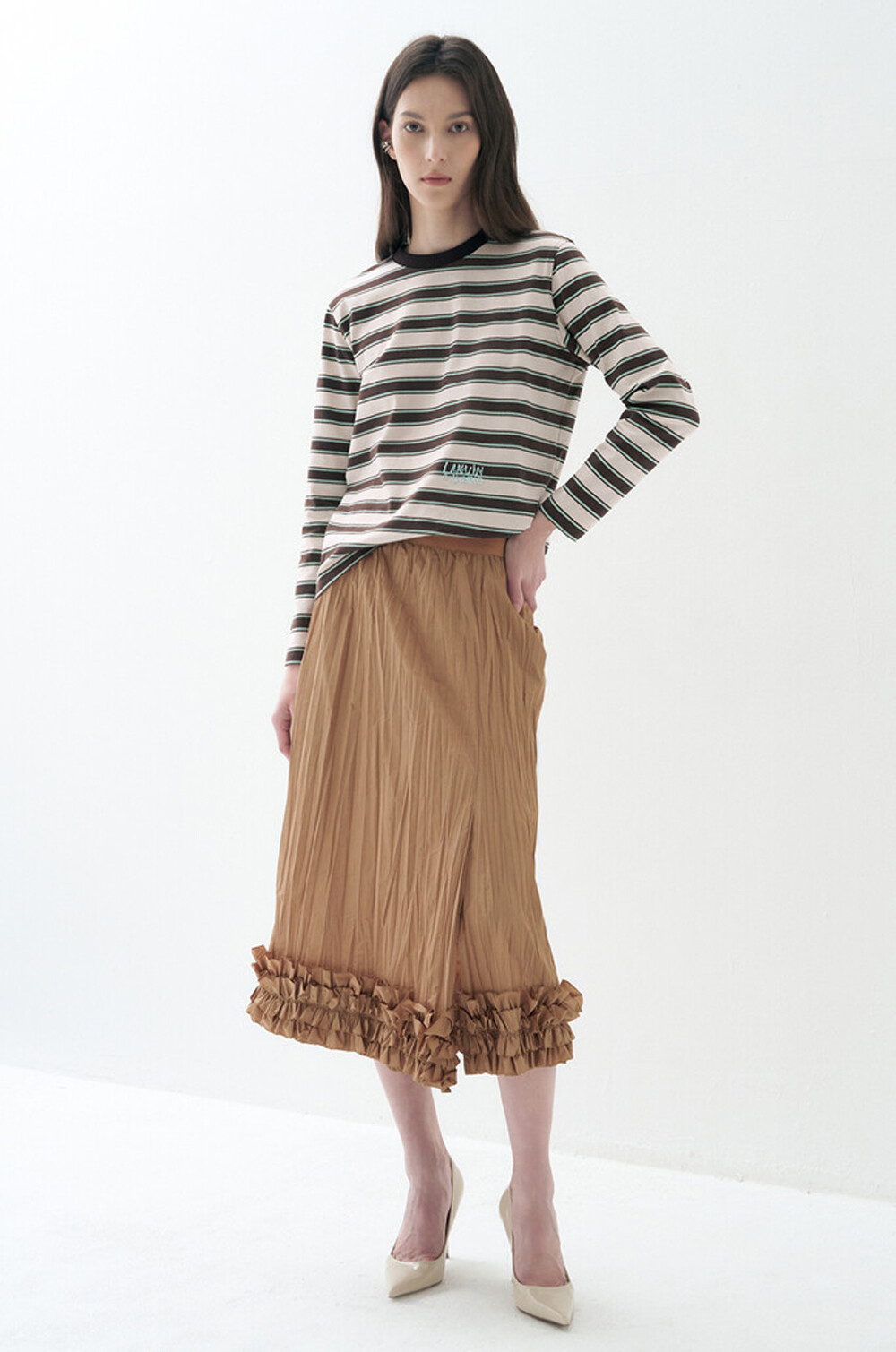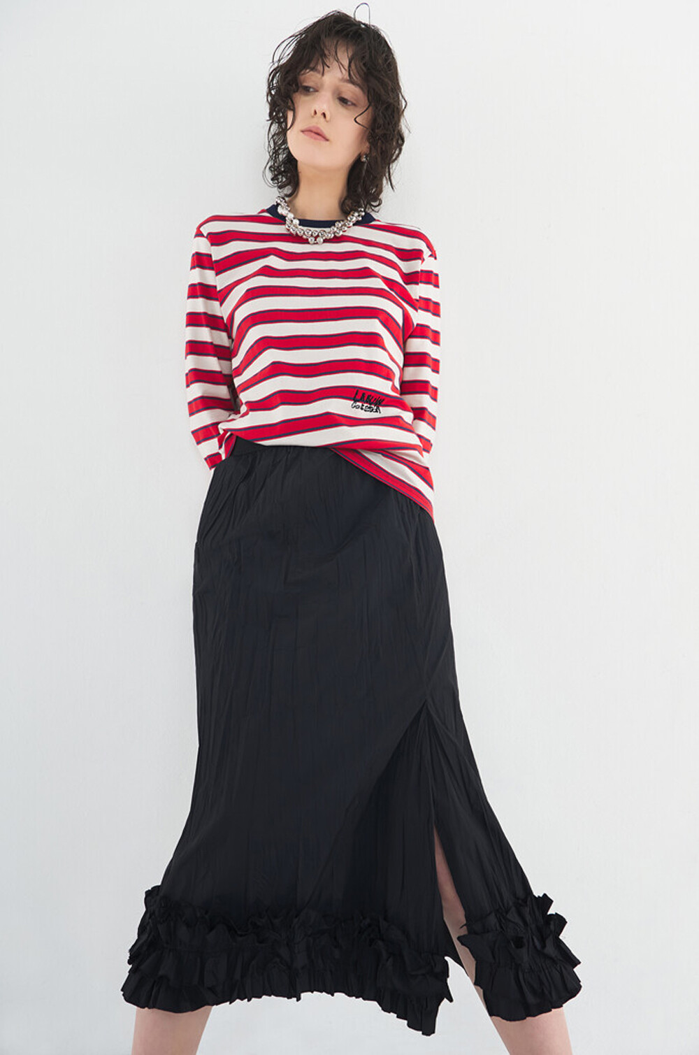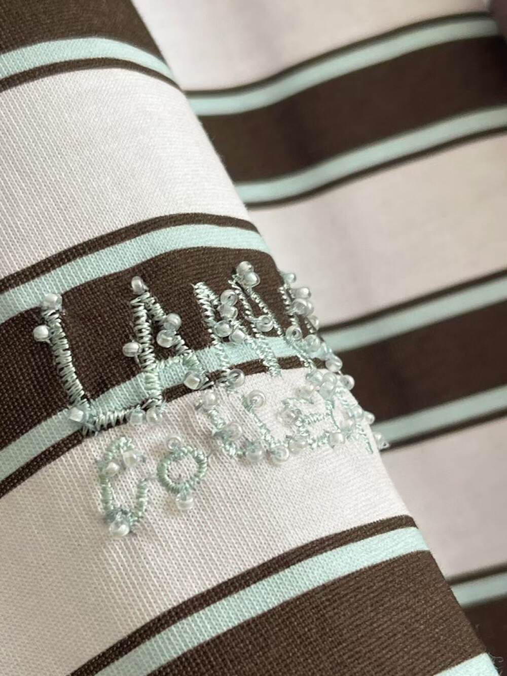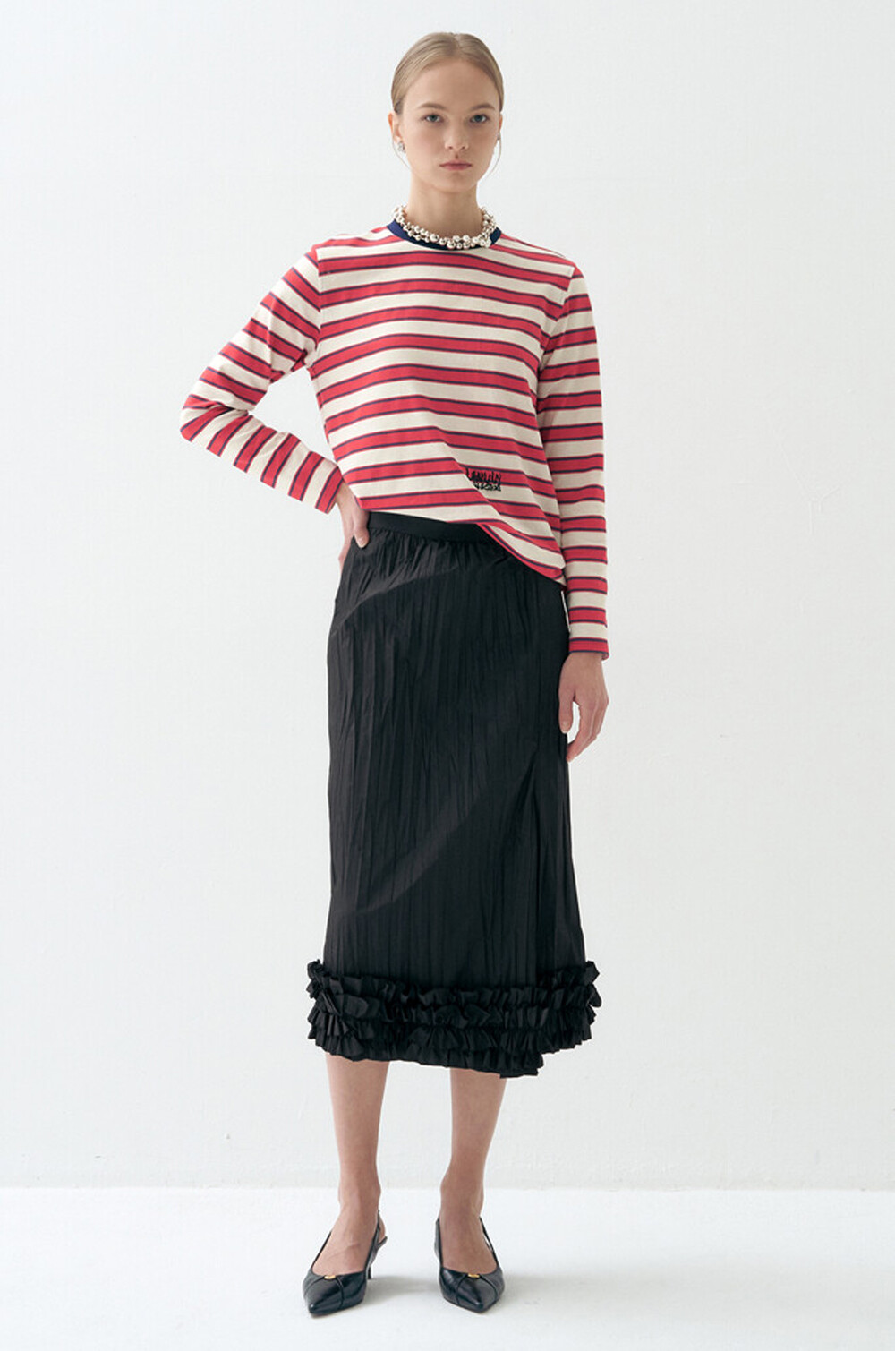 - 허리 한쪽에 로고 자수와 비즈 장식