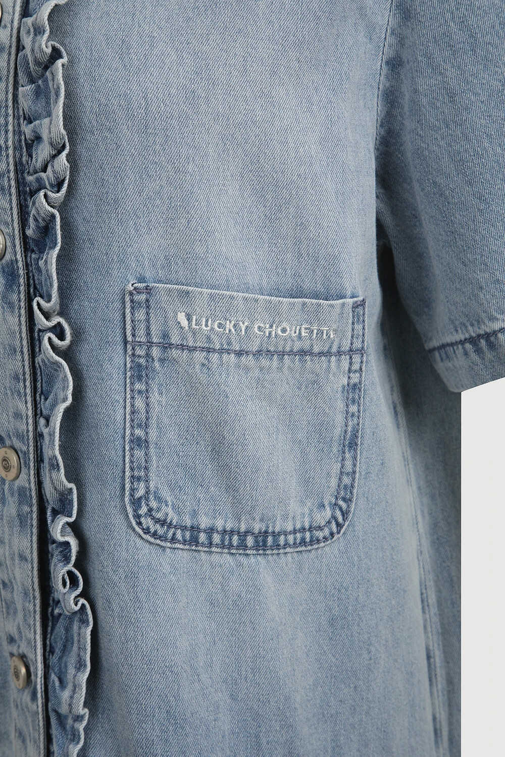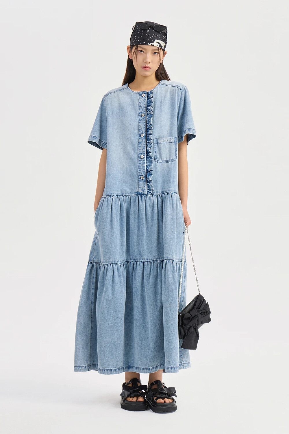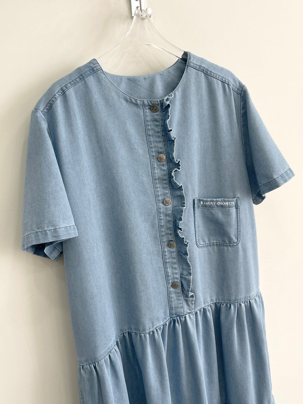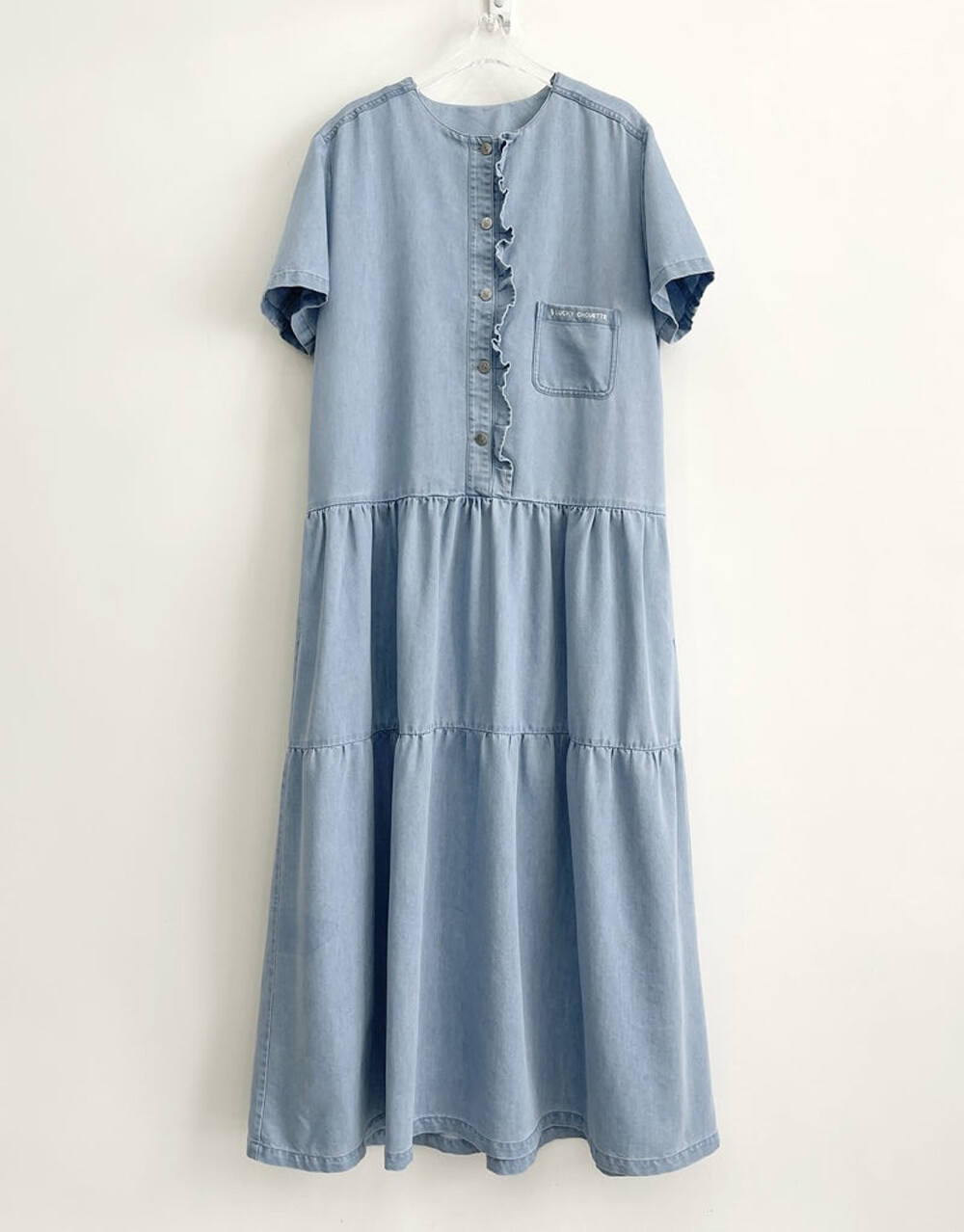 럭키슈에뜨 러플 포인트 데님 롱 드레스