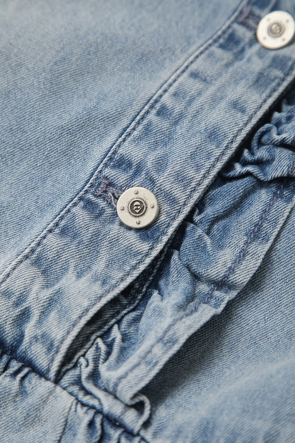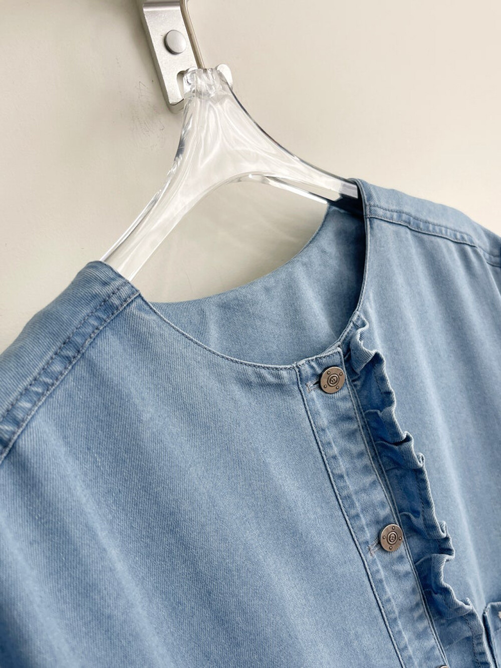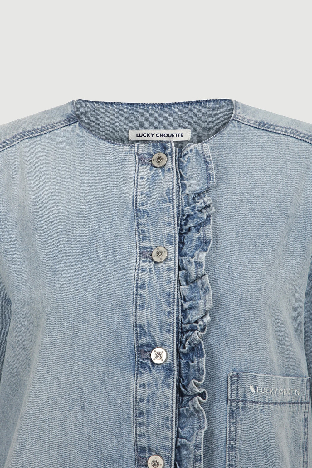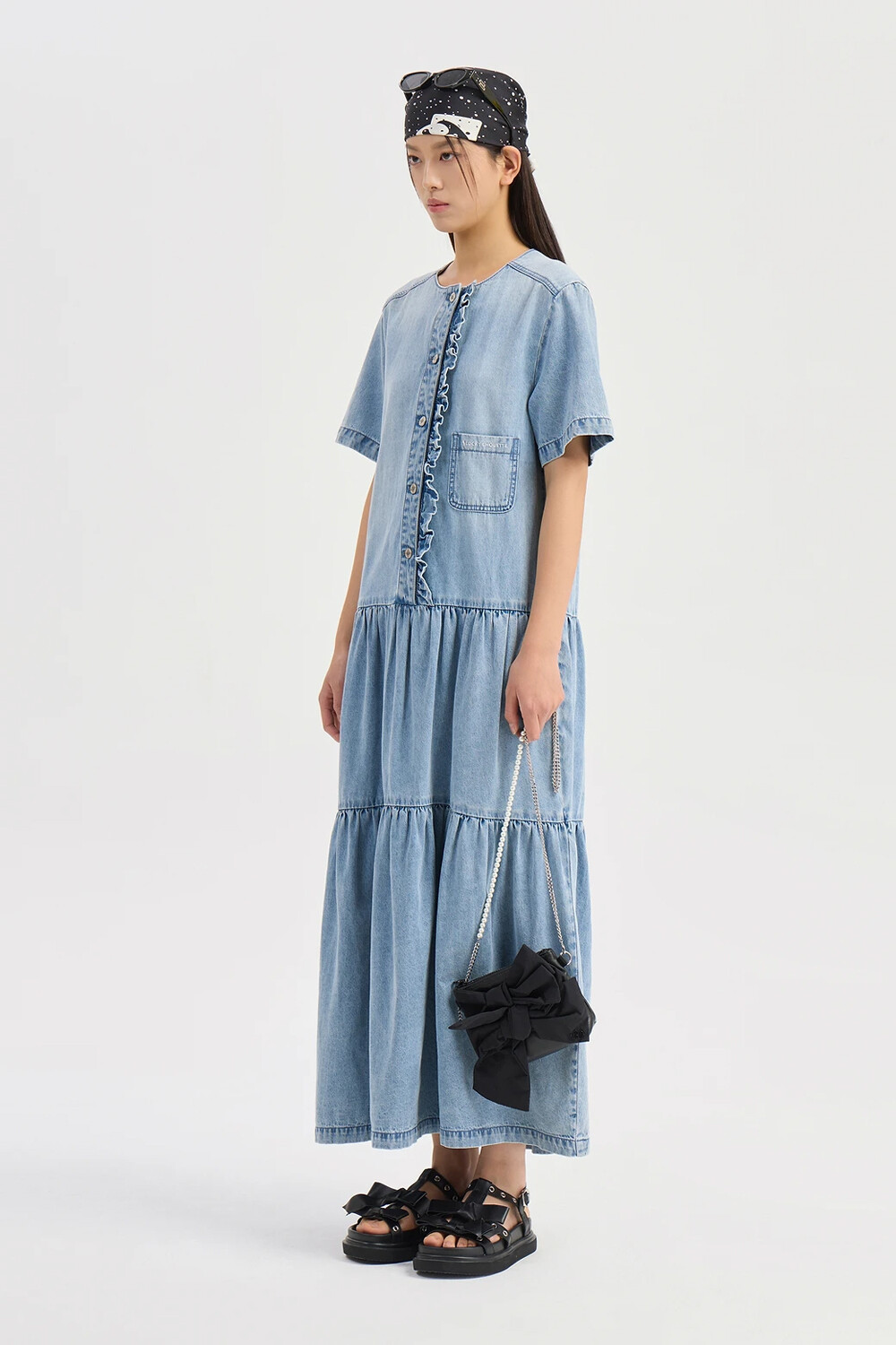 럭키슈에뜨 러플 포인트 데님 롱 드레스