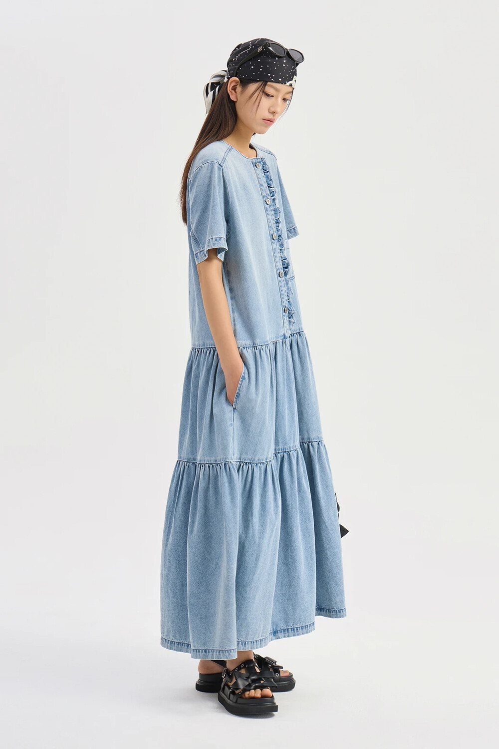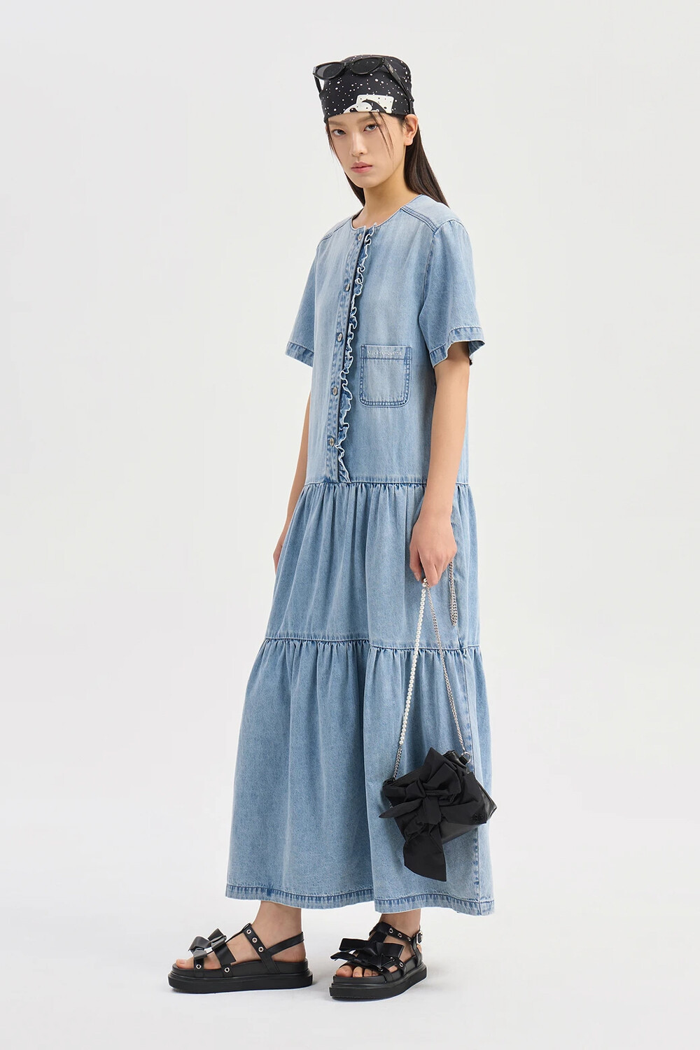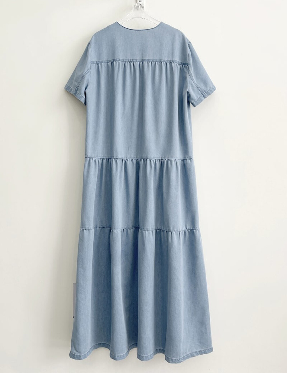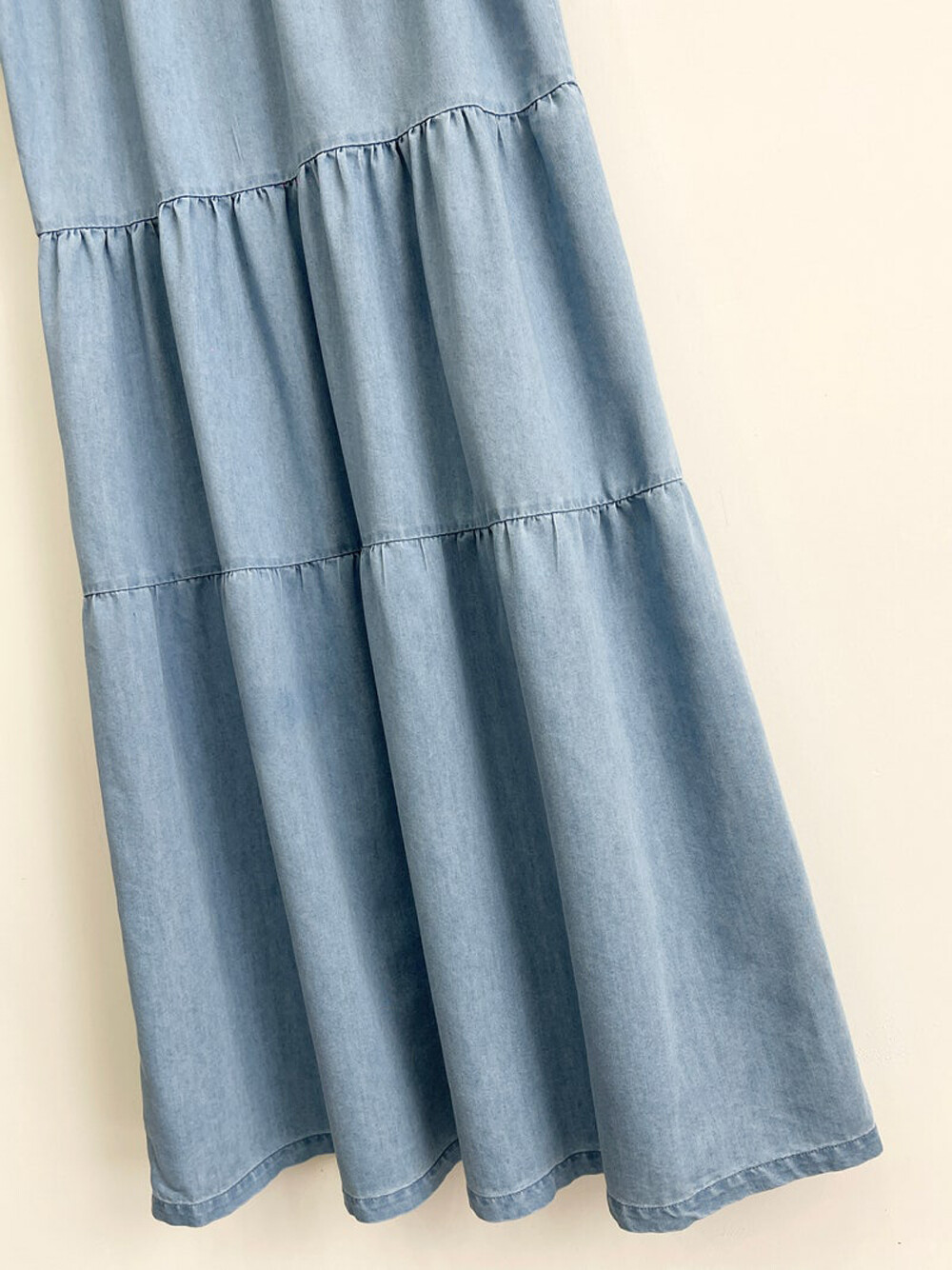 - 허리선 아래로 볼륨감이 있는 실루엣의 데님 롱 원피스.