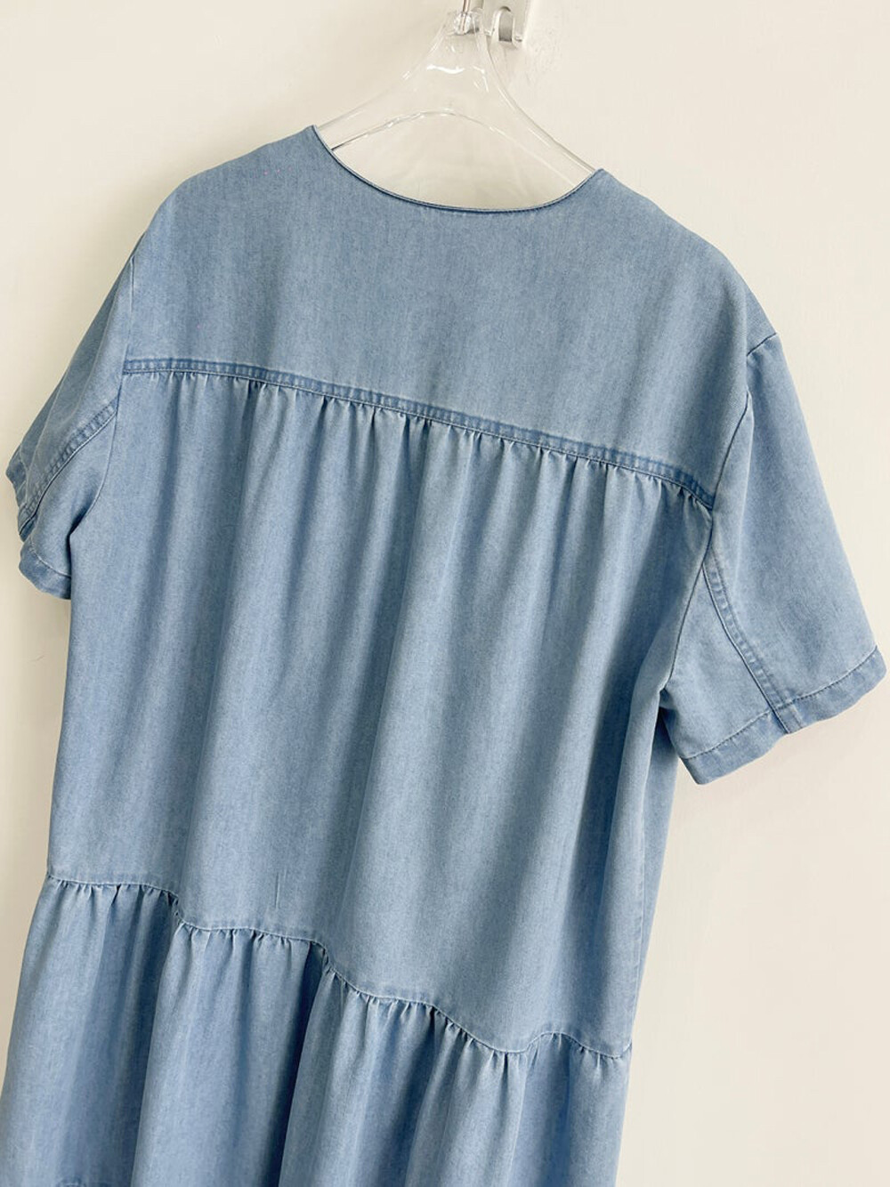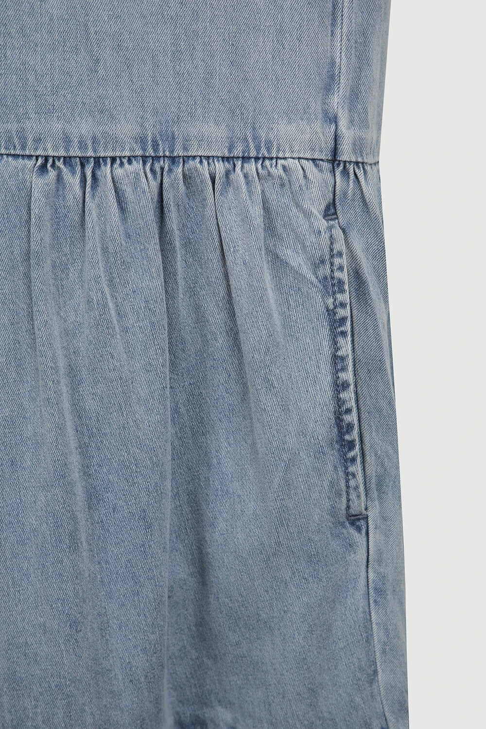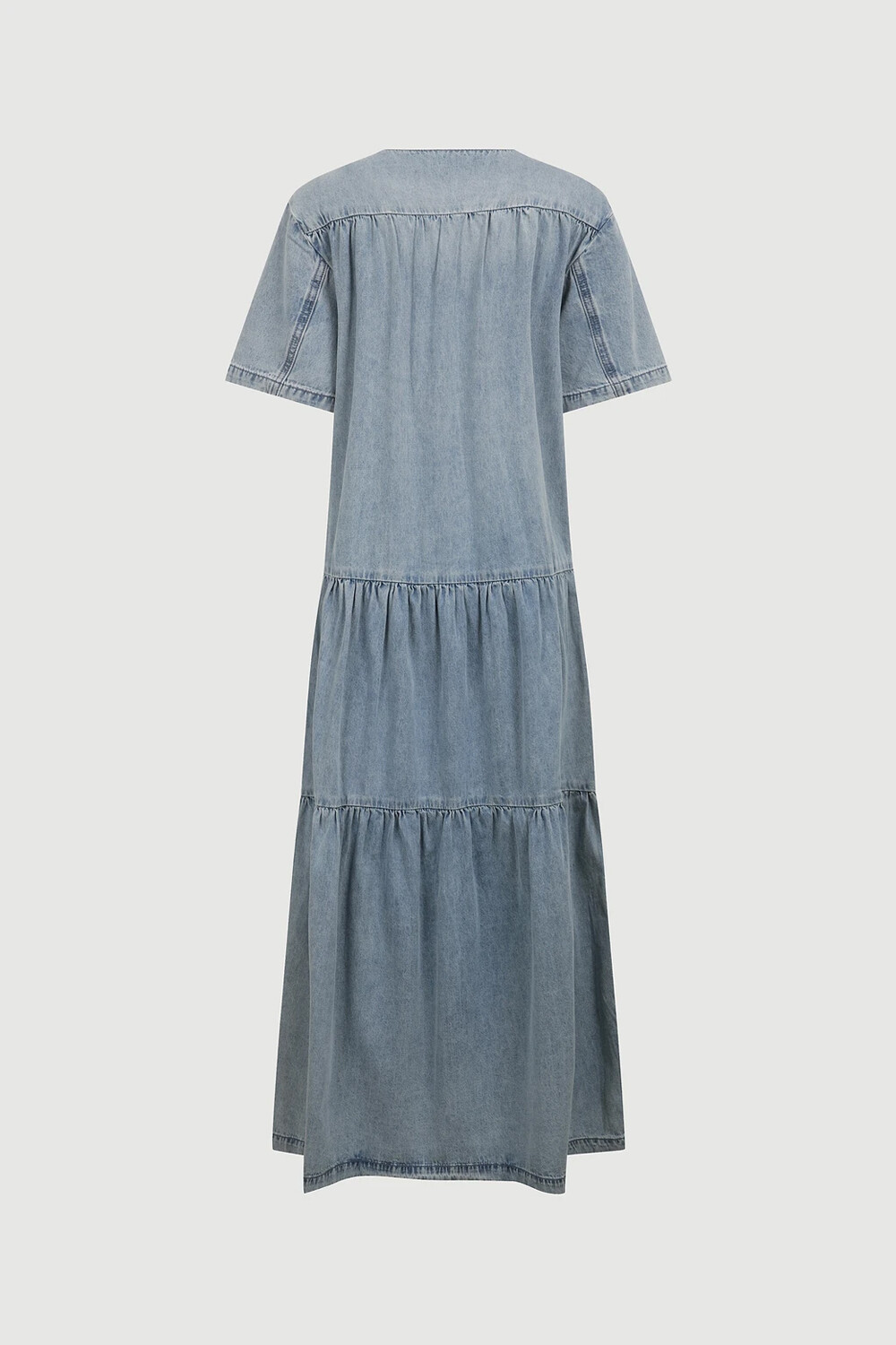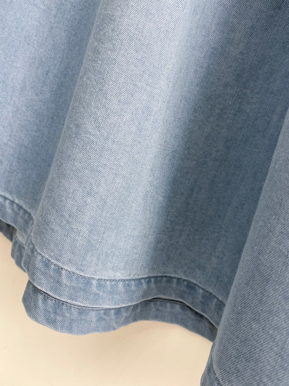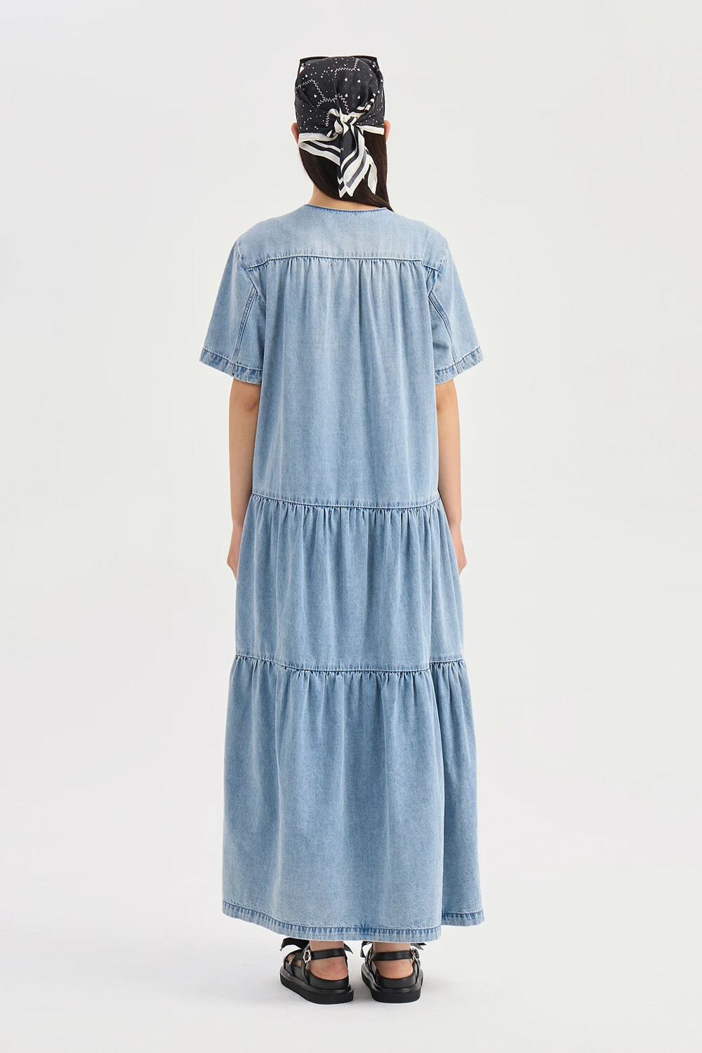 - 허리선 아래로 볼륨감이 있는 실루엣의 데님 롱 원피스.