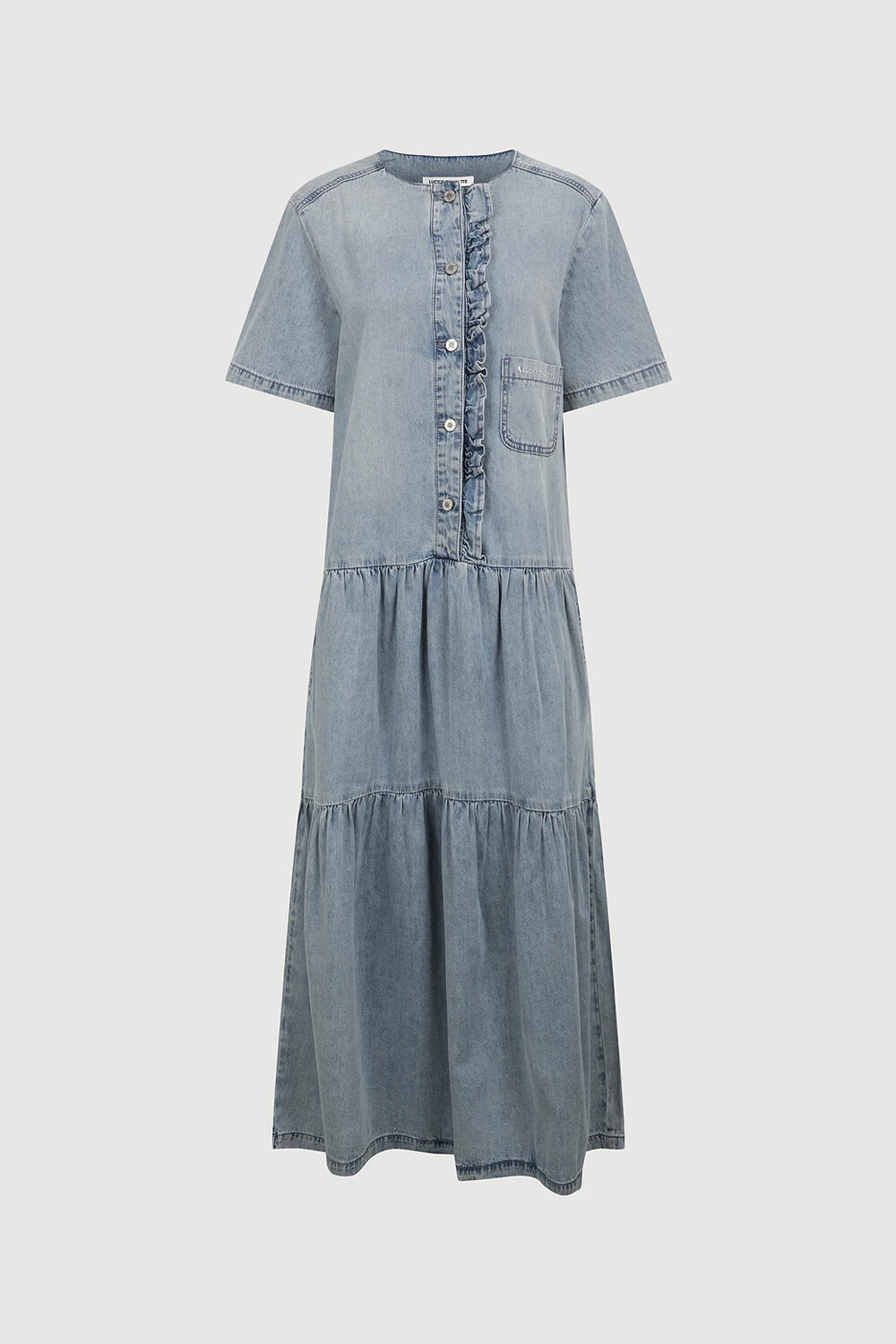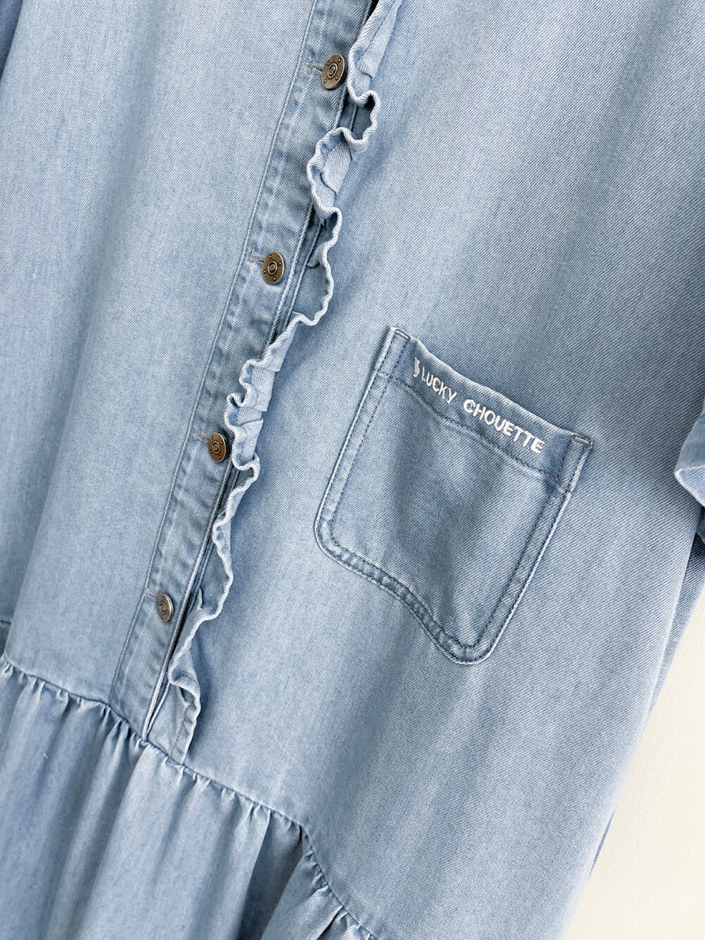 LUCKY CHOUETTE. Ruffle Point Denim Long Dress