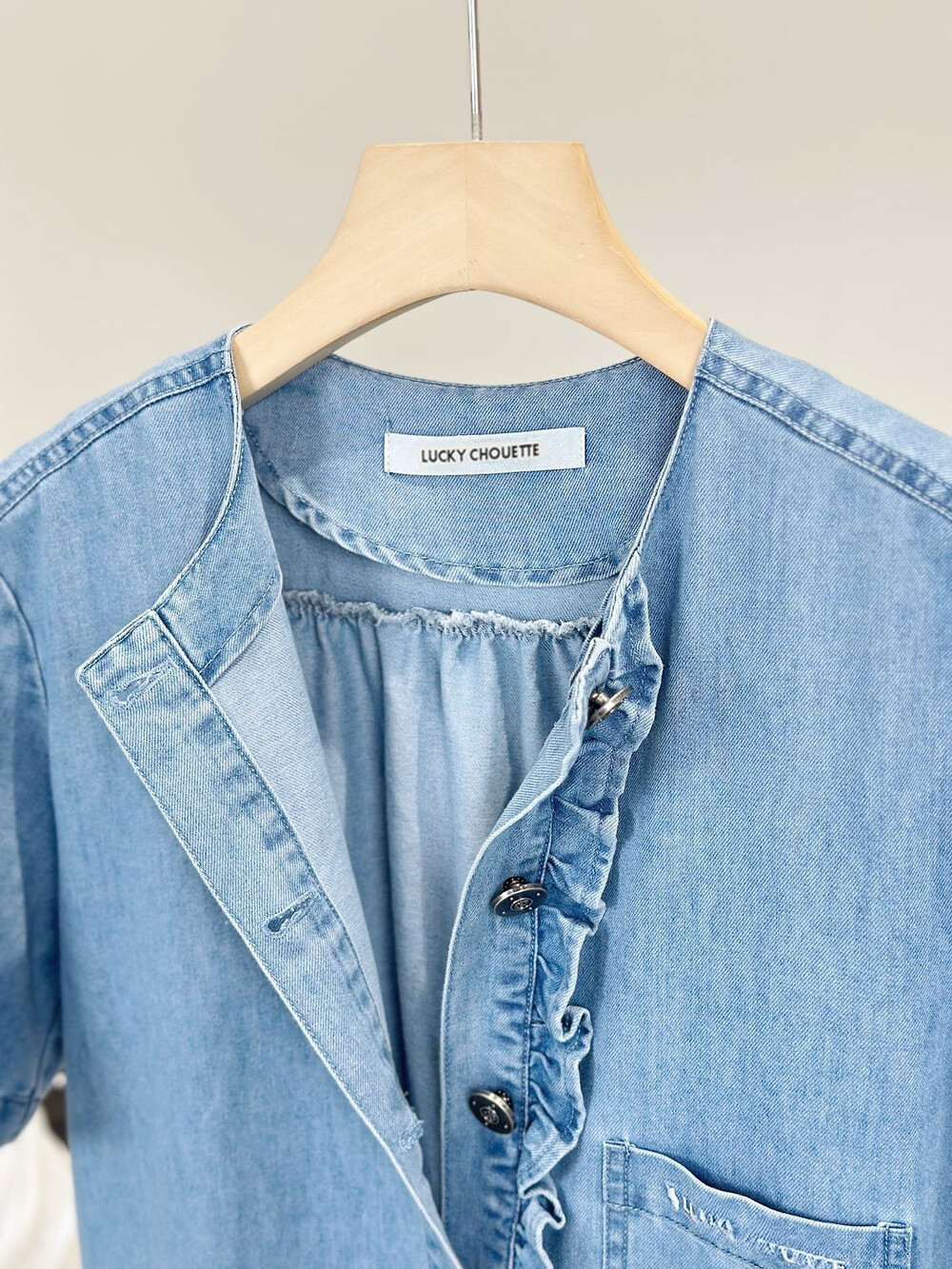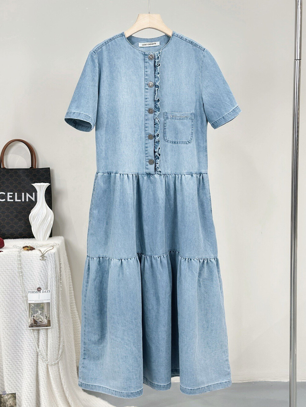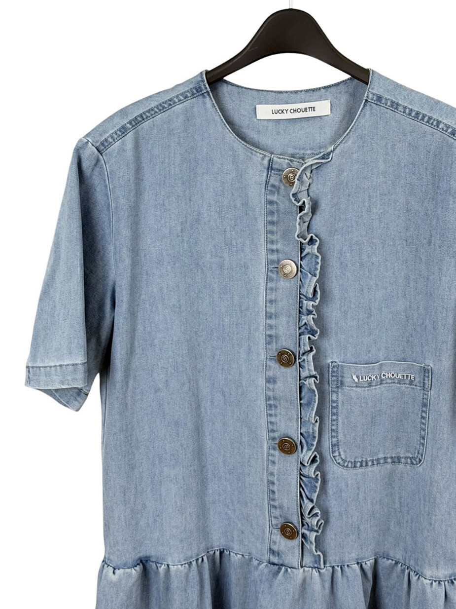 럭키슈에뜨 러플 포인트 데님 롱 드레스