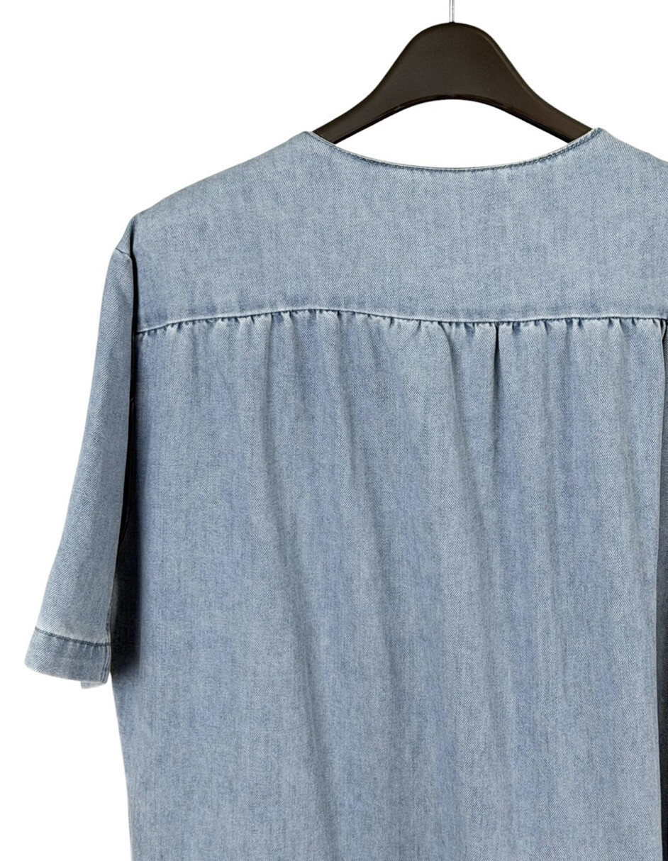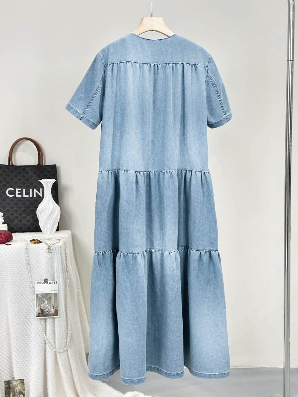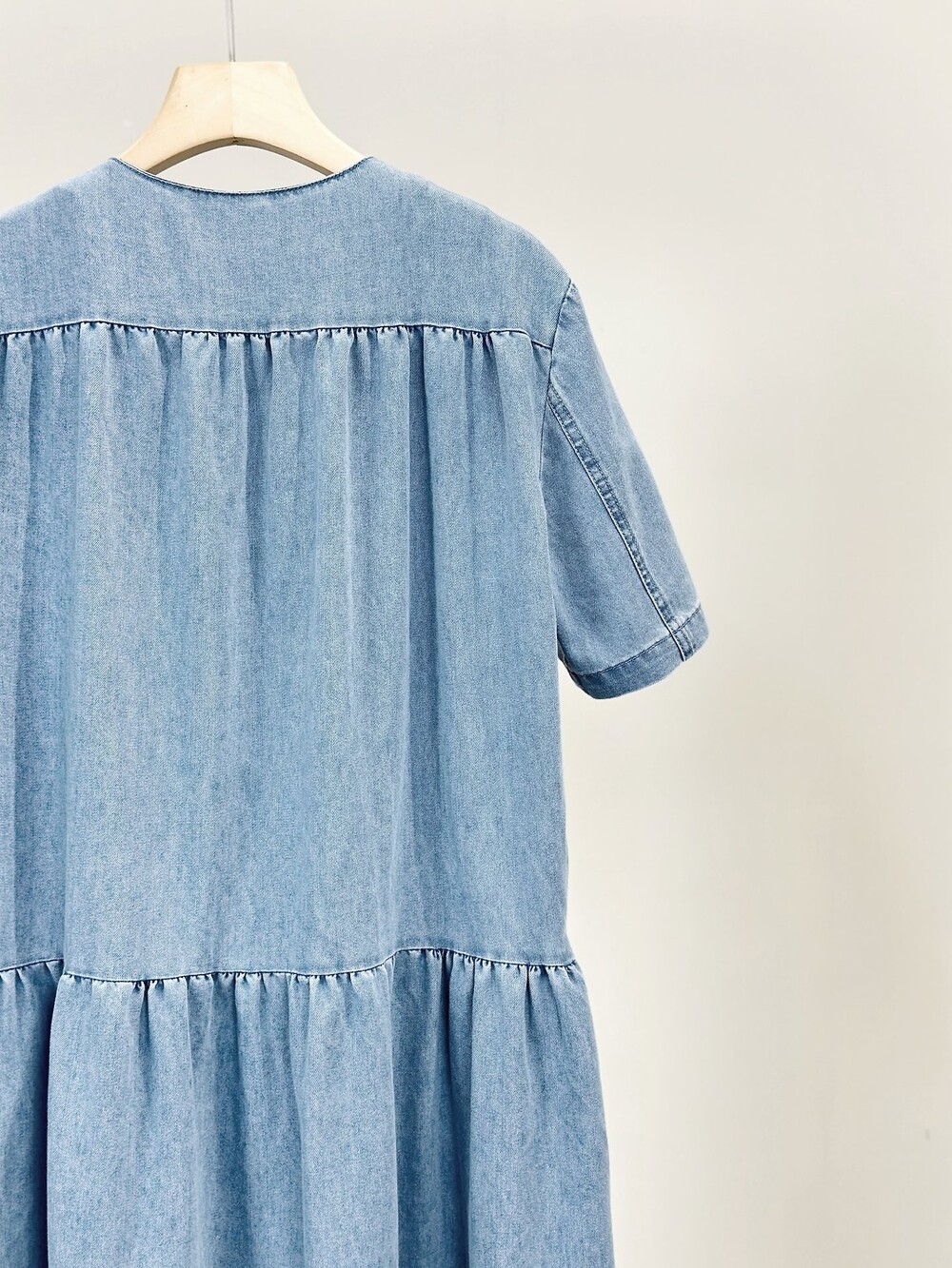 - 허리선 아래로 볼륨감이 있는 실루엣의 데님 롱 원피스.