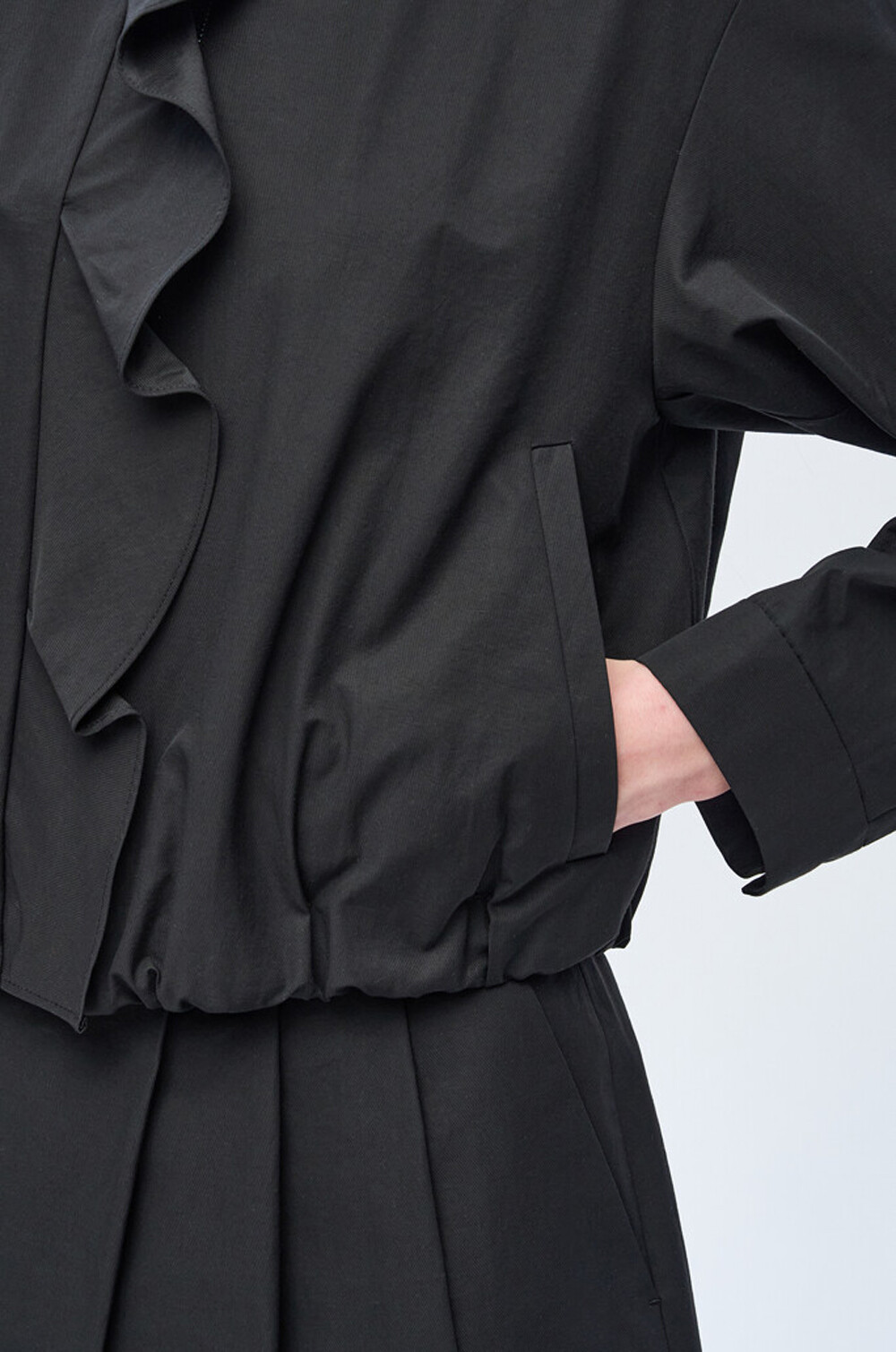 - 앞면에 지퍼 클로징과 러플 패널