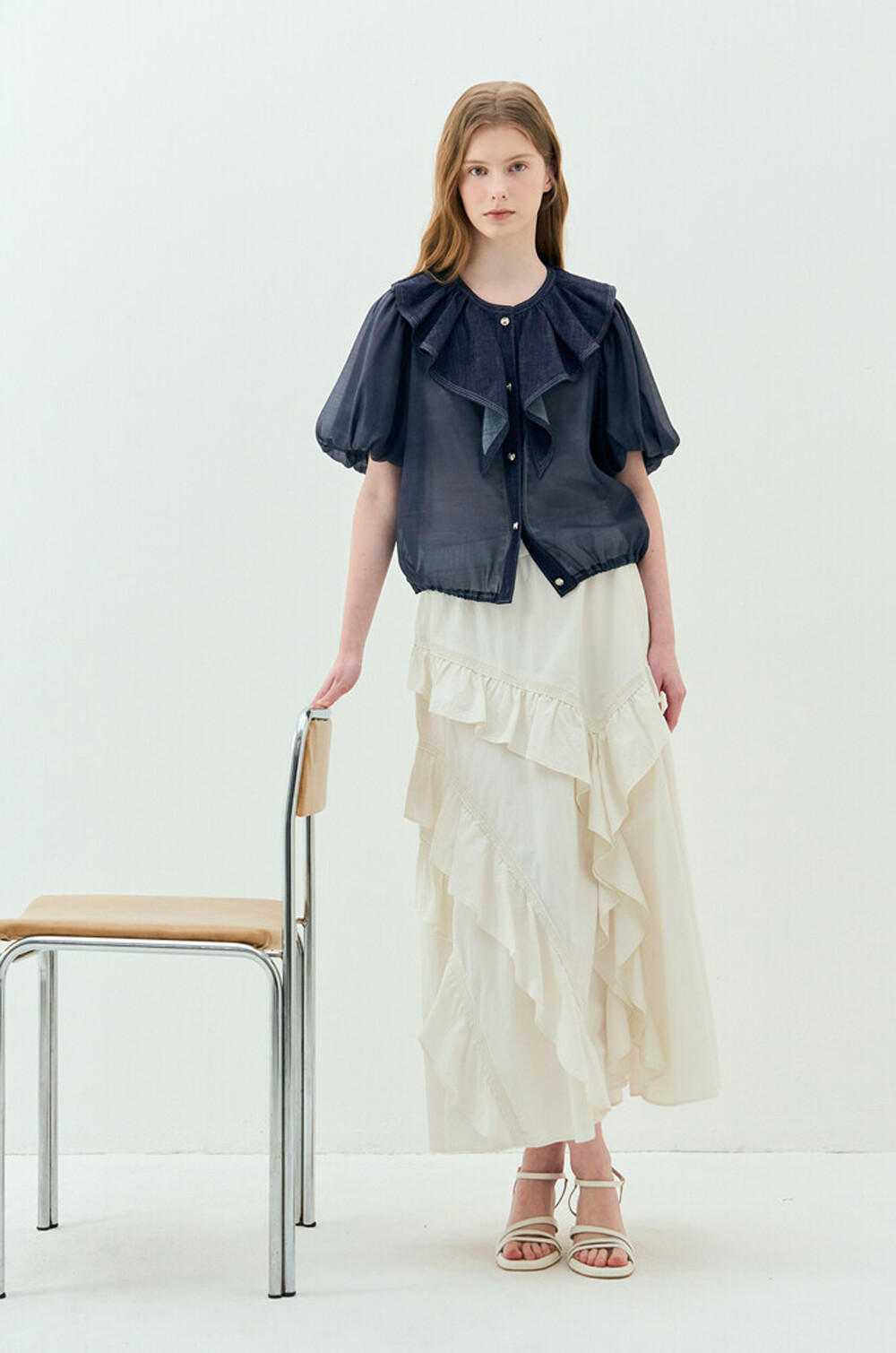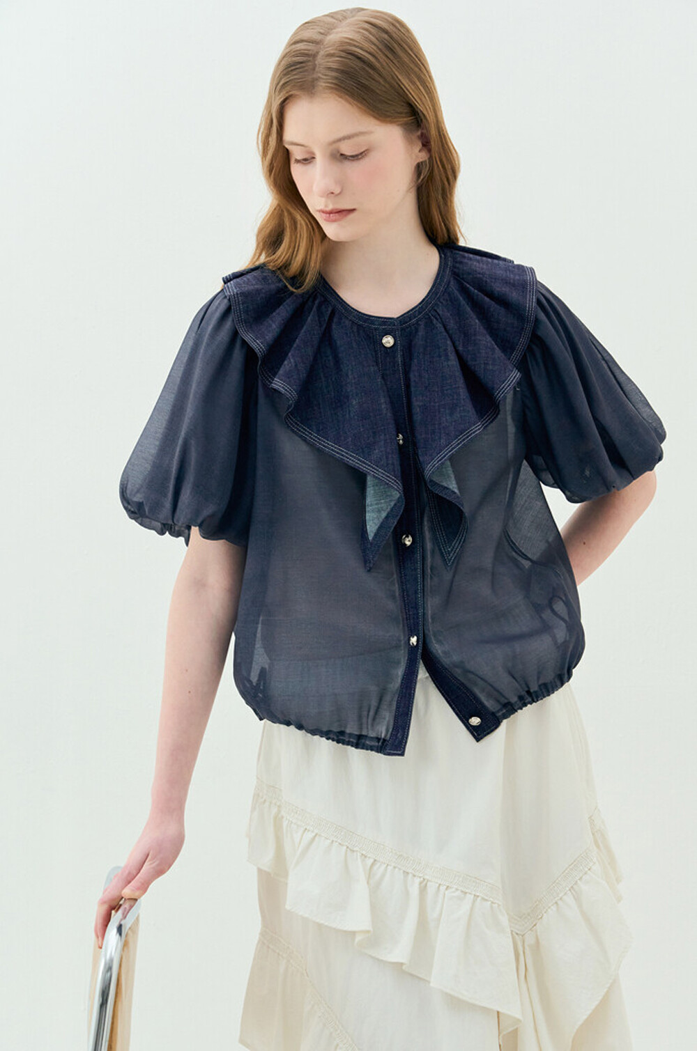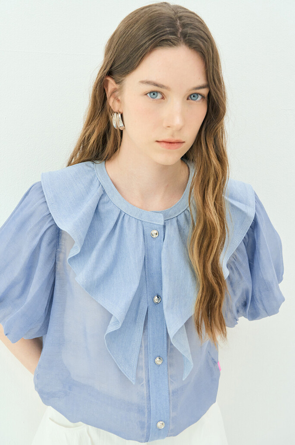 O'2nd. Denim Like Sheer Ruffle Blouse