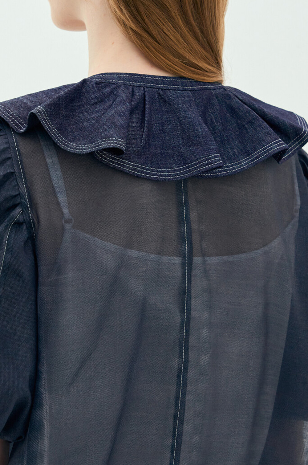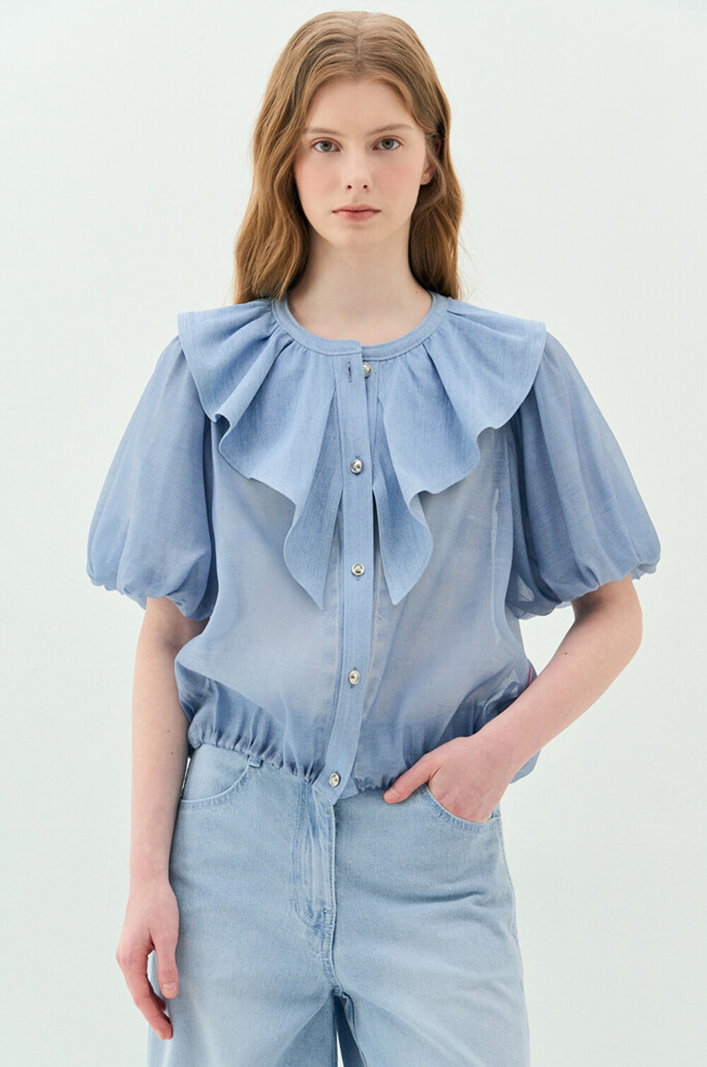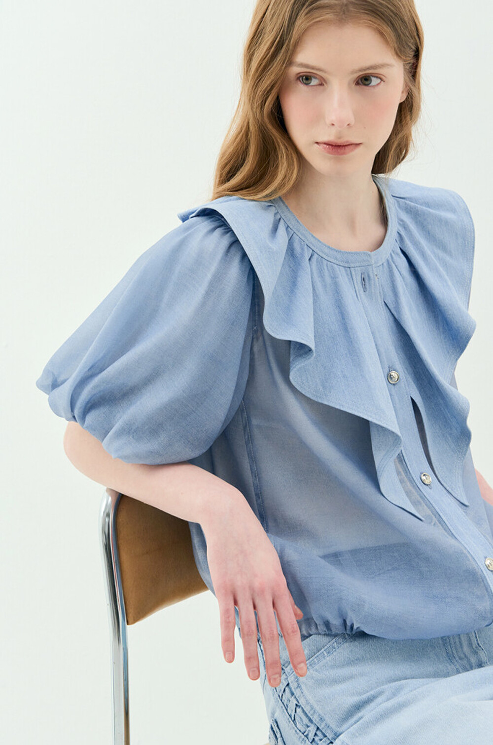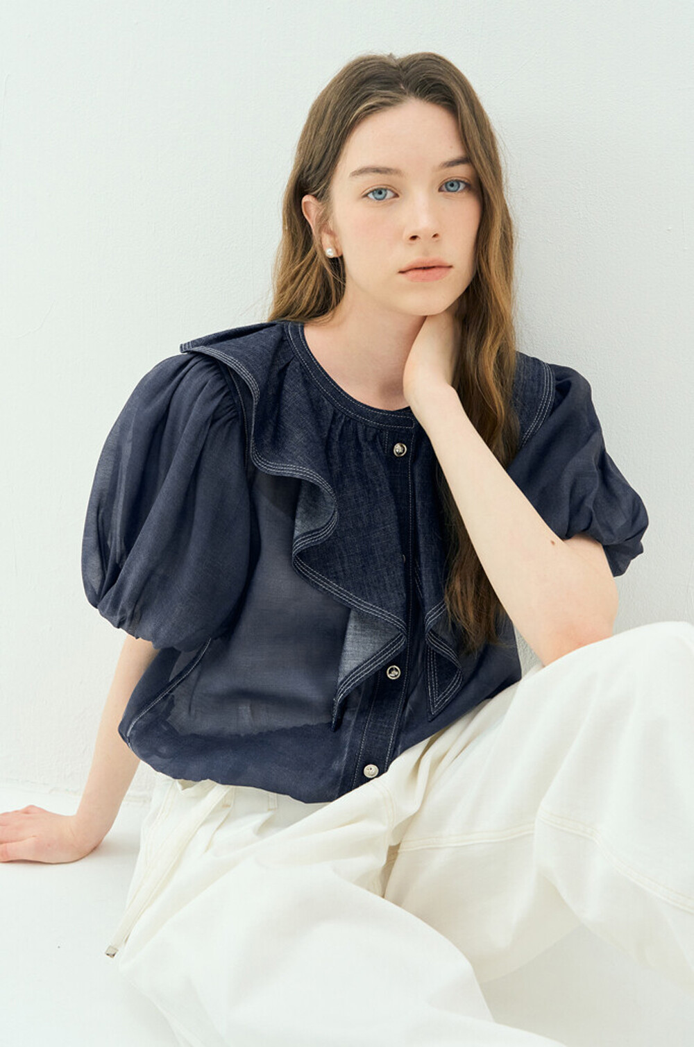 오즈세컨 데님 라이크 시어 러플 블라우스