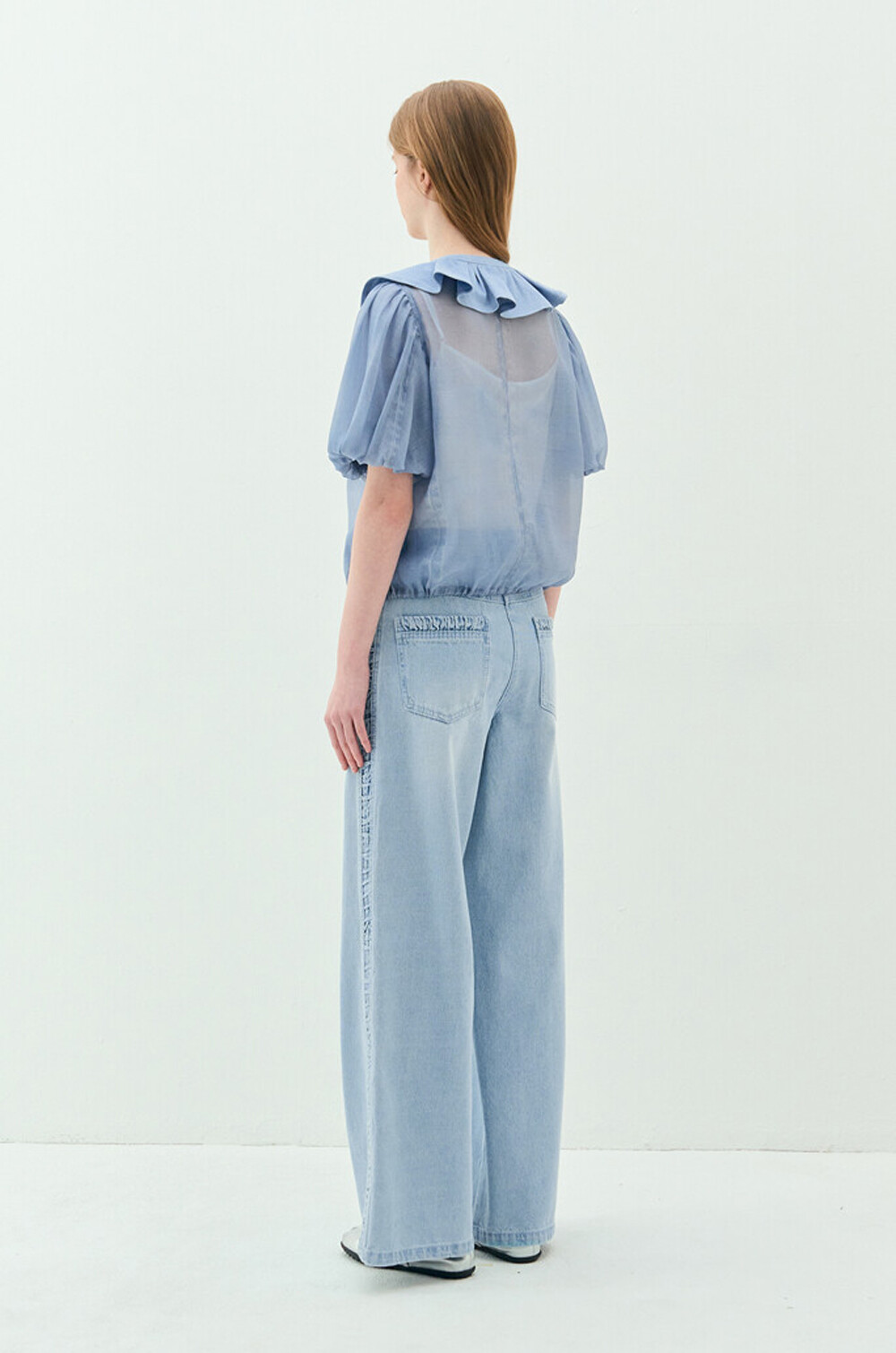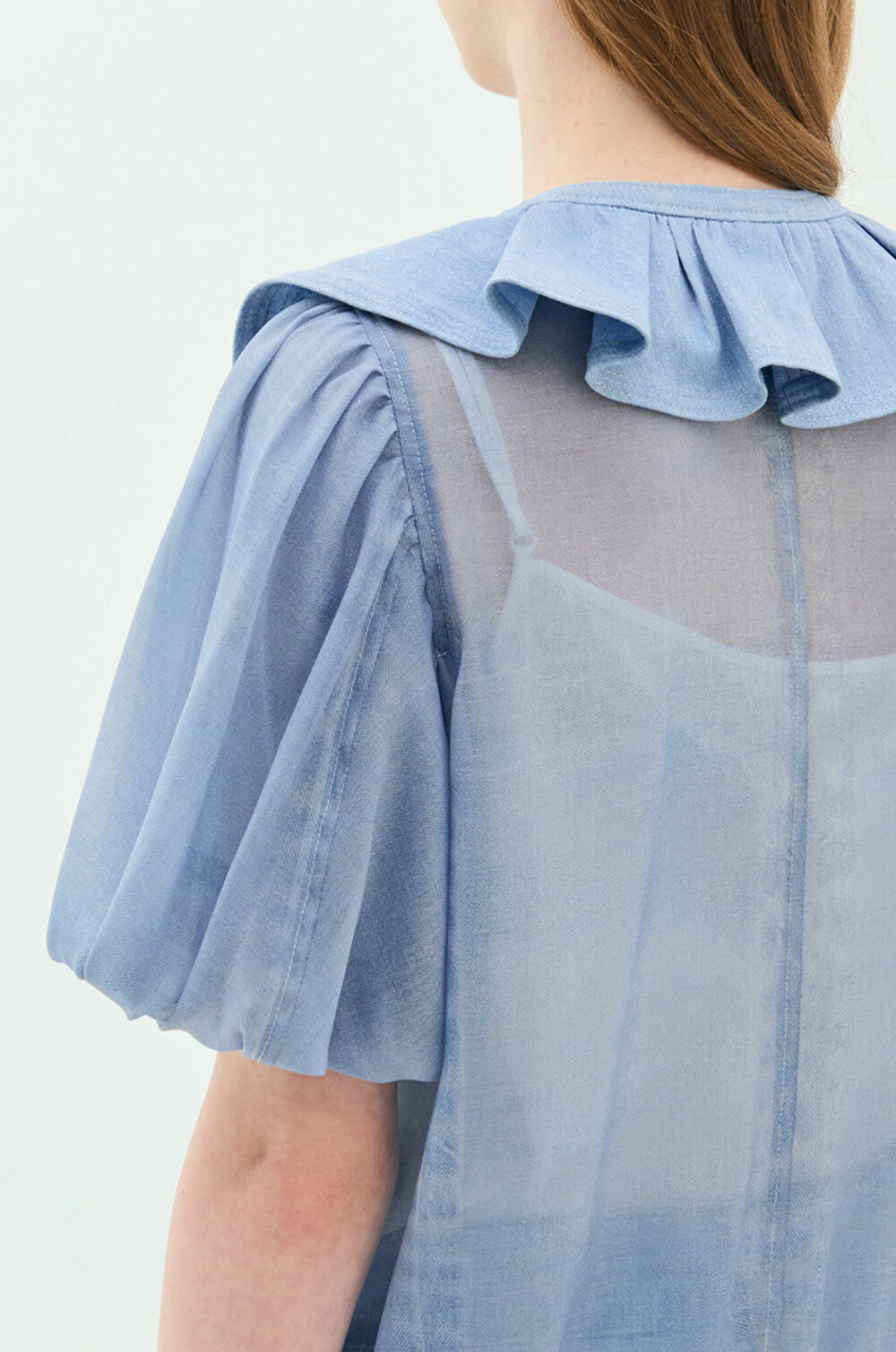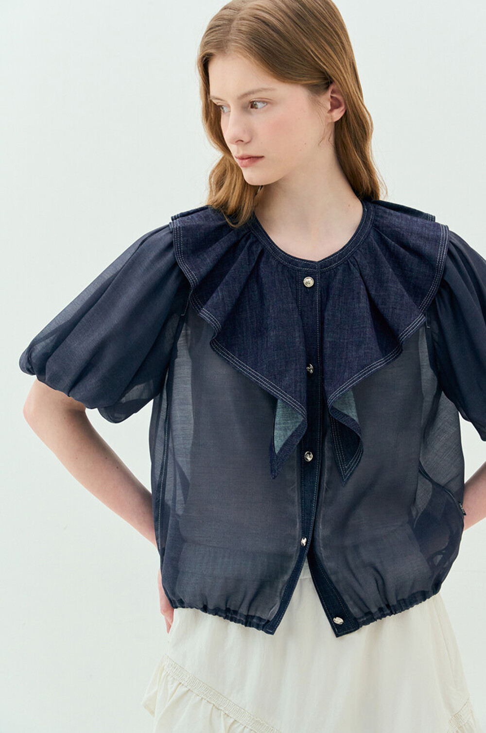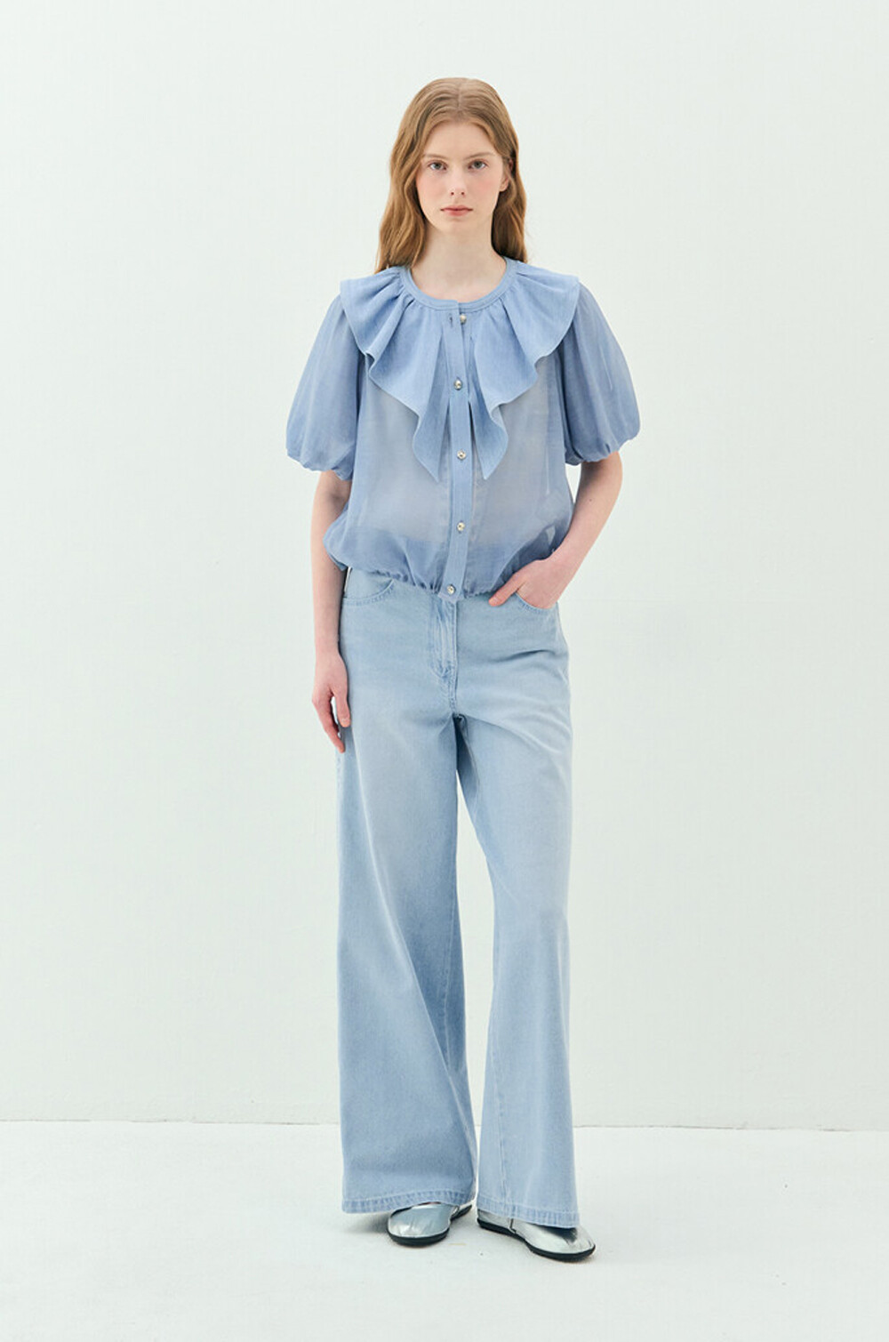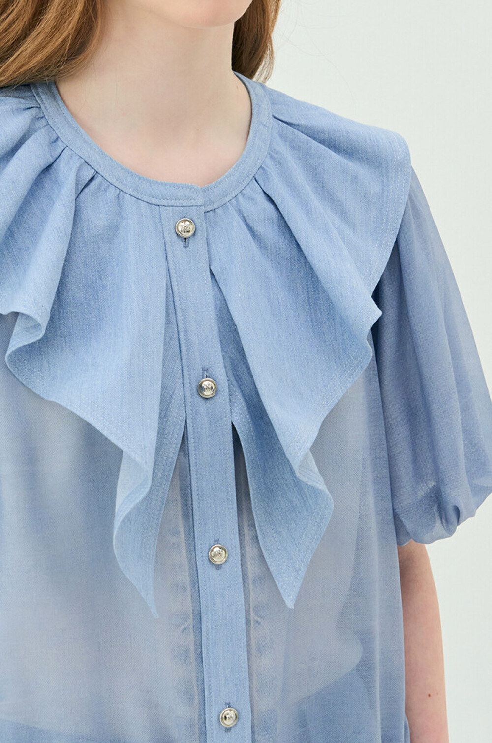 오즈세컨 데님 라이크 시어 러플 블라우스
