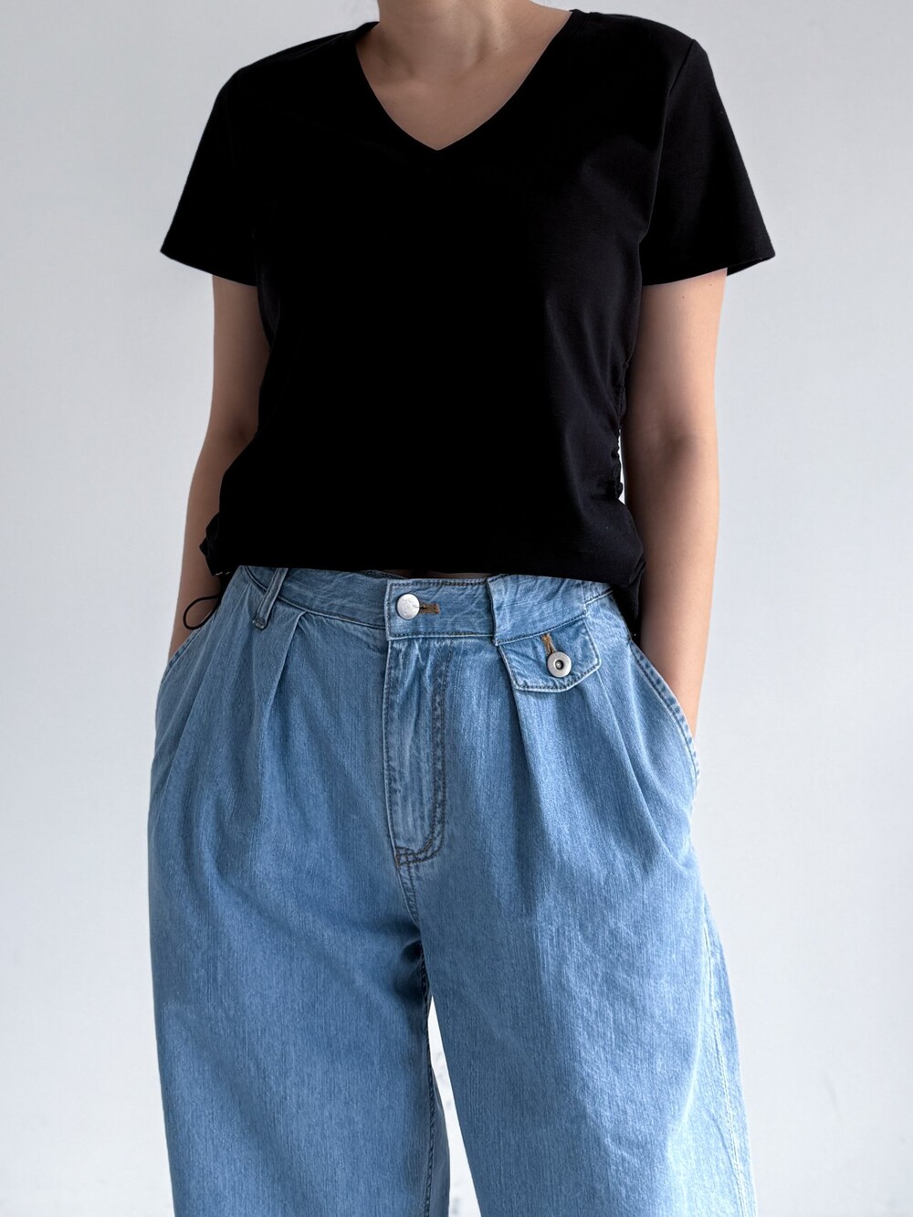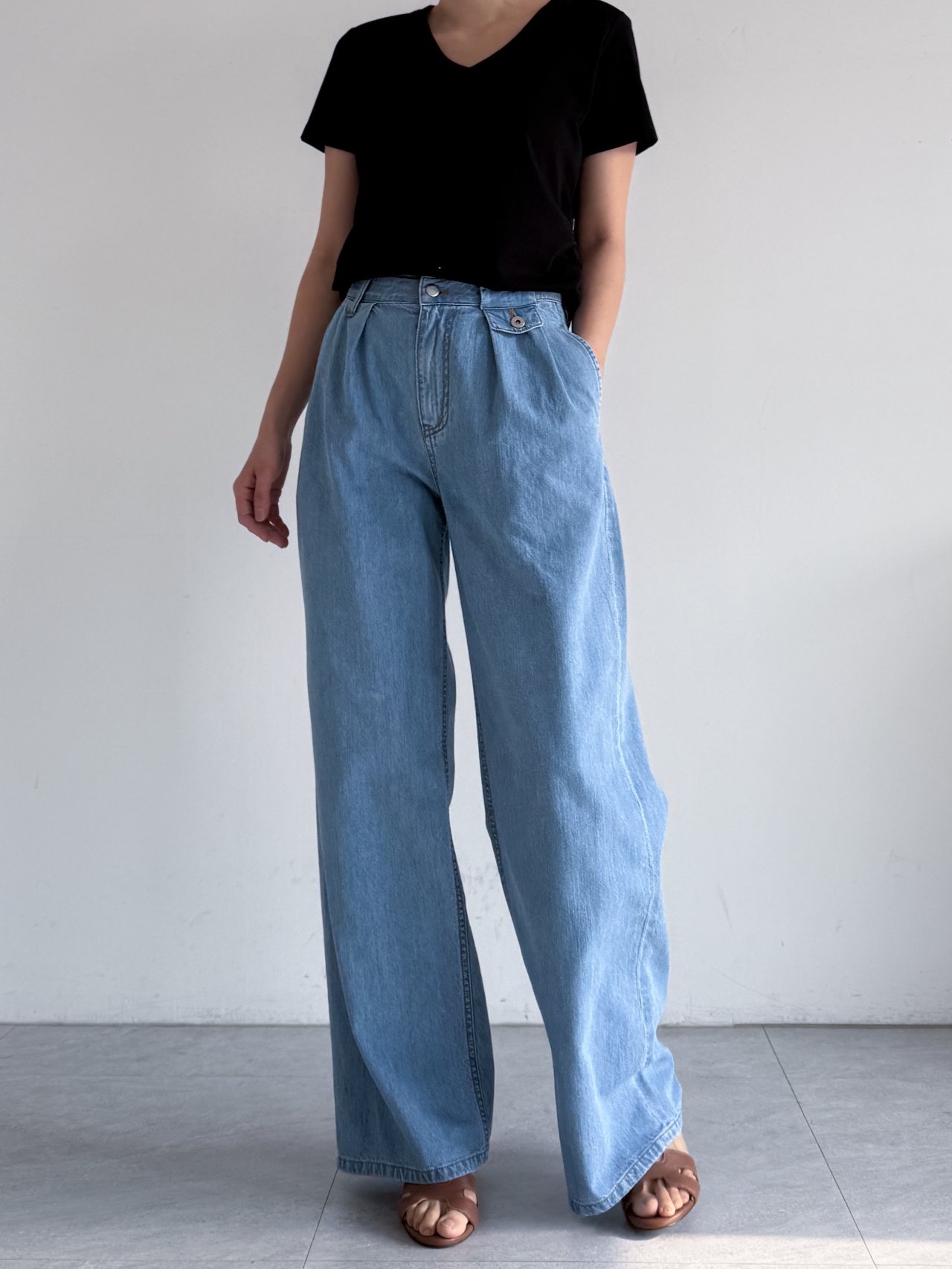 플랩 포켓 디테일 핀턱 와이드 데님 팬츠