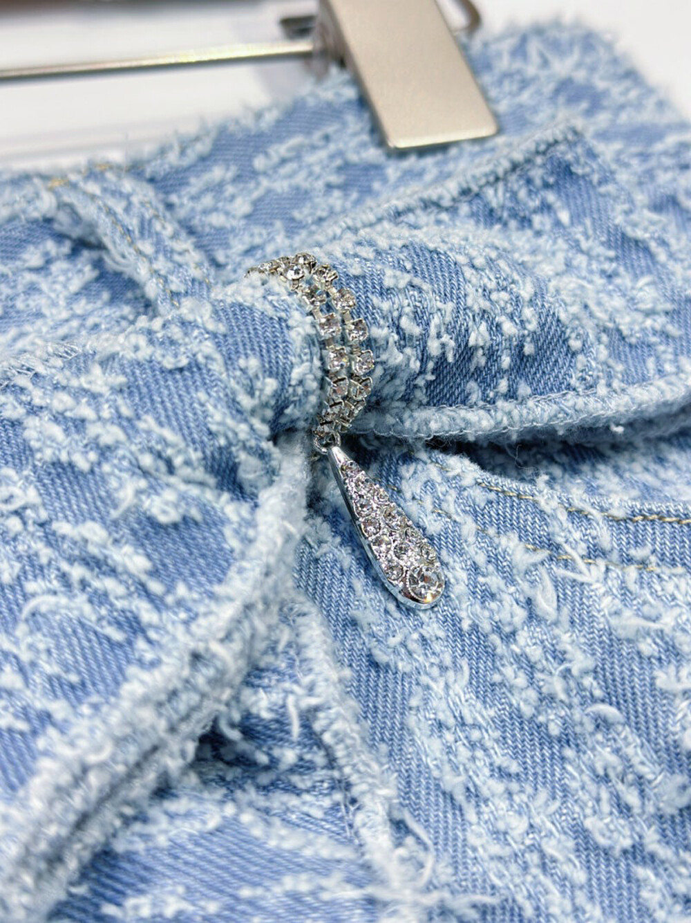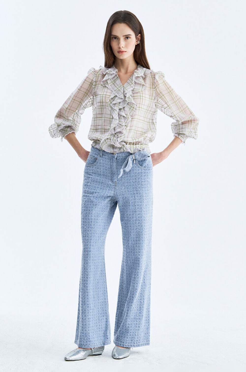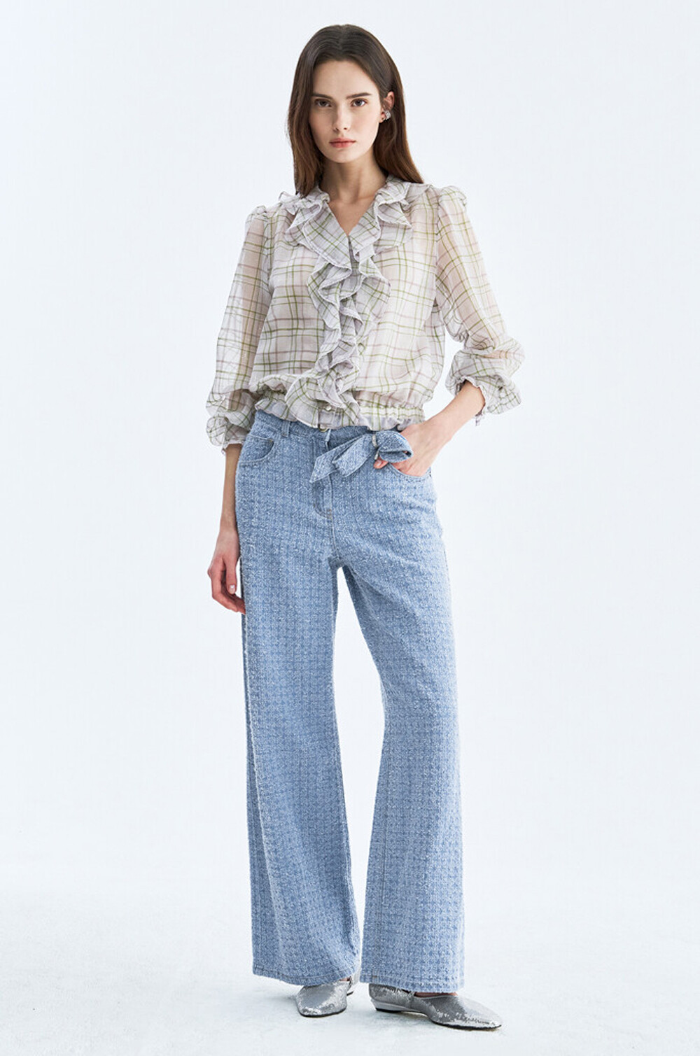 오브제 디스트로이드 와이드 데님 팬츠 & 리본 브로치