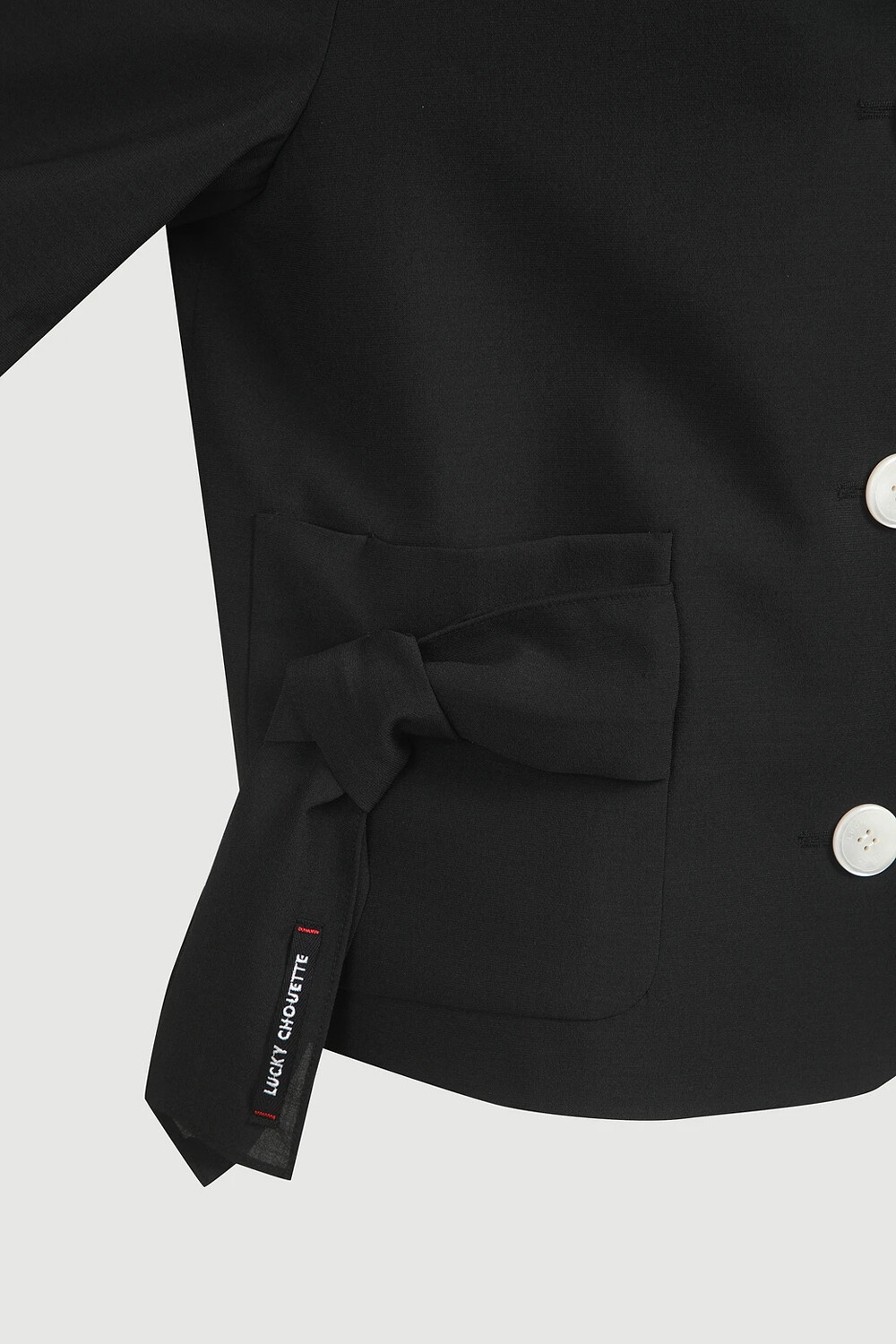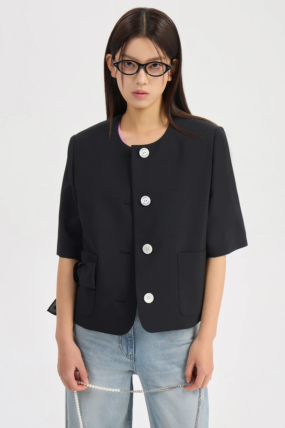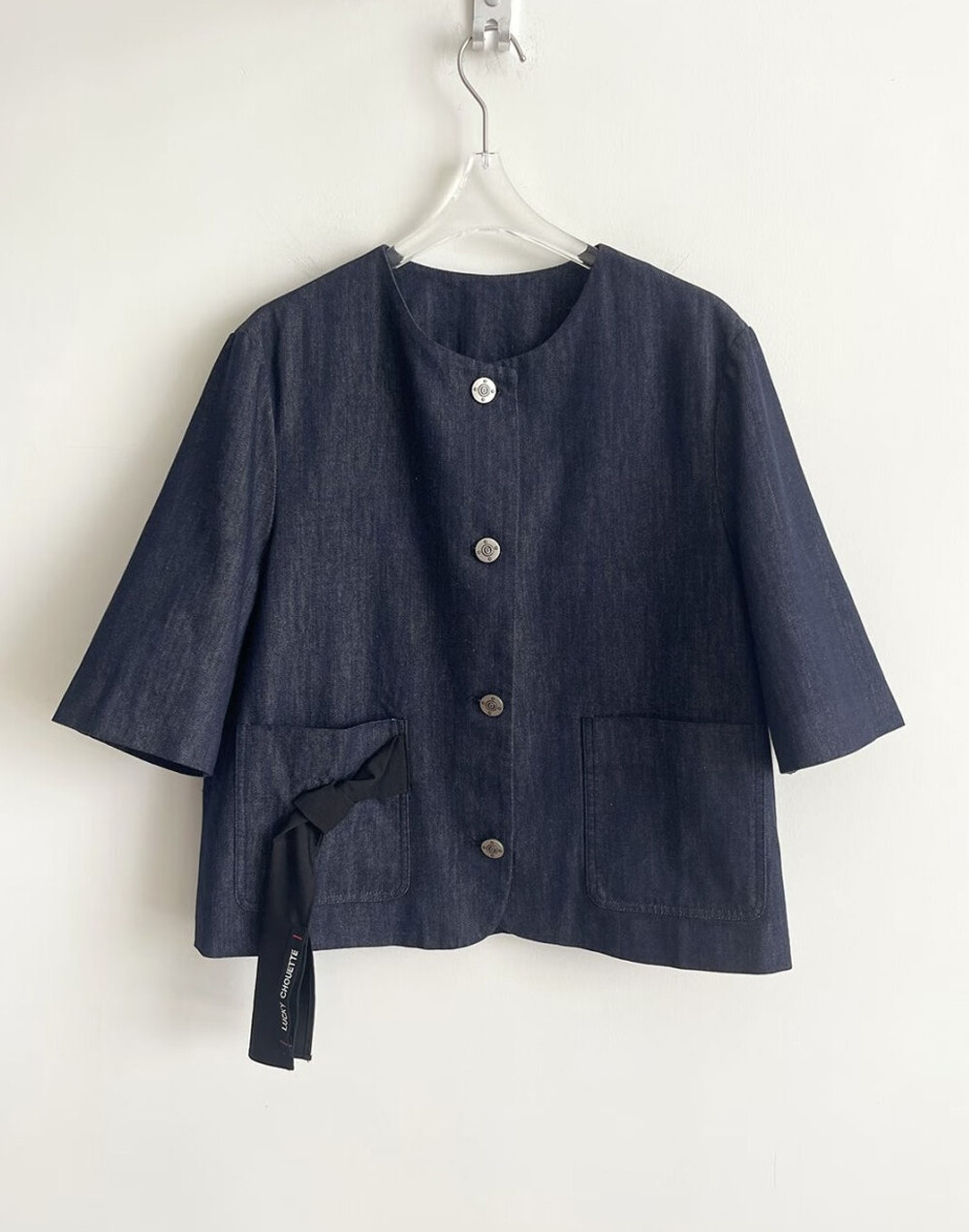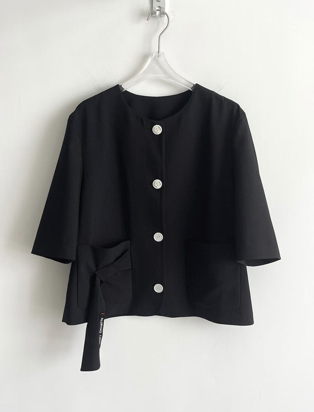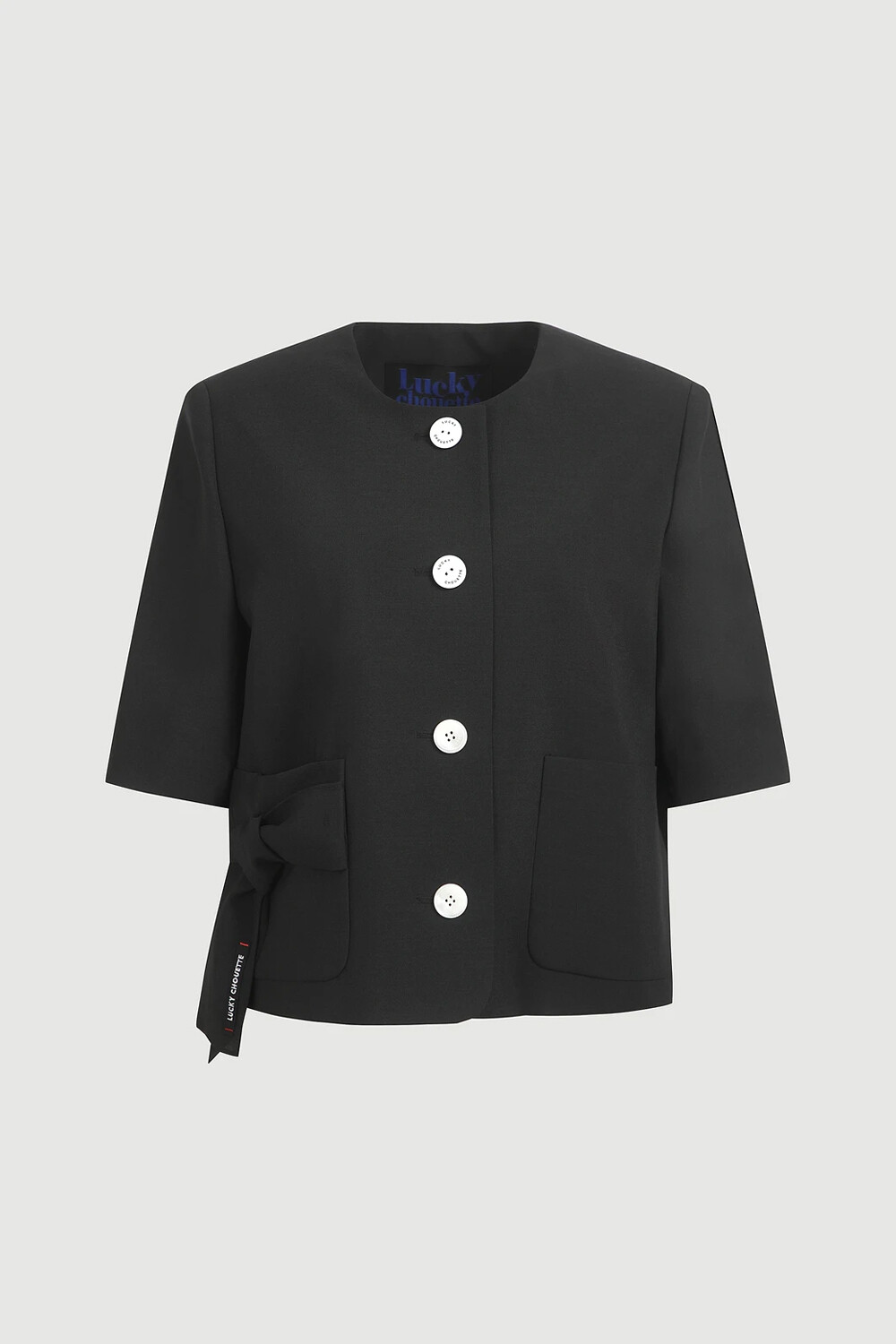 럭키슈에뜨 라운드 넥 리본 포인트 반팔 재킷