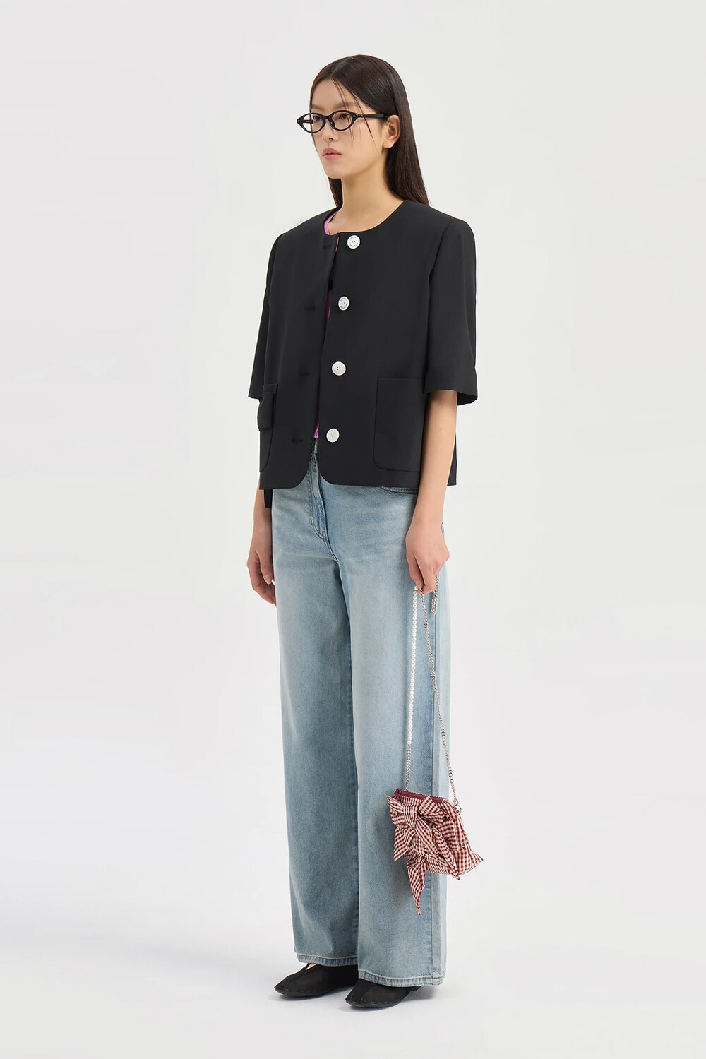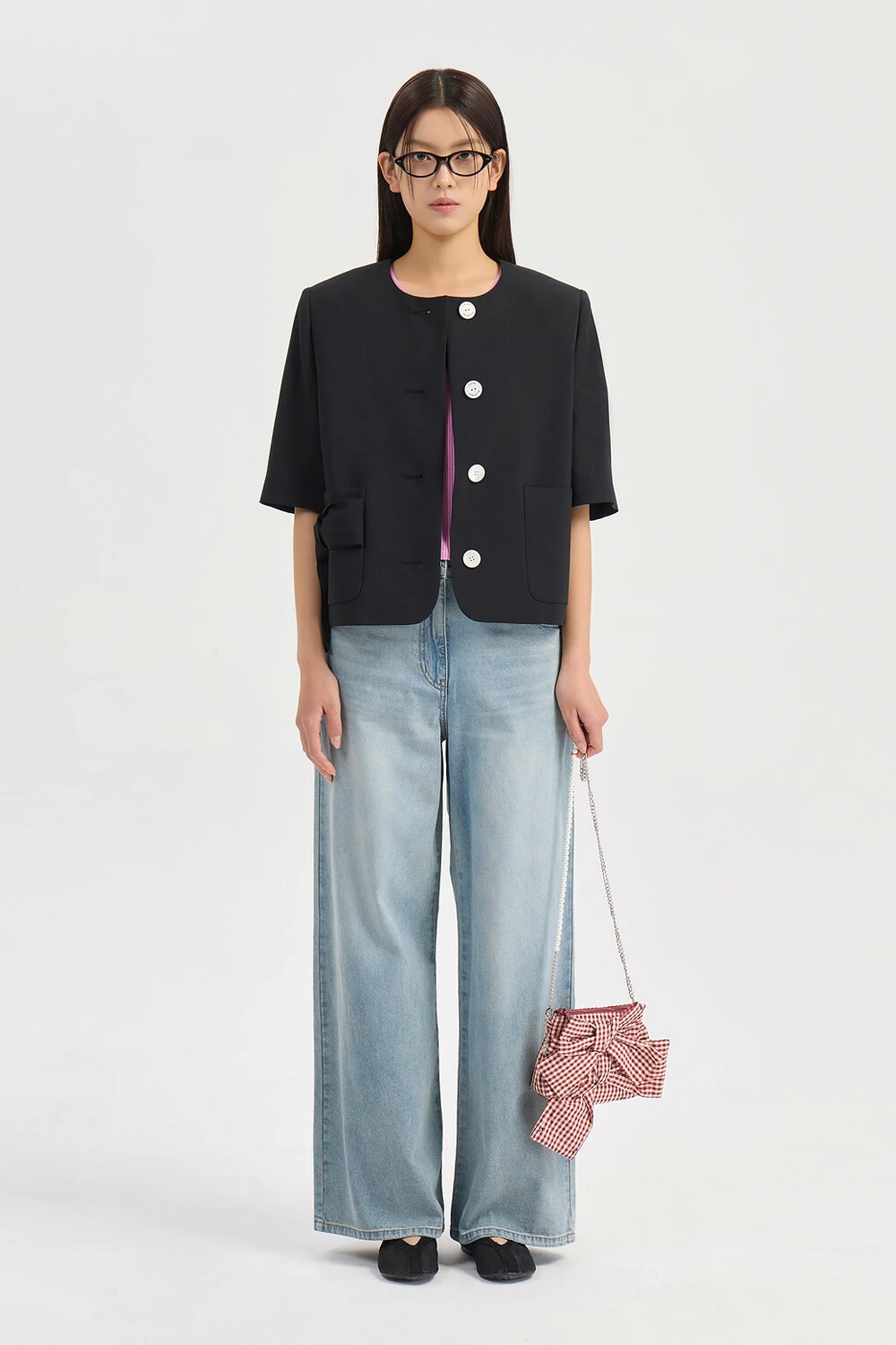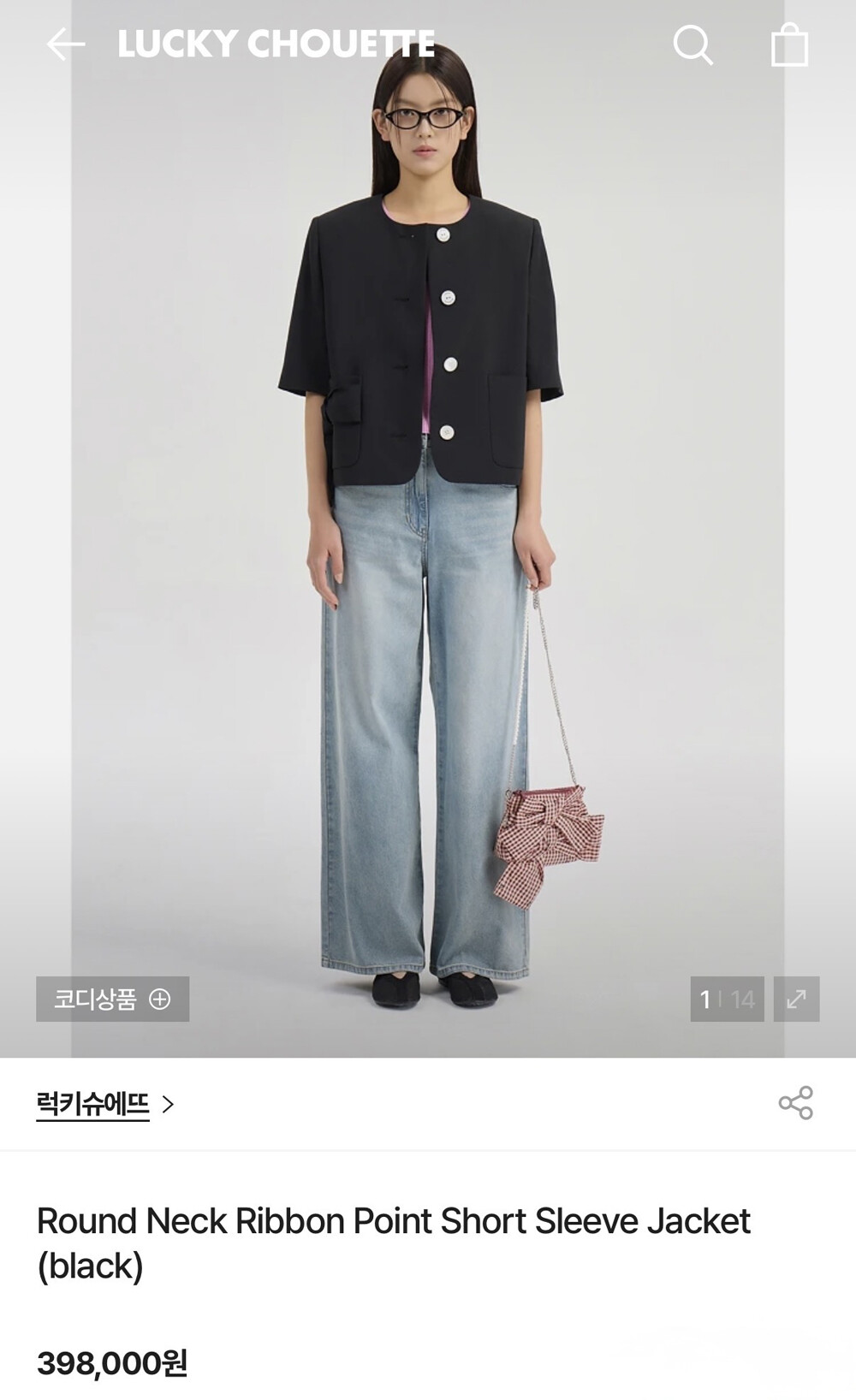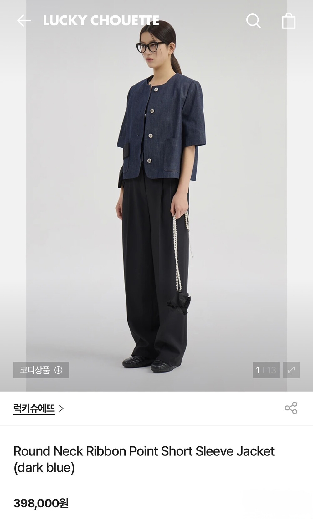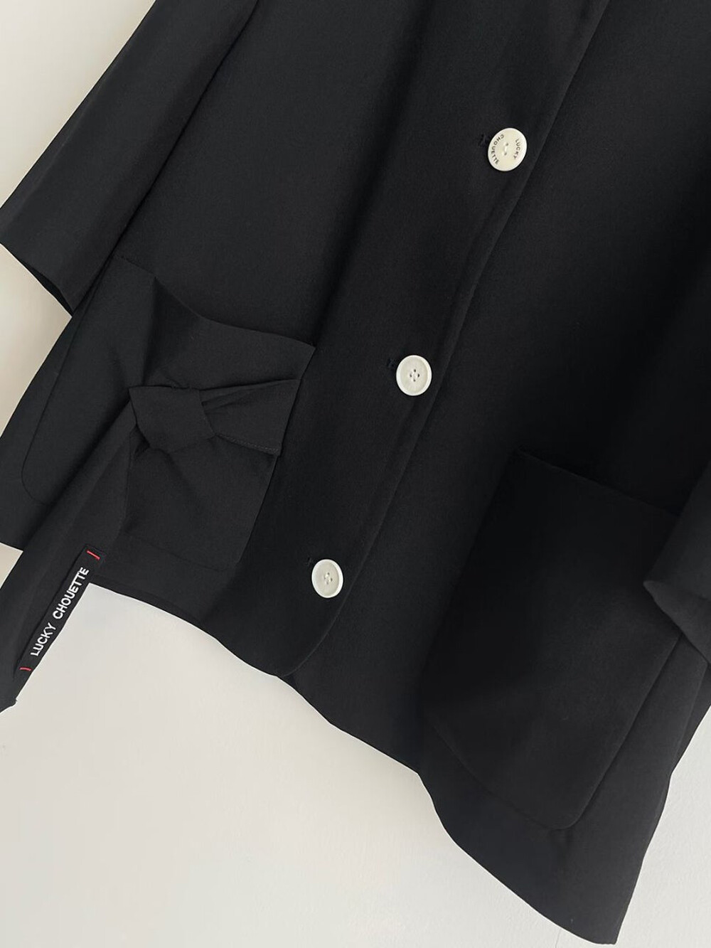 럭키슈에뜨 라운드 넥 리본 포인트 반팔 재킷