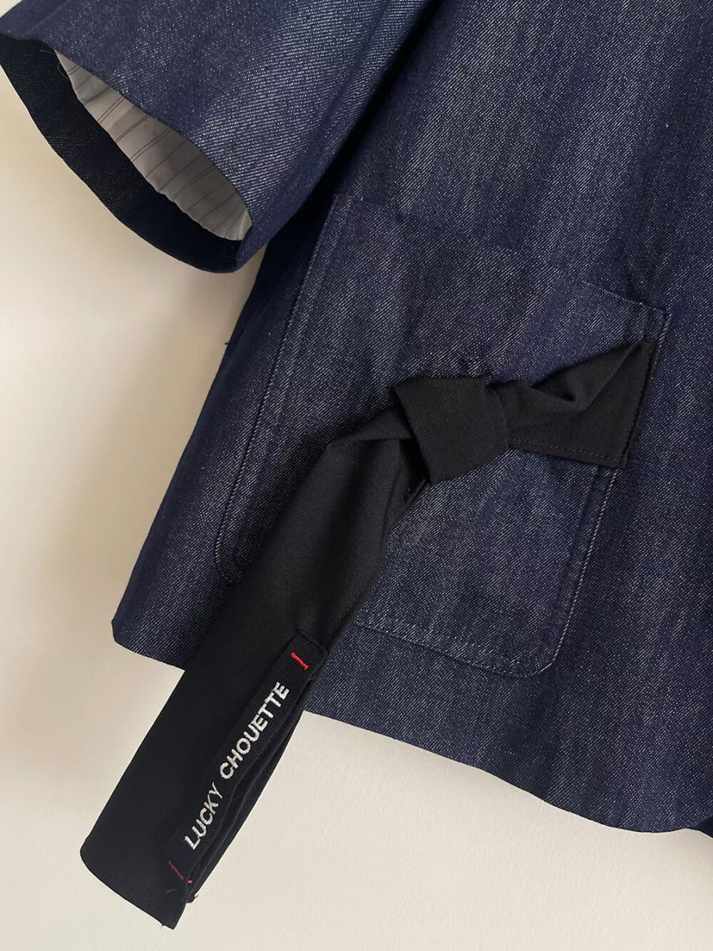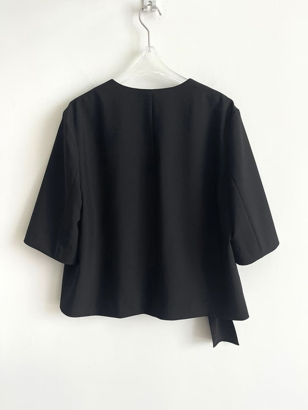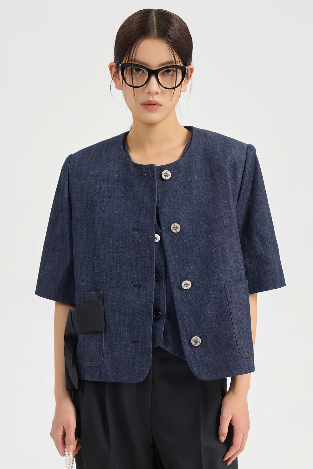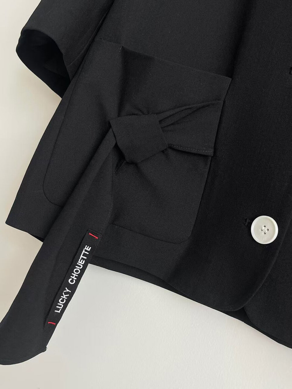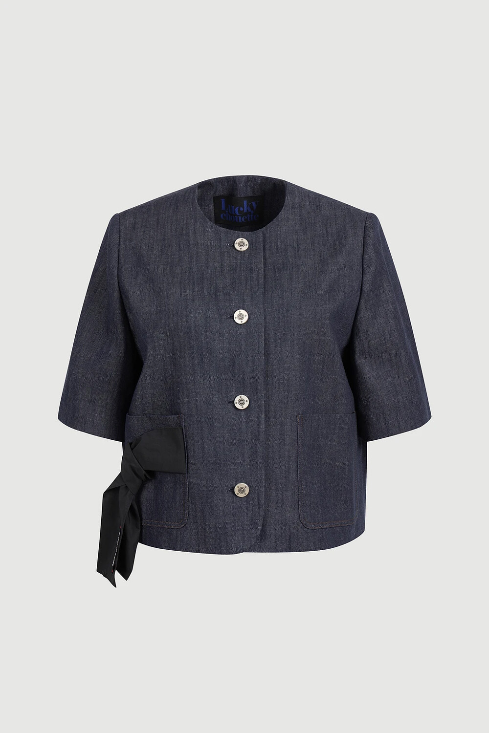 LUCKY CHOUETTE. Round Neck Ribbon Point Short Sleeve Jacket