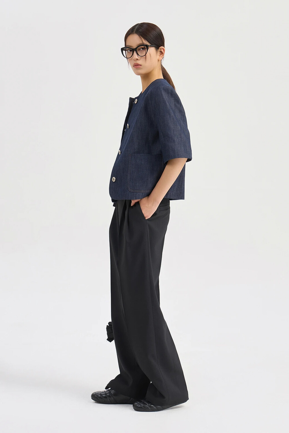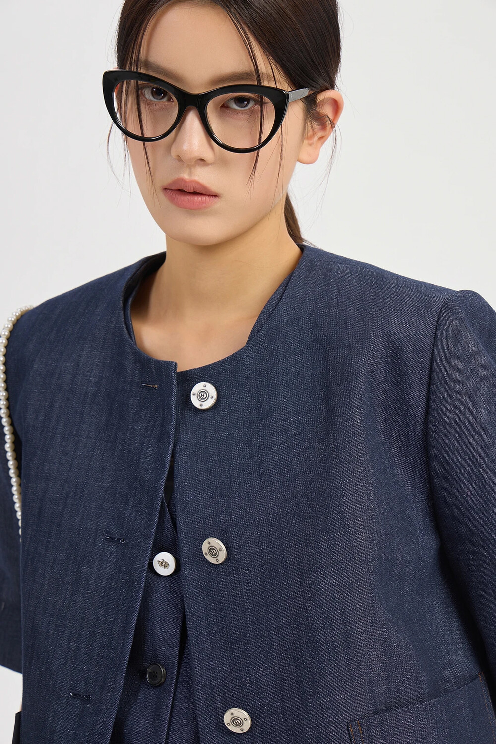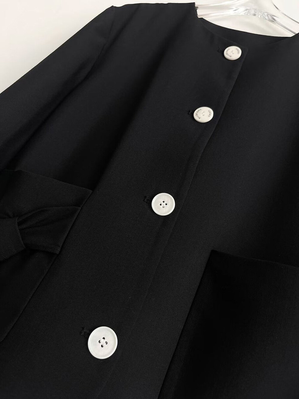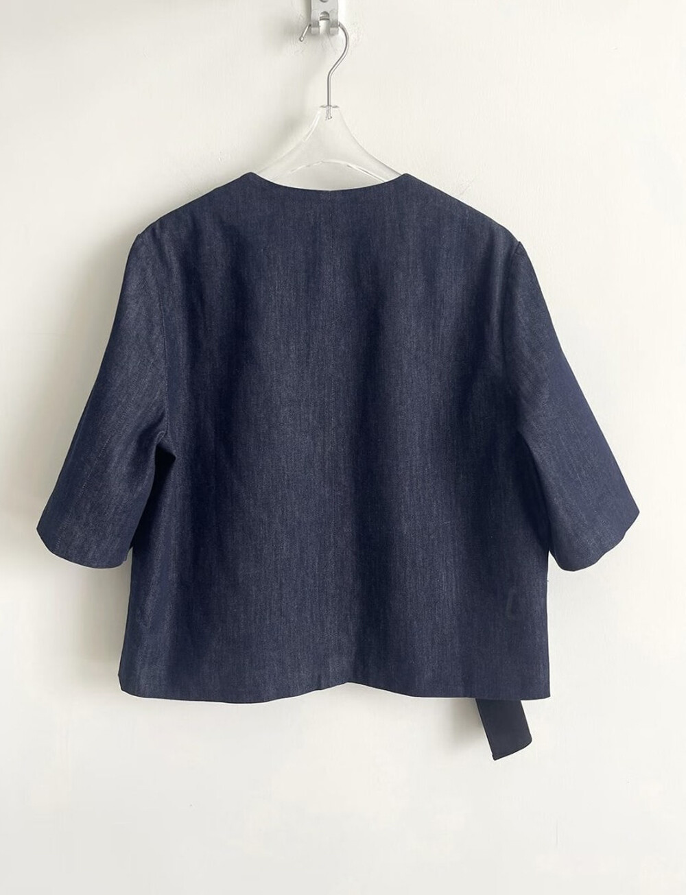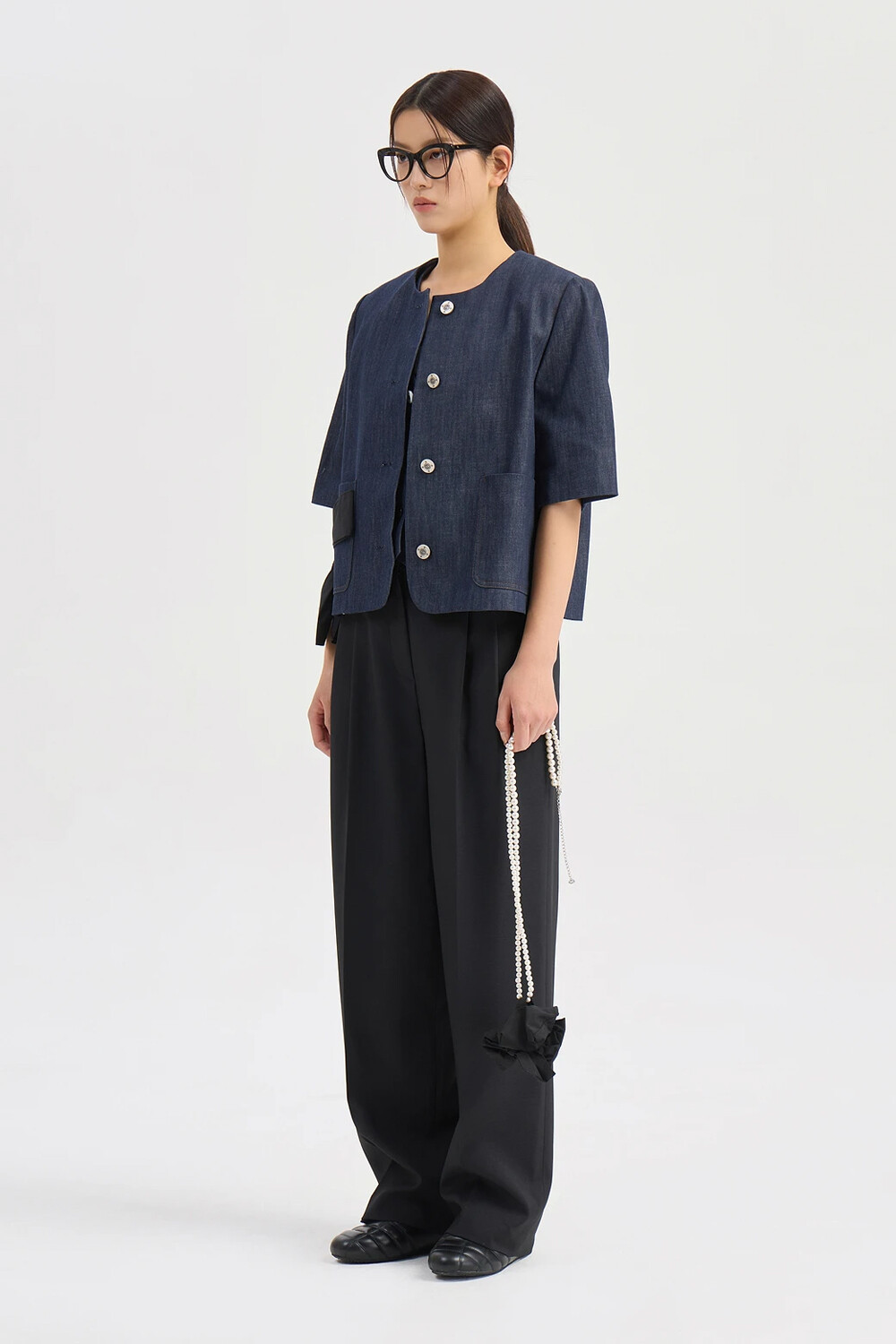 LUCKY CHOUETTE. Round Neck Ribbon Point Short Sleeve Jacket