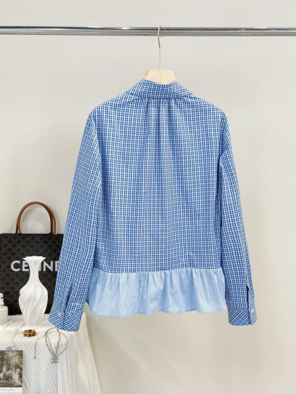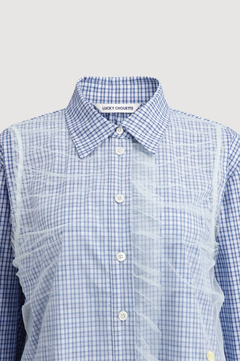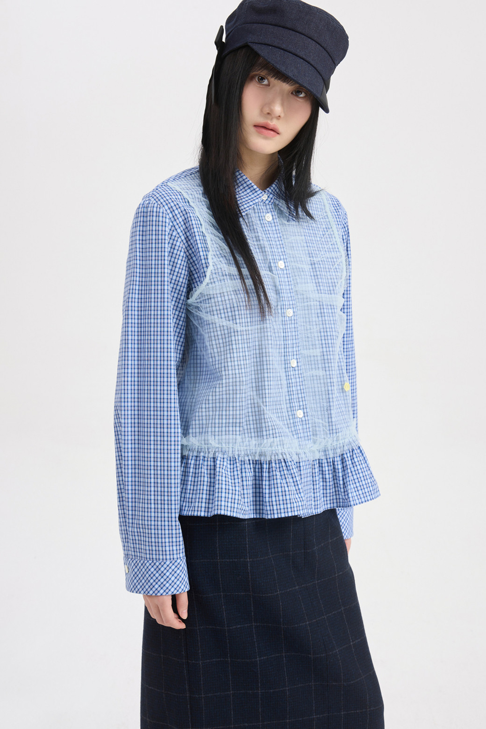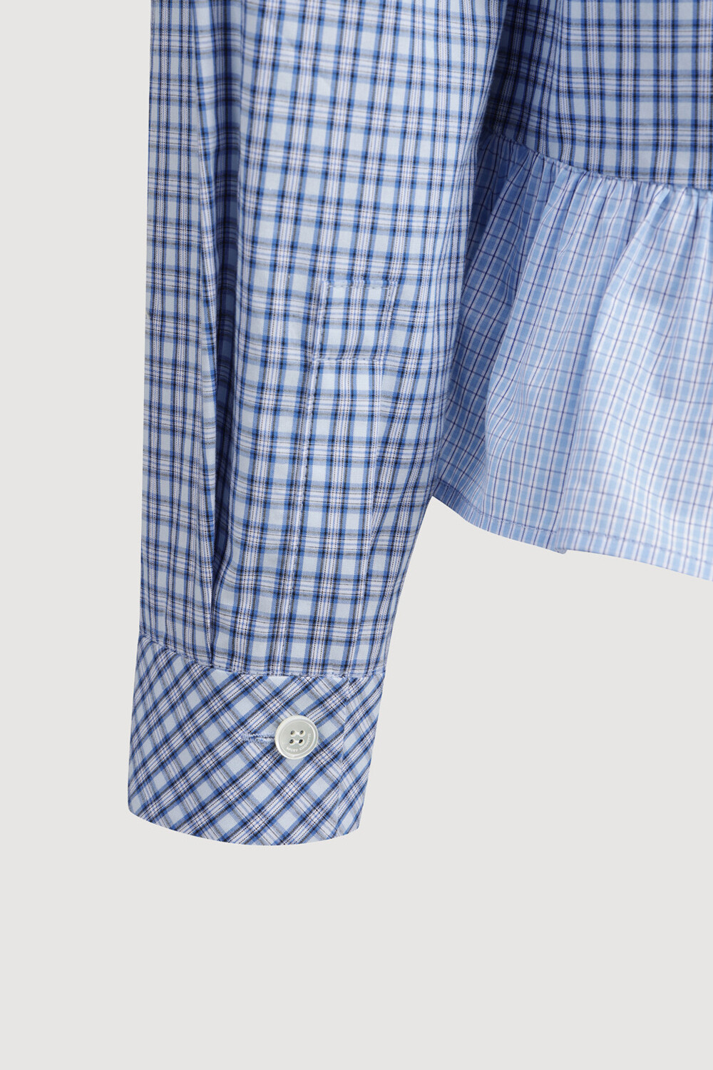 - 코튼 100%의 블루 잔체크 패턴 소재와 메시 소재를 믹스해 제작.