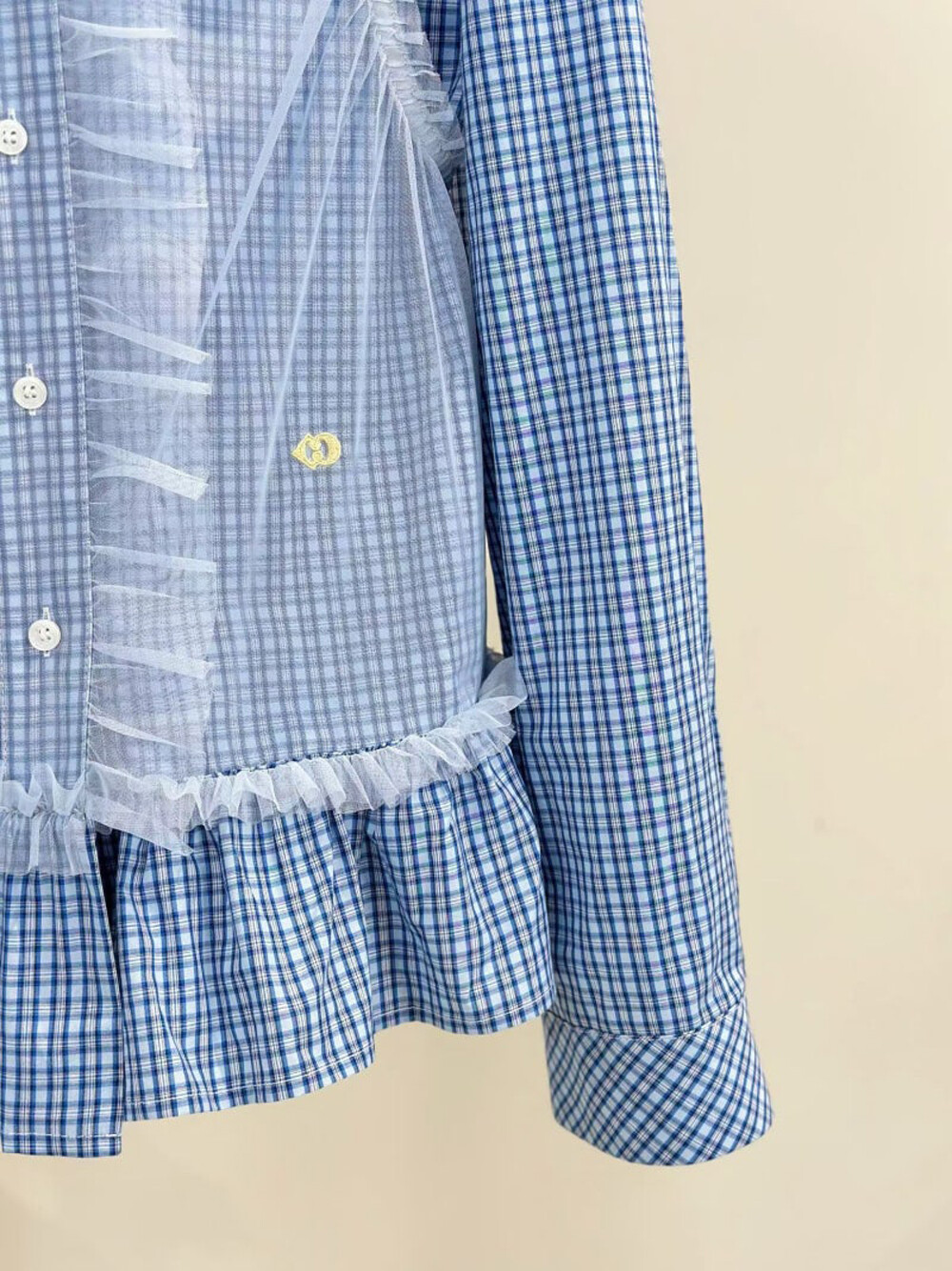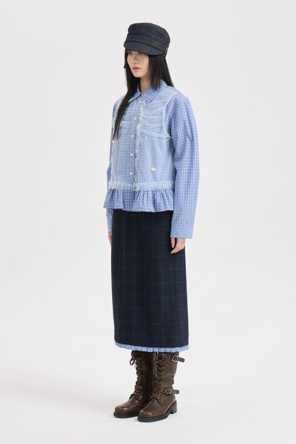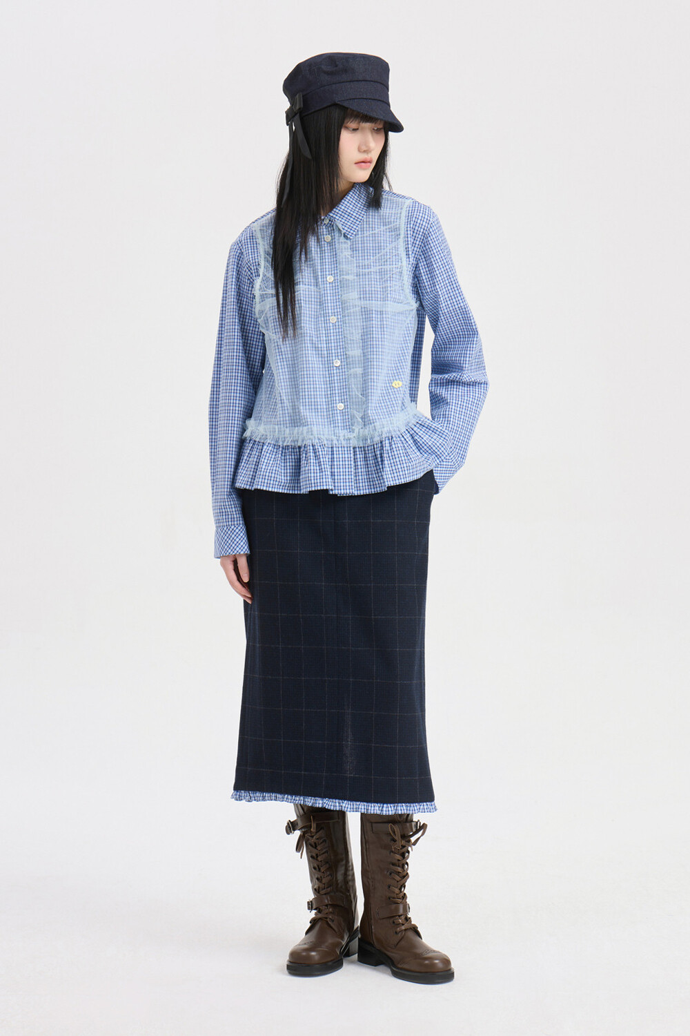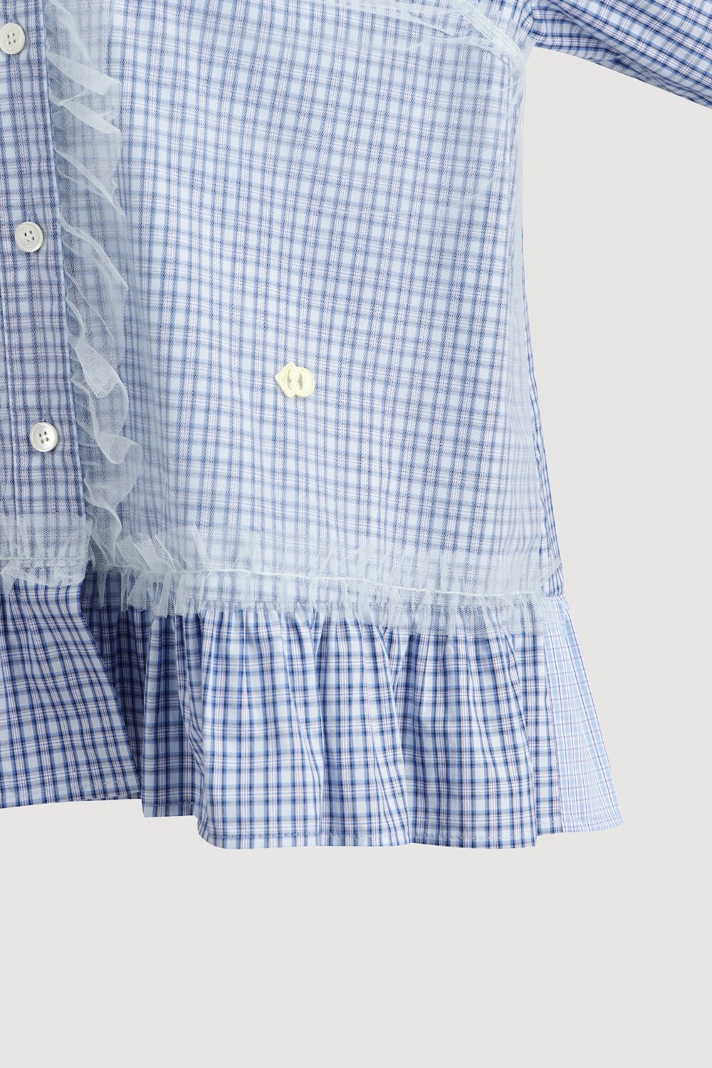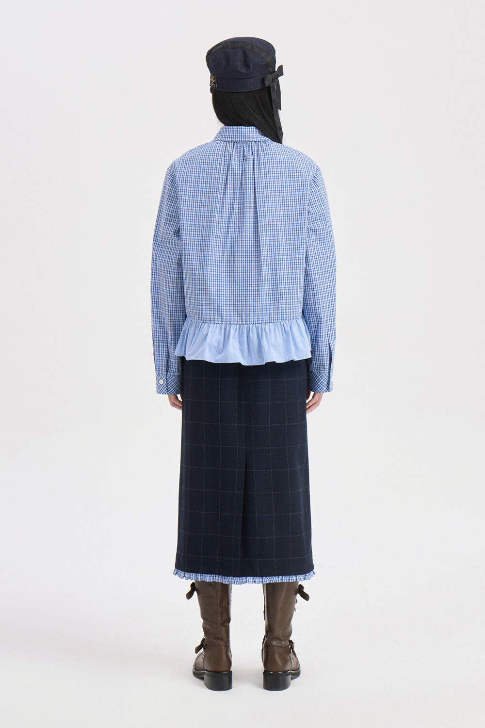 - 코튼 100%의 블루 잔체크 패턴 소재와 메시 소재를 믹스해 제작.